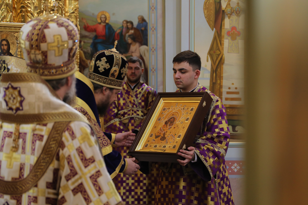По окончании богослужения Его Высокопреосвященство в память о совместной молитве в Кафедральном соборе Рождества Христова города Волгодонска преподнес епископу Антонию в дар икону Божией Матери «Донская».