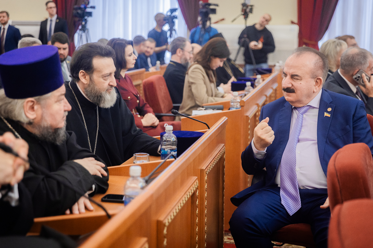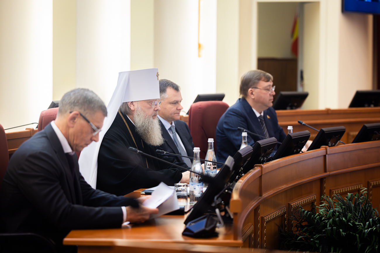 В президиуме заседания присутствовали Губернатор Ростовской области Юрий Слюсарь, Глава Донской митрополии митрополит Ростовский и Новочеркасский Меркурий, заместитель полномочного представителя Президента РФ в ЮФО Антон Калинин и председатель Законодательного Собрания области Александр Ищенко, выступивший модератором встречи.