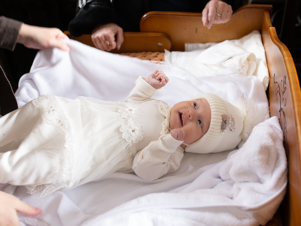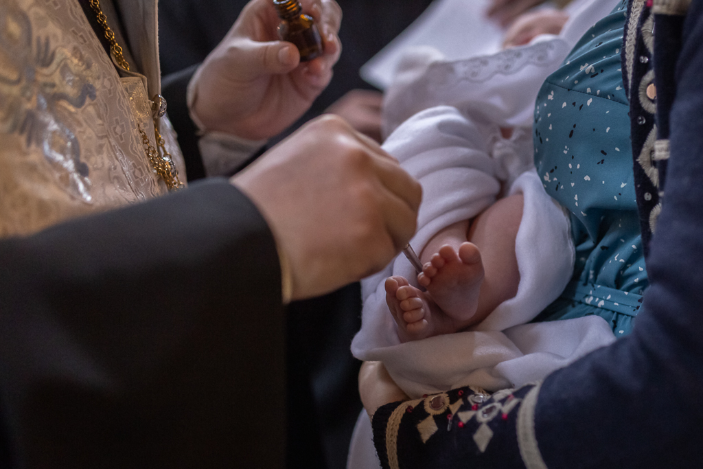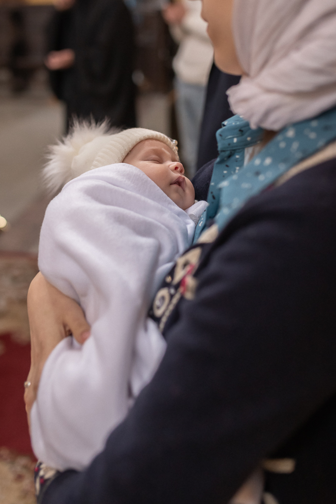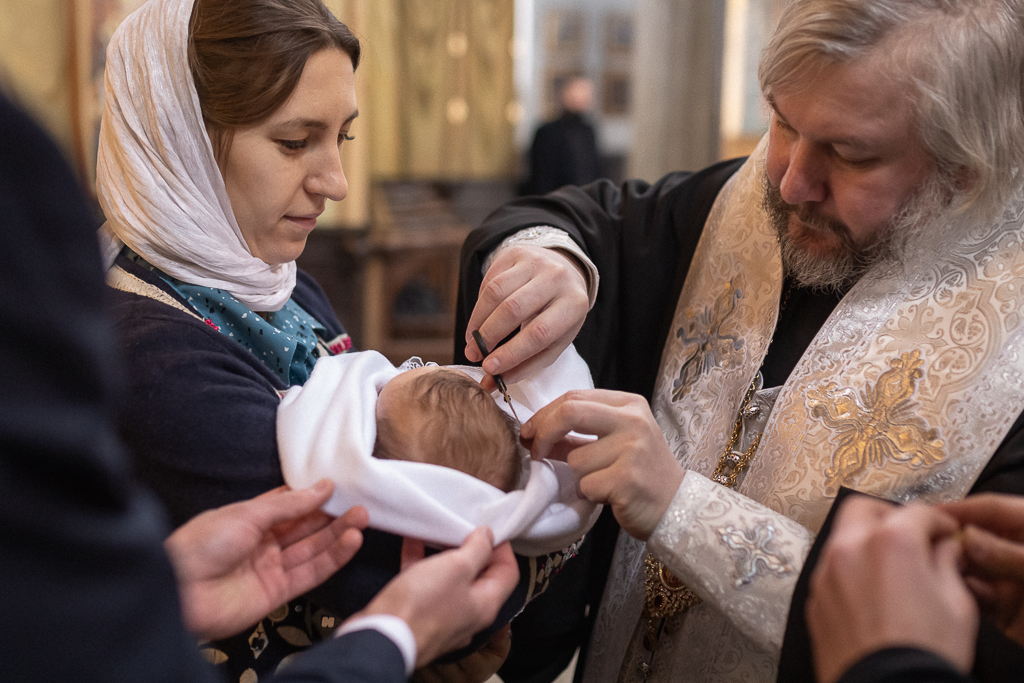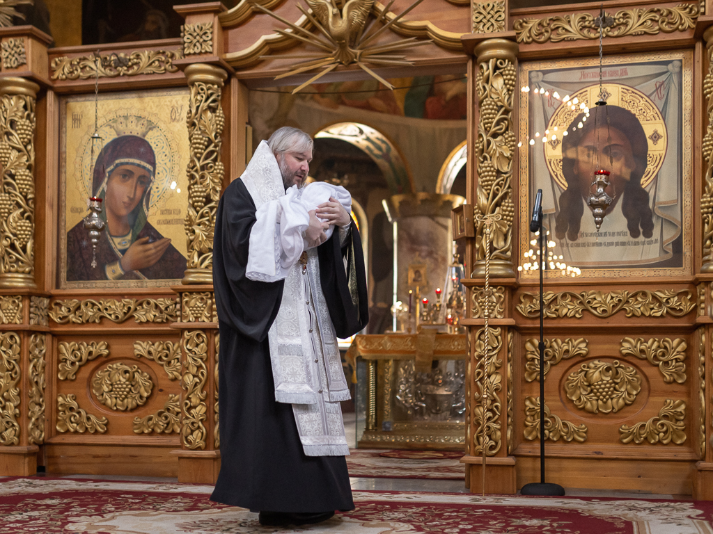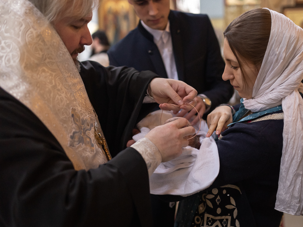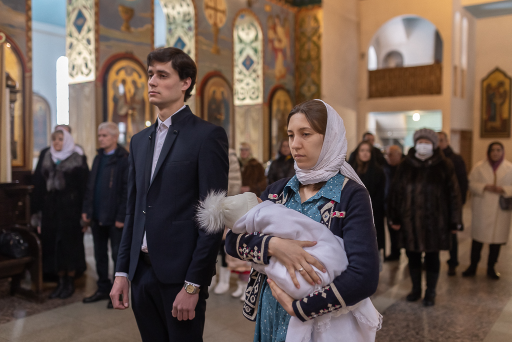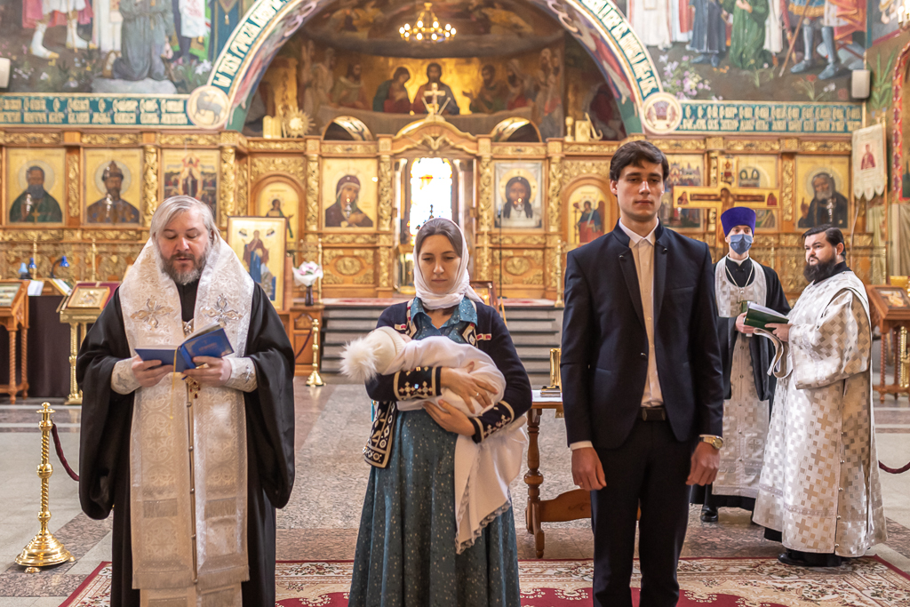 В вместе с архиереем молились родители, крестные родители младенца и родственники.