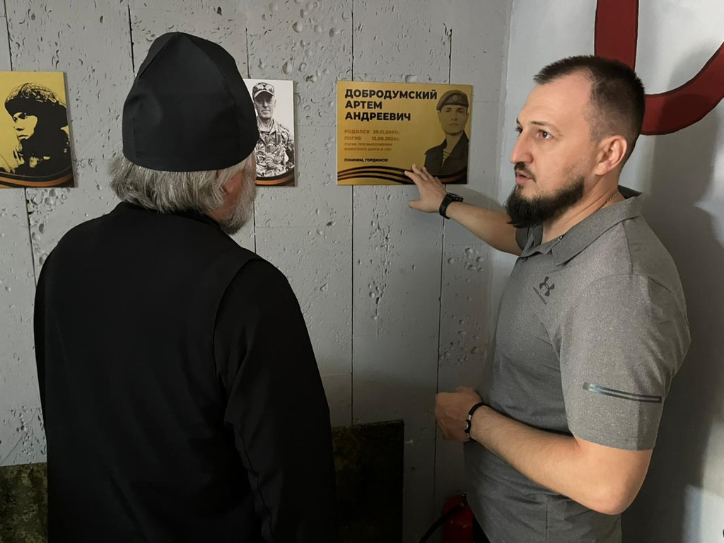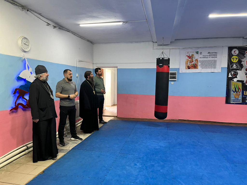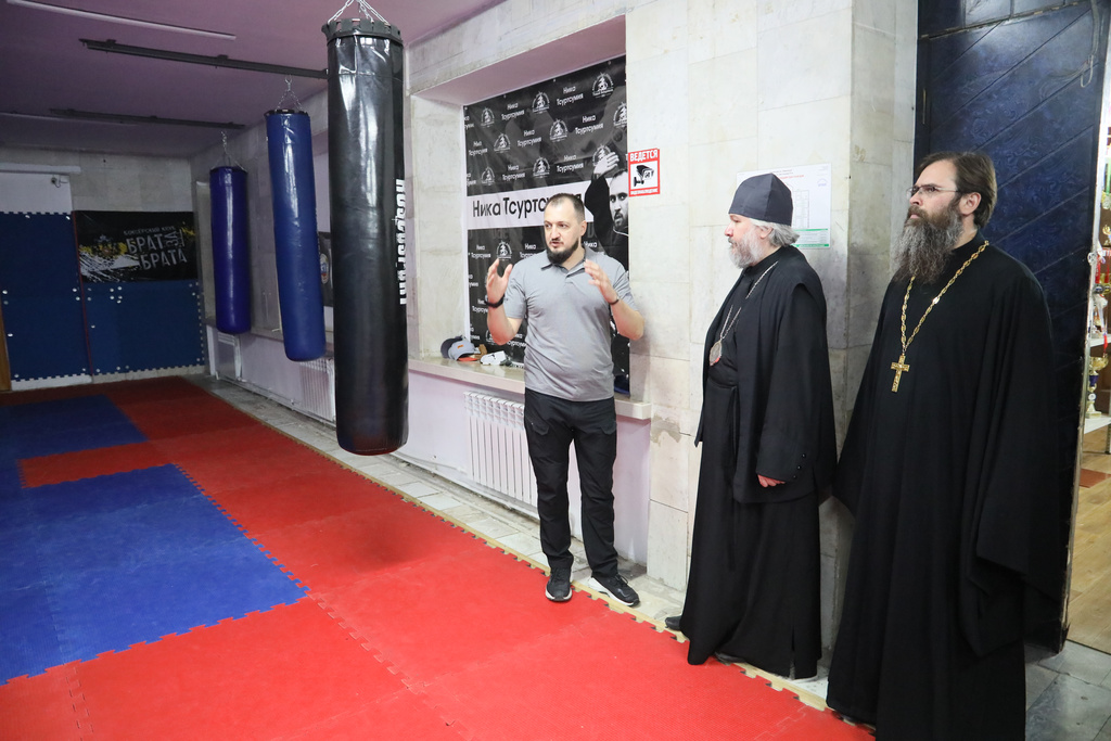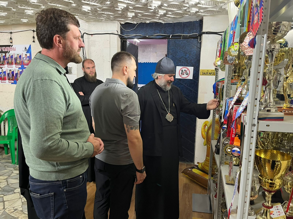 Епископ Симон посетил спортивный зал общества, где Я.Ю. Стуров провел экскурсию, подробно рассказав о тренировочном процессе и достижениях воспитанников. Особое внимание было уделено историям спортсменов, проявивших героизм в зоне СВО.
