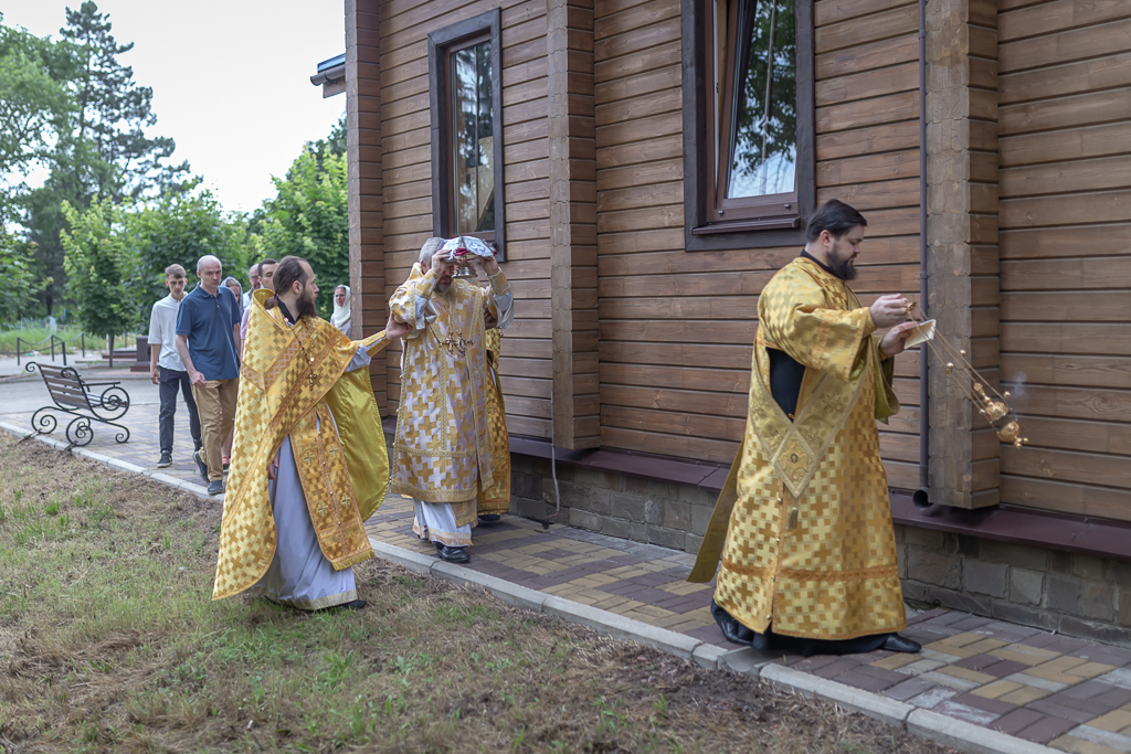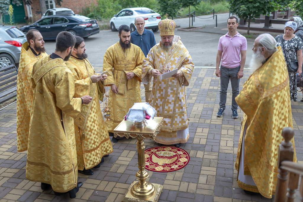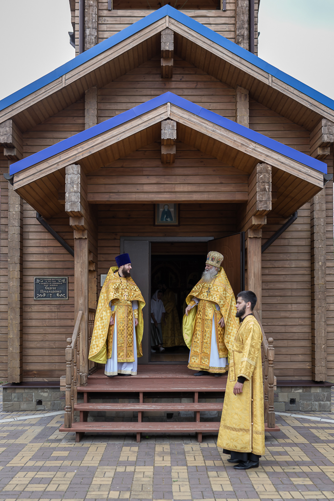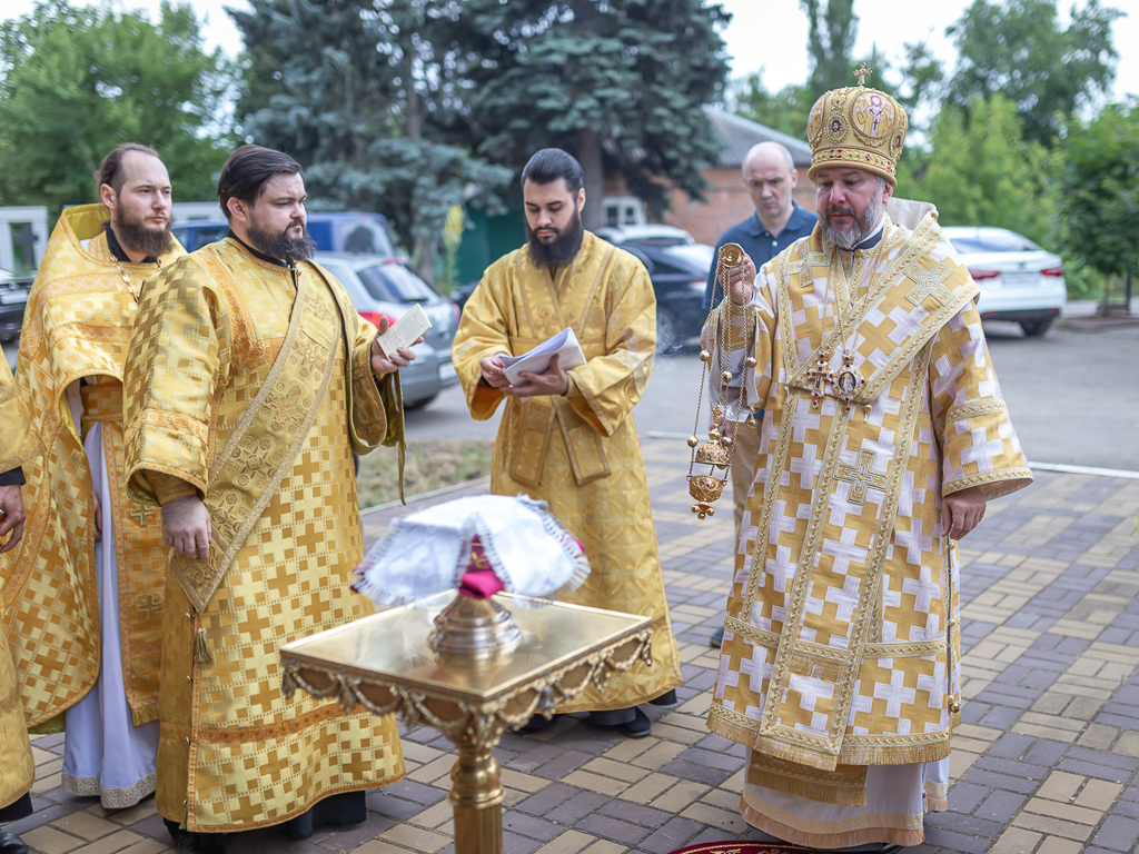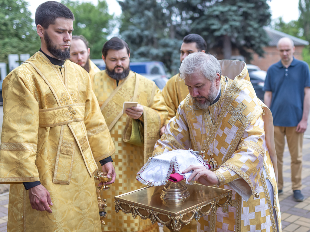 После чина освящения Преосвященнейший епископ Симон совершил Божественную литургию. Архиерею сослужили духовник Шахтинской епархии протоиерей Александр Минин, клирики Покровского кафедрального собора города Шахты иерей Олег Брехов и диакон Трофим Осяк.