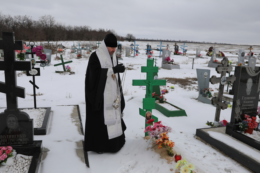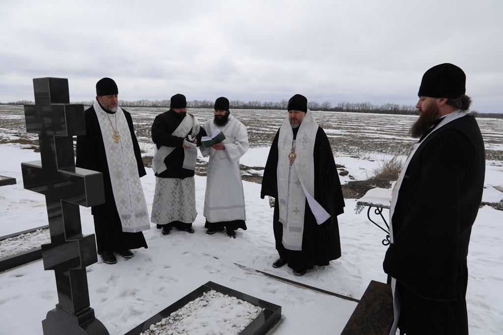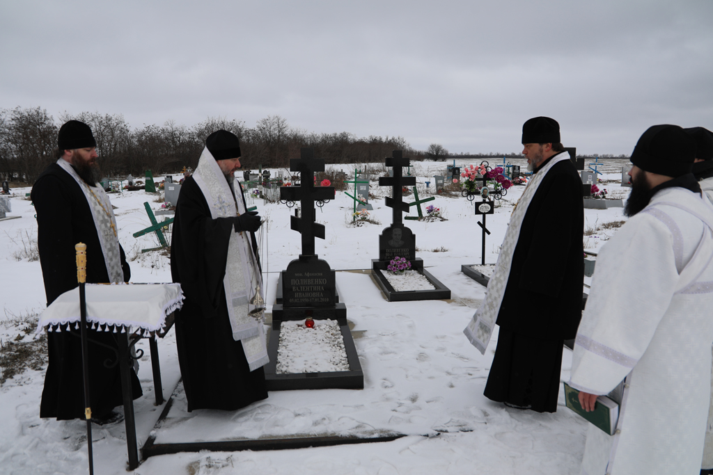 На кладбище Первомайского сельского поселения Миллеровского района епископ Шахтинский и Миллеровский Симон совершил заупокойную литию по монахине Афанасии и монахине Серафиме, многолетним труженицам храма великомученика Пантелеимона города Миллерово.