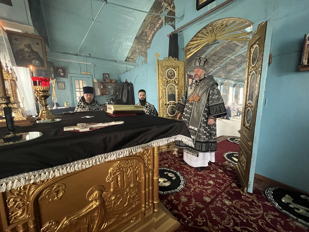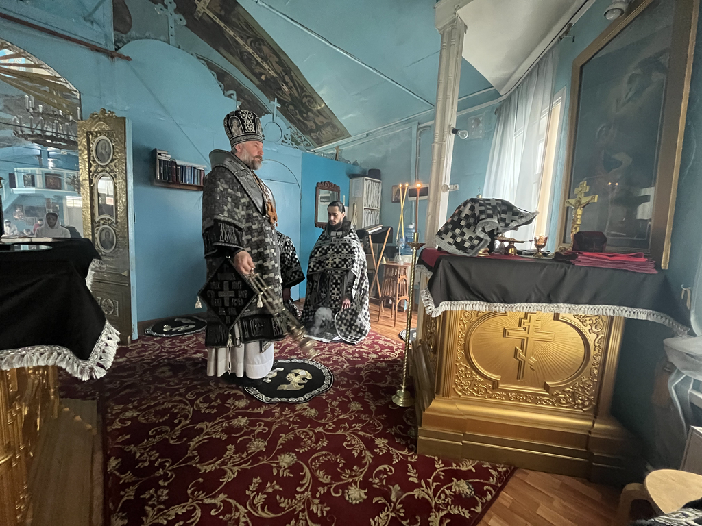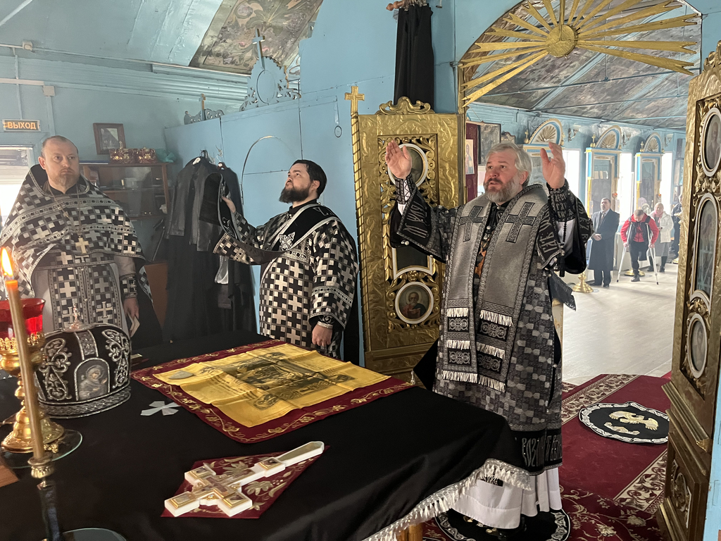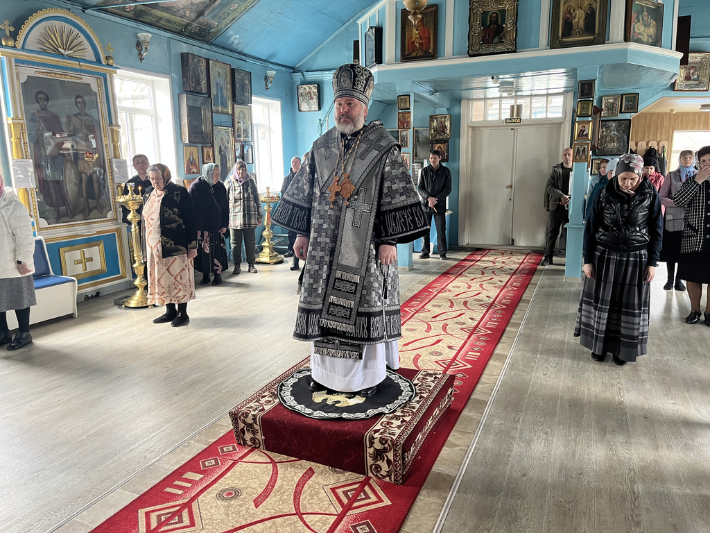 За богослужением было совершено поклонение кресту, положенному на средине храма, после чего, по уставу Крестопоклонной седмицы Великого поста, крест был занесен в алтарь.