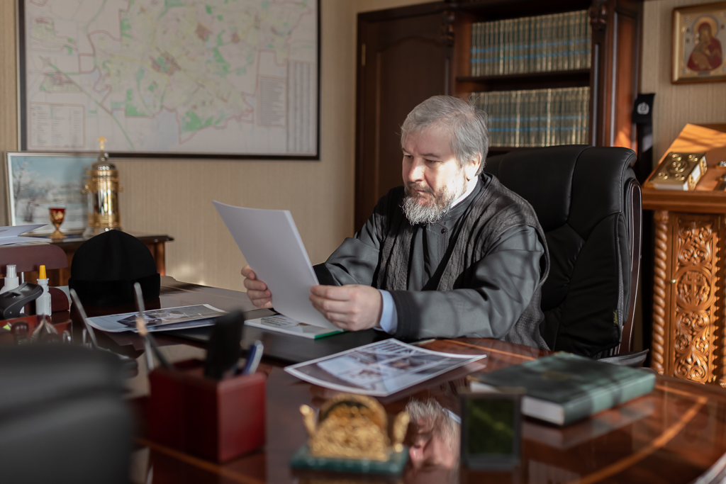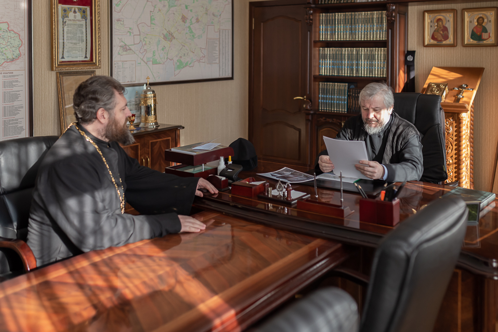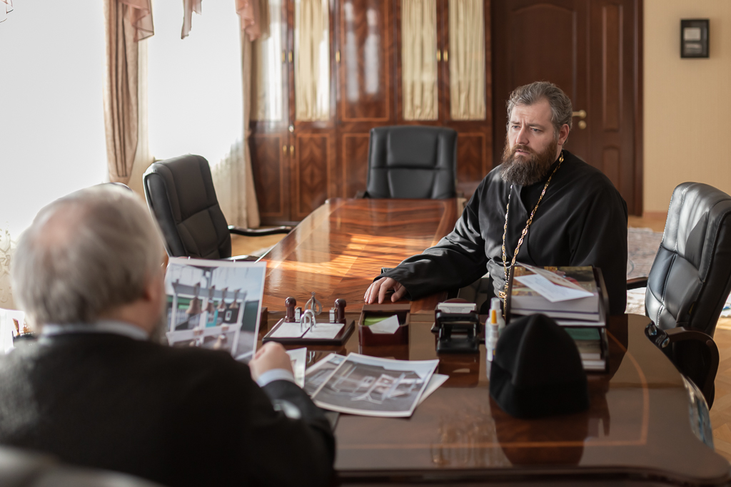 В Епархиальном управлении города Шахты состоялась рабочая встреча епископа Шахтинского и Миллеровского Симона с настоятелем храма праведного Иоанна Кронштадтского города Шахты иереем Алексием Скосаревым, посвященная вопросам дальнейшего строительства на храмовом подворье.