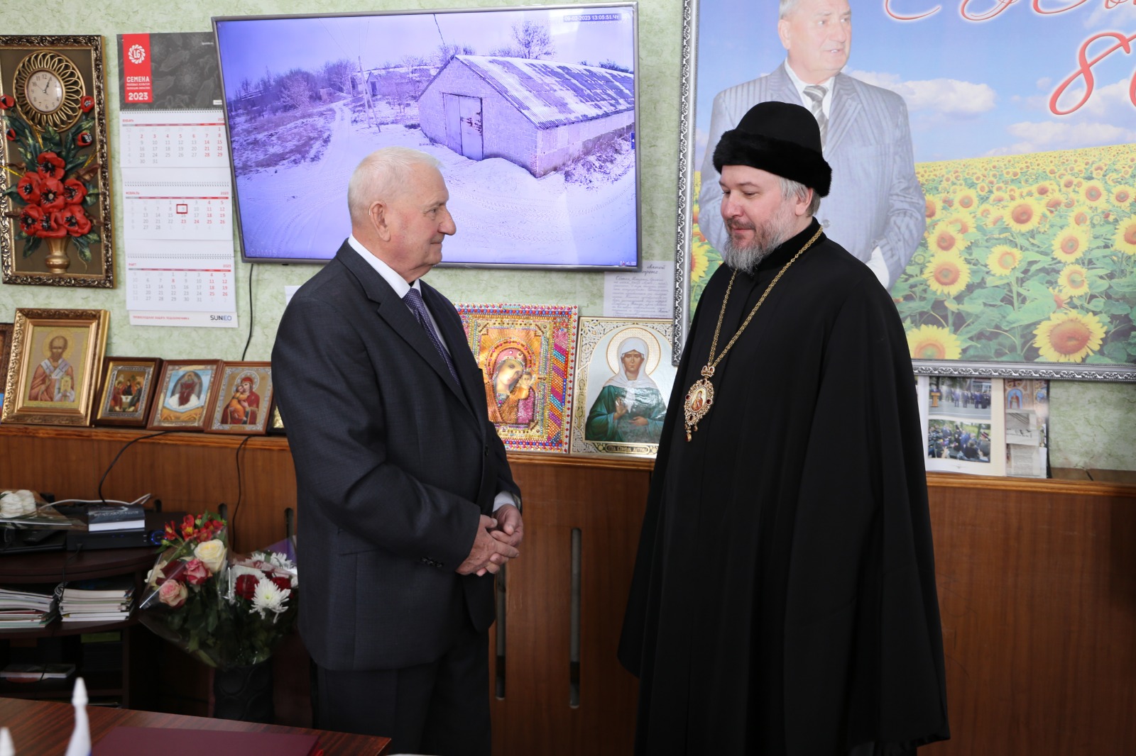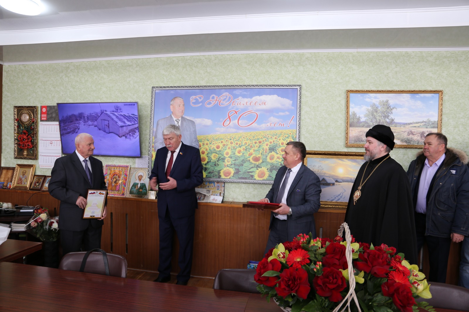 Ивана Петровича прибыли поздравить заместитель председателя Законодательного Собрания Ростовской области – председатель комитета по аграрной политике, природопользованию, земельным отношениям и делам казачества Вячеслав Николаевич Василенко, епископ Шахтинский и Миллеровский Симон и глава Администрации Кашарского района Иван Михайлович Фалынсков.