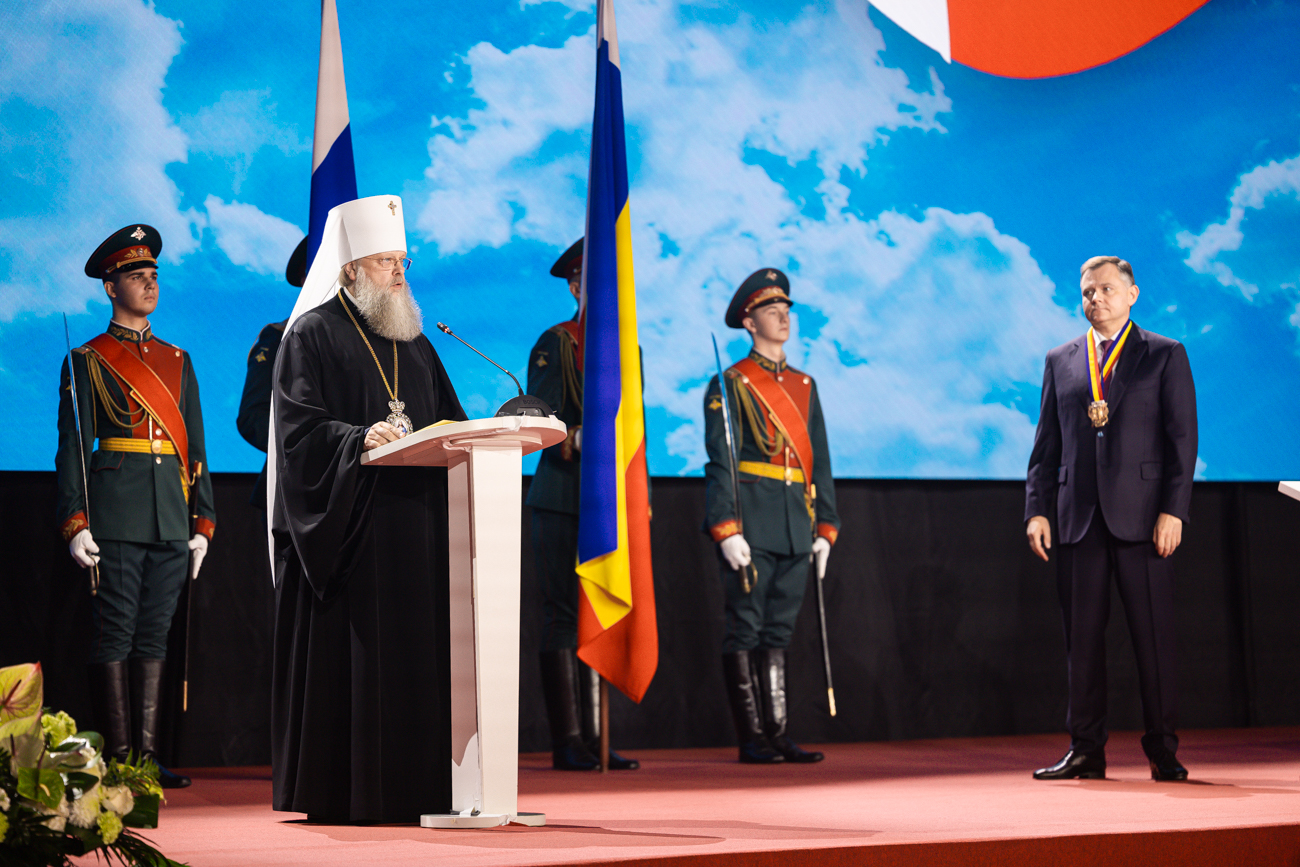 Митрополит Ростовский и Новочеркасский Меркурий огласил поздравление Святейшего Патриарха Московского и всея Руси Кирилла избранному Губернатору Ростовской области, в котором отмечалась особая роль Юрия Слюсаря в укреплении социального партнерства между Церковью и государством.
