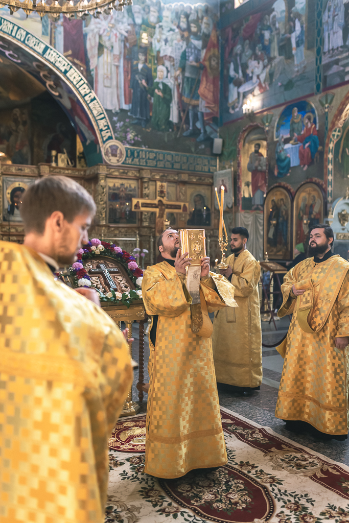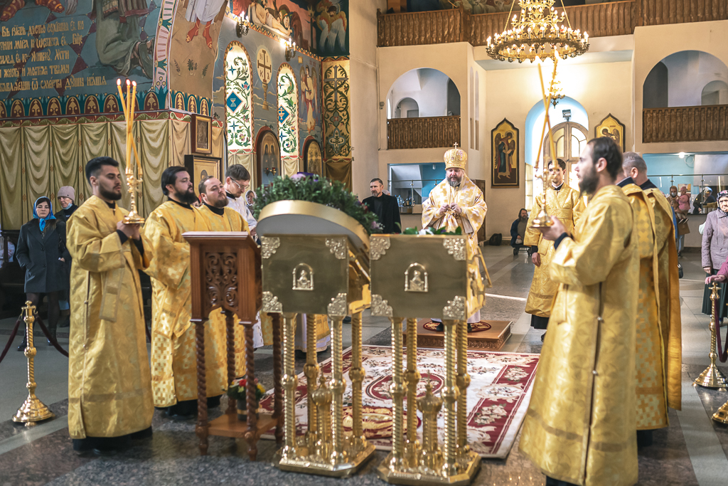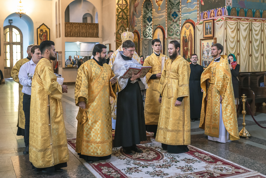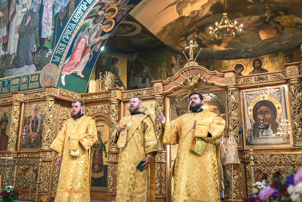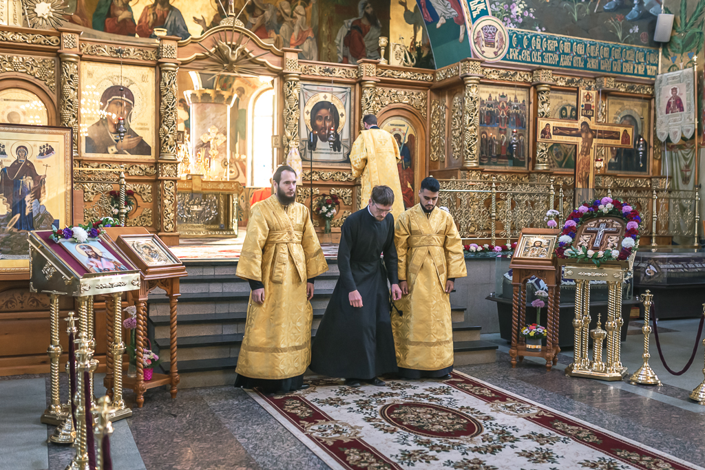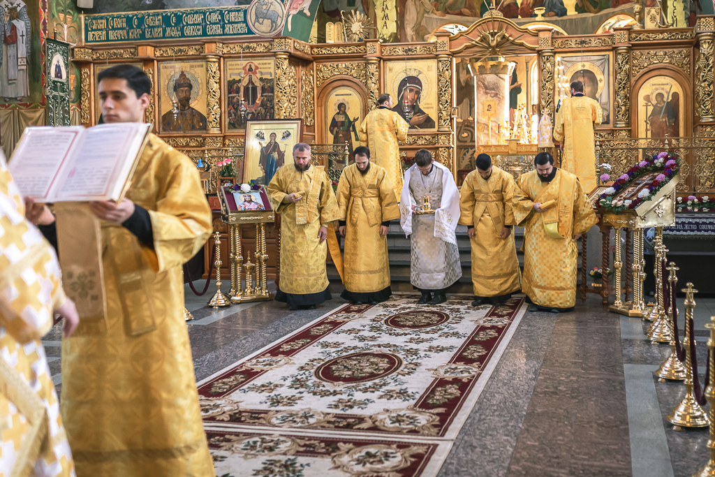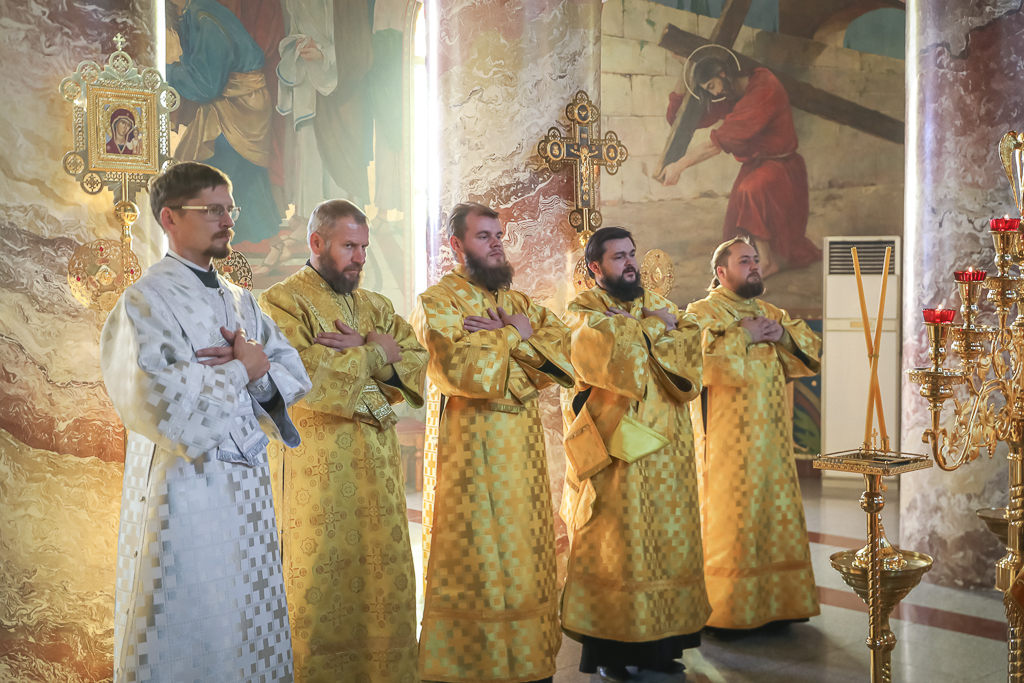 Его Преосвященству сослужили настоятель собора иерей Александр Теличкин, иерей Даниил Зырянов, диакон Трофим Осяк, диакон Никита Осипов, диакон Андрей Яненко, диакон Алексий Дмитриенко.