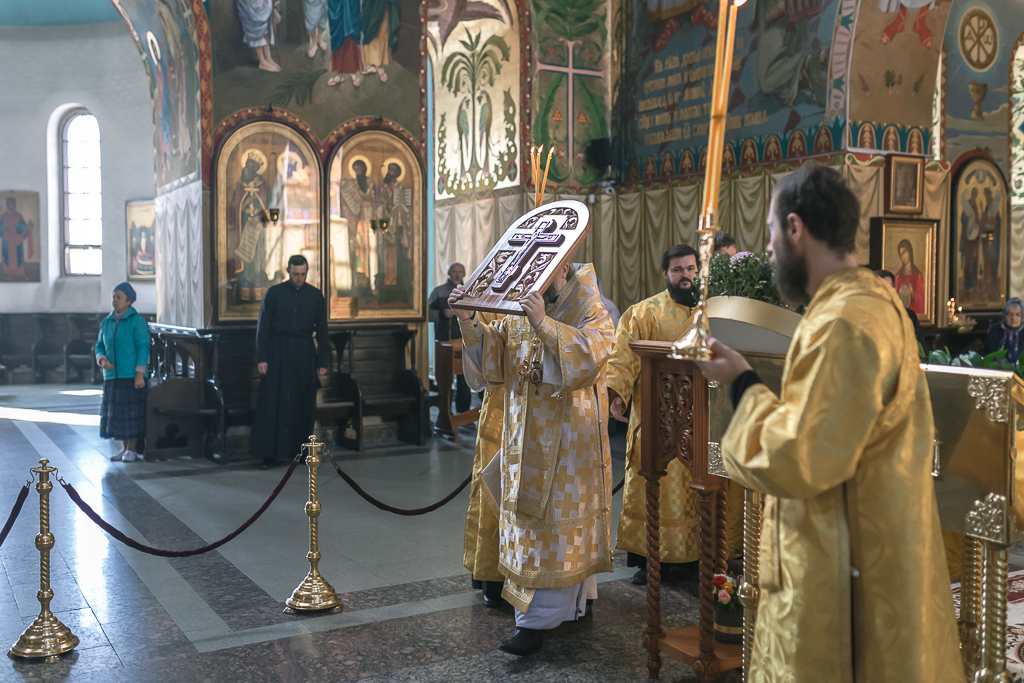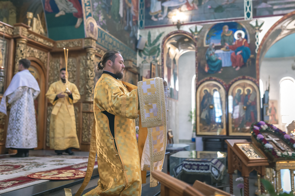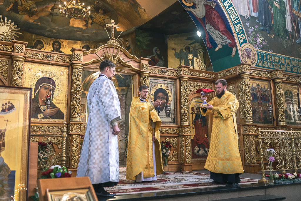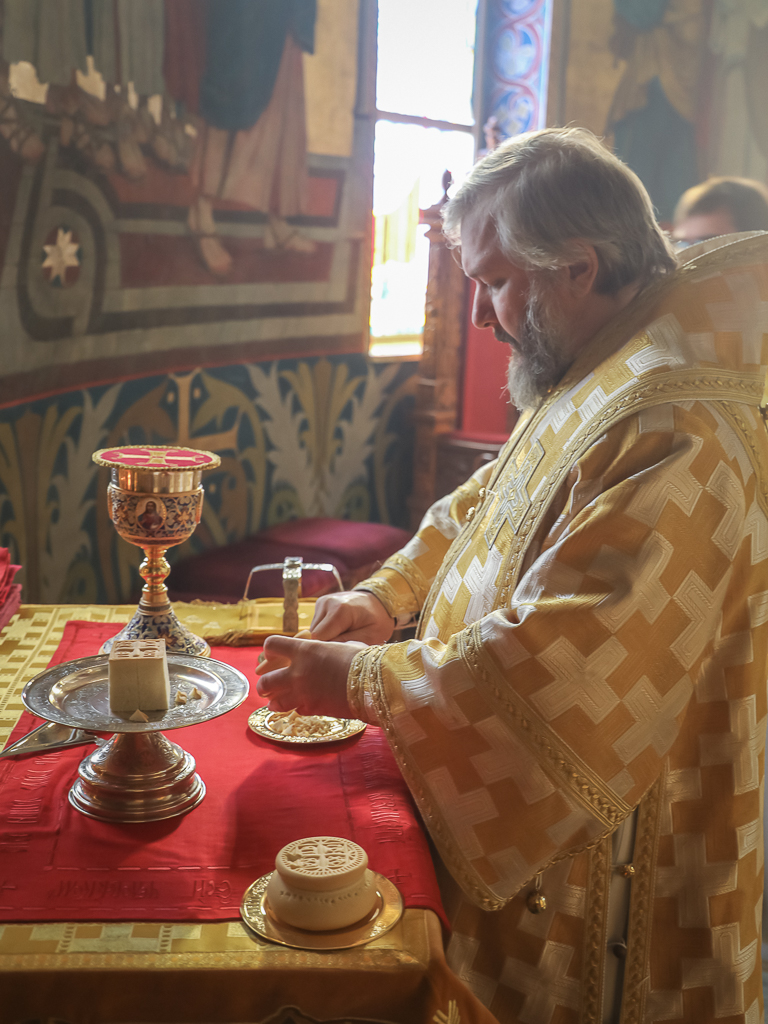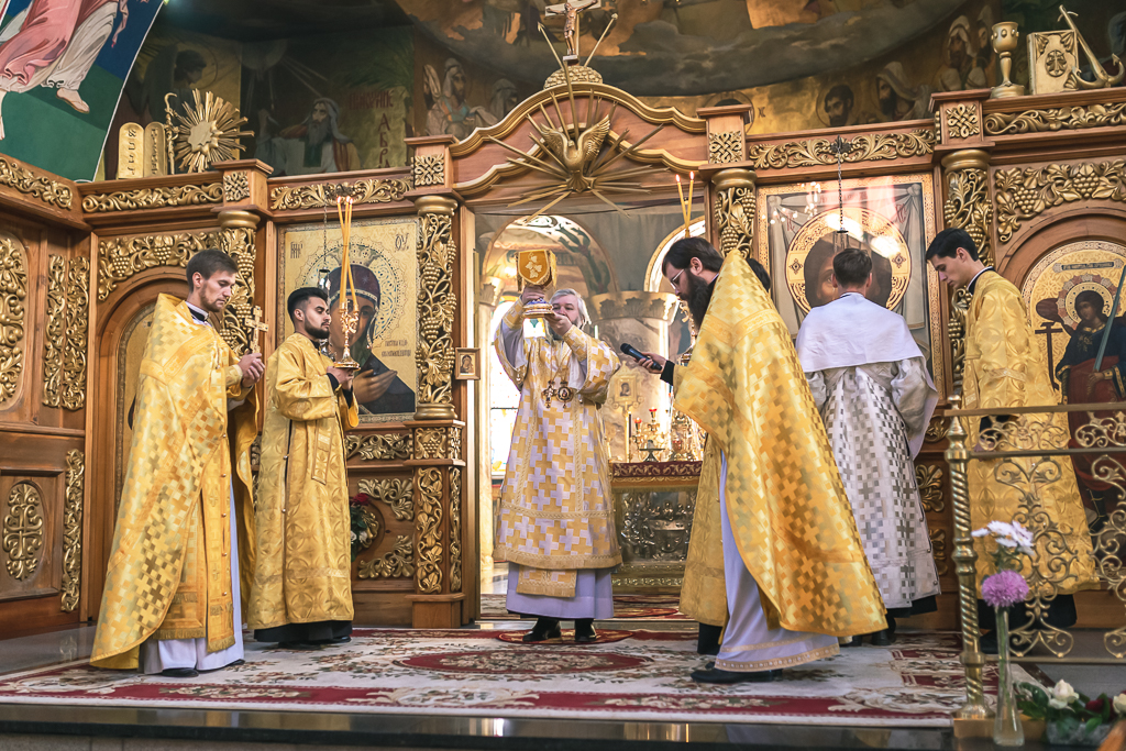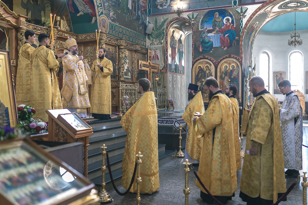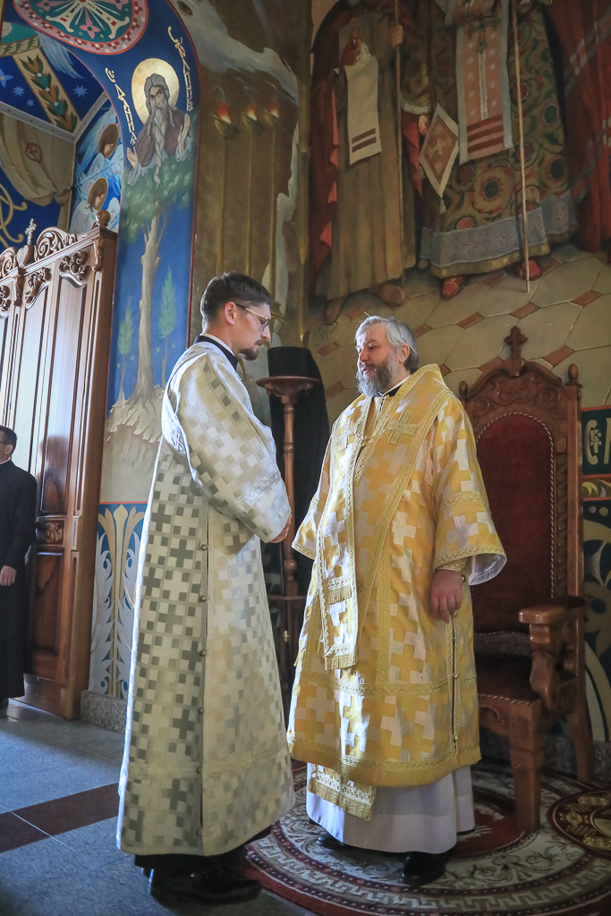 Его Преосвященству сослужили настоятель собора иерей Александр Теличкин, иерей Даниил Зырянов, диакон Трофим Осяк, диакон Никита Осипов, диакон Андрей Яненко, диакон Алексий Дмитриенко.