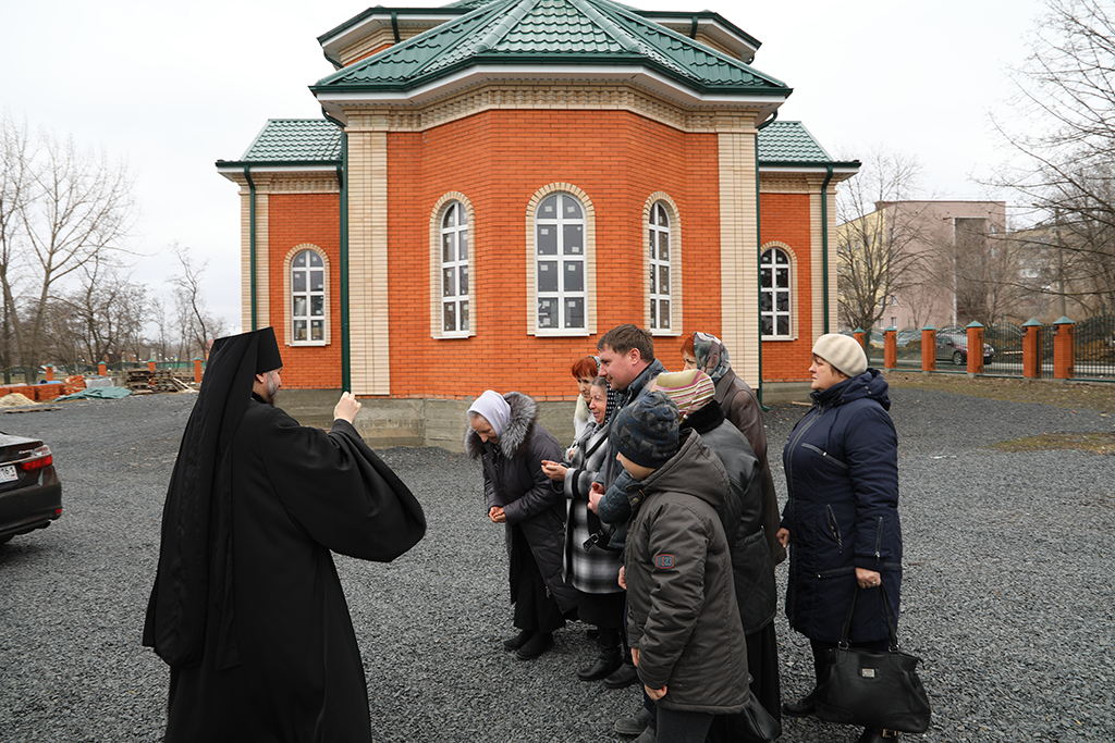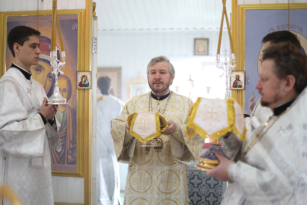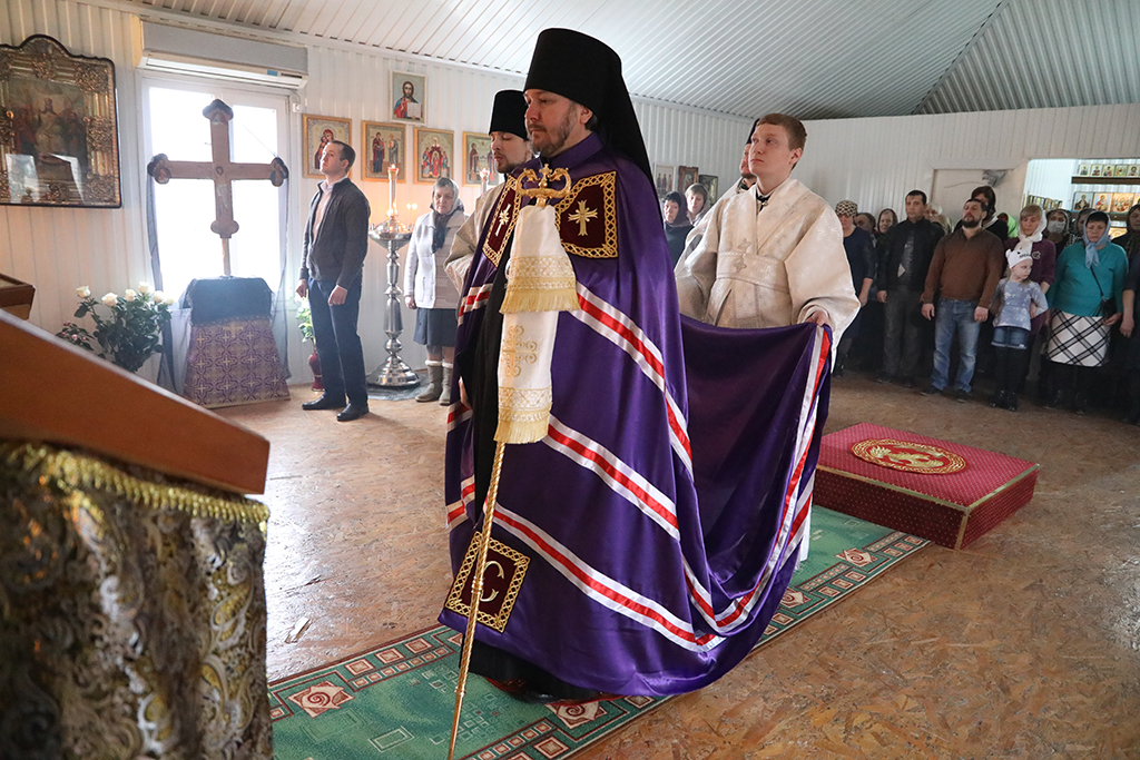 Его Преосвященству сослужили благочинный приходов Александровск-Грушевского округа протоиерей Владимир Иванов, настоятель храма иерей Георгий Болоцков, иеродиакон Флавиан (Васильев), диакон Андрей Иванов.