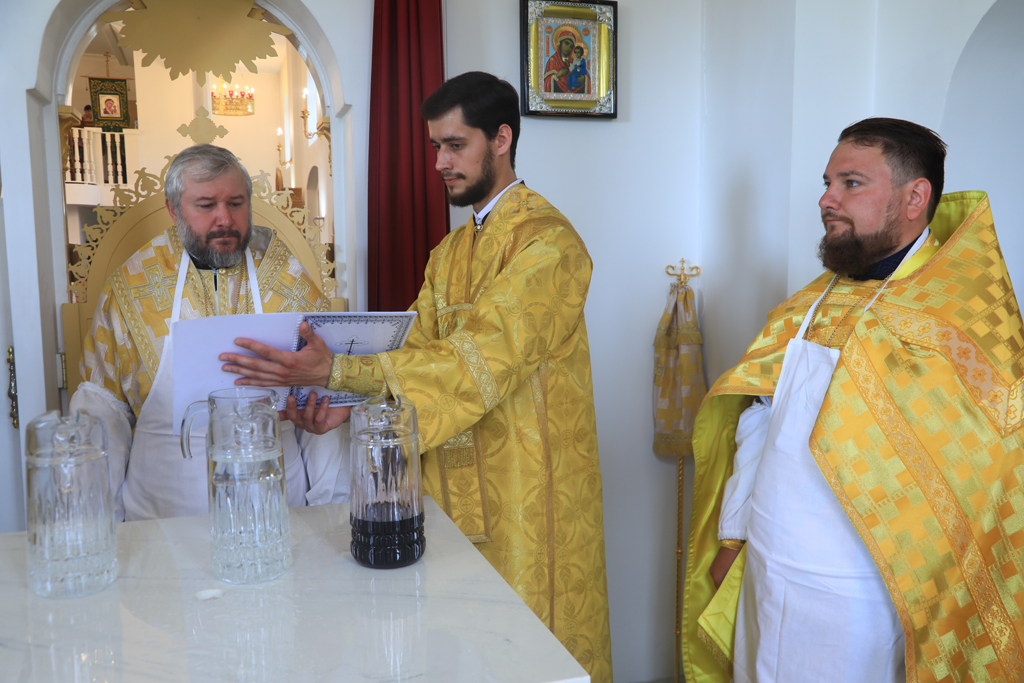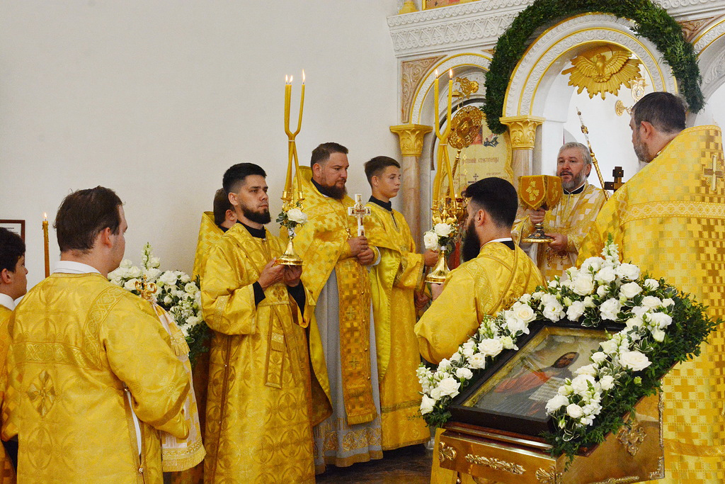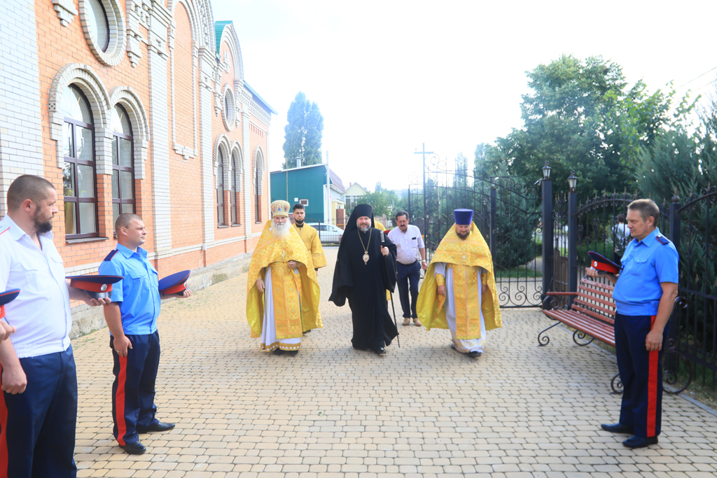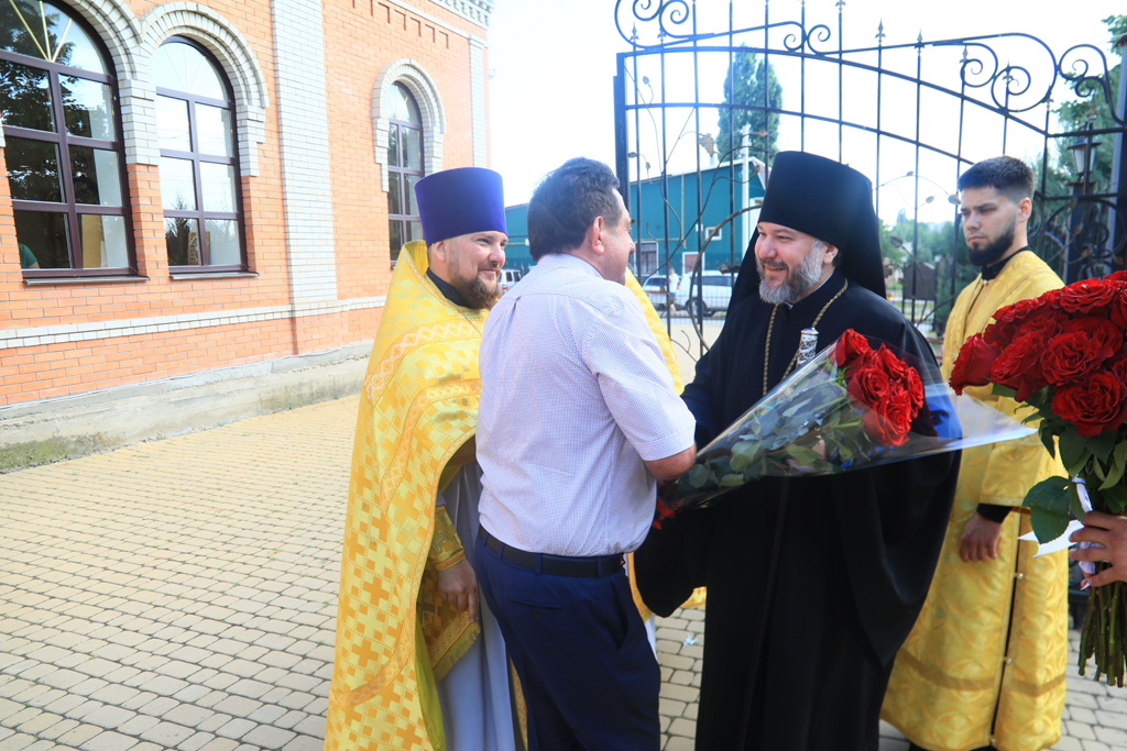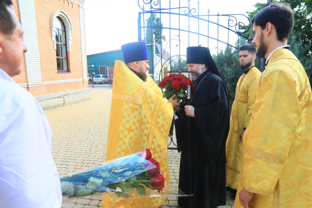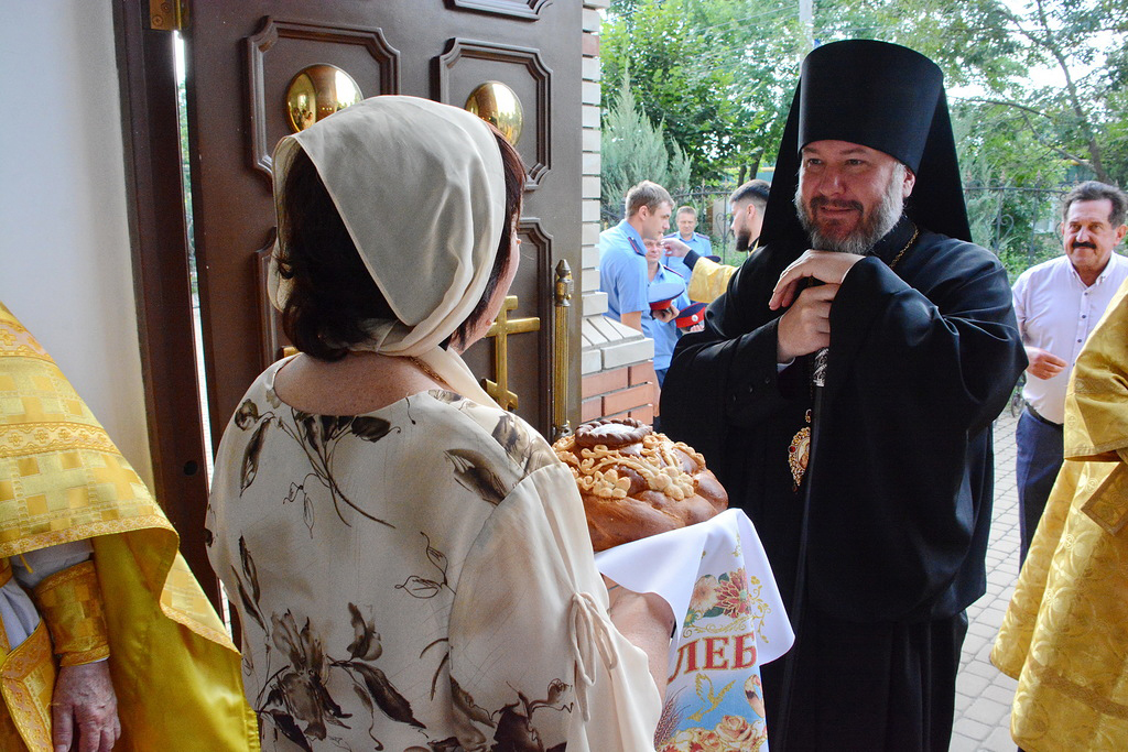 Архиерею сослужили духовник Шахтинской епархии протоиерей Александр Минин, настоятель Державного храма иерей Владимир Татаркин, настоятель храма в честь образа Пресвятой Богородицы Одигитрия пос. Таловый иерей Андрей Ковалев, настоятель храма Успения Пресвятой Богородицы ст. Калитвенской иерей Игорь Лосев, диакон Трофим Осяк.