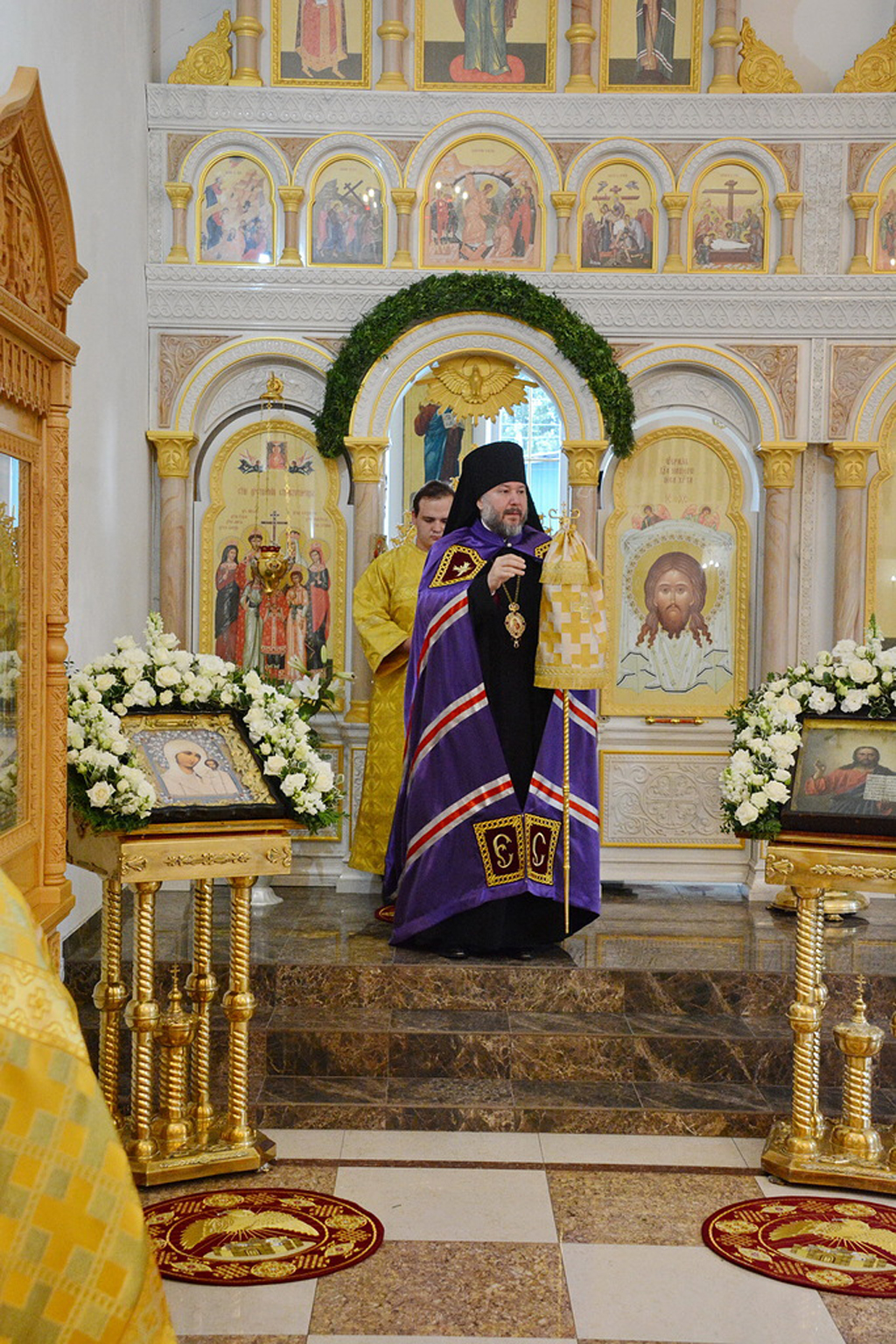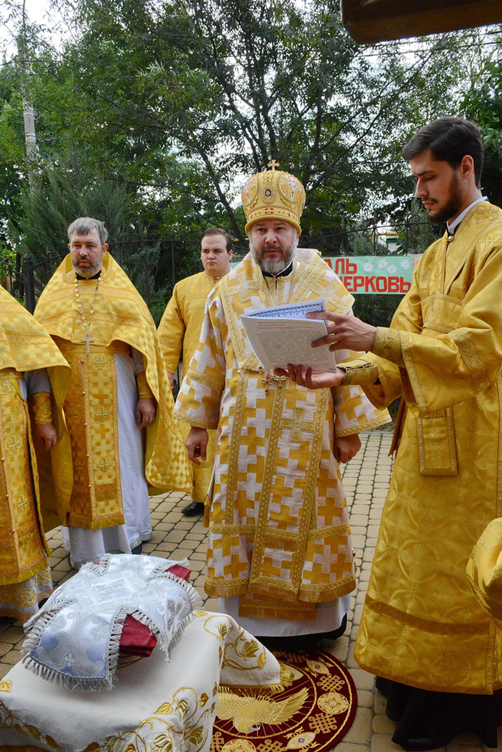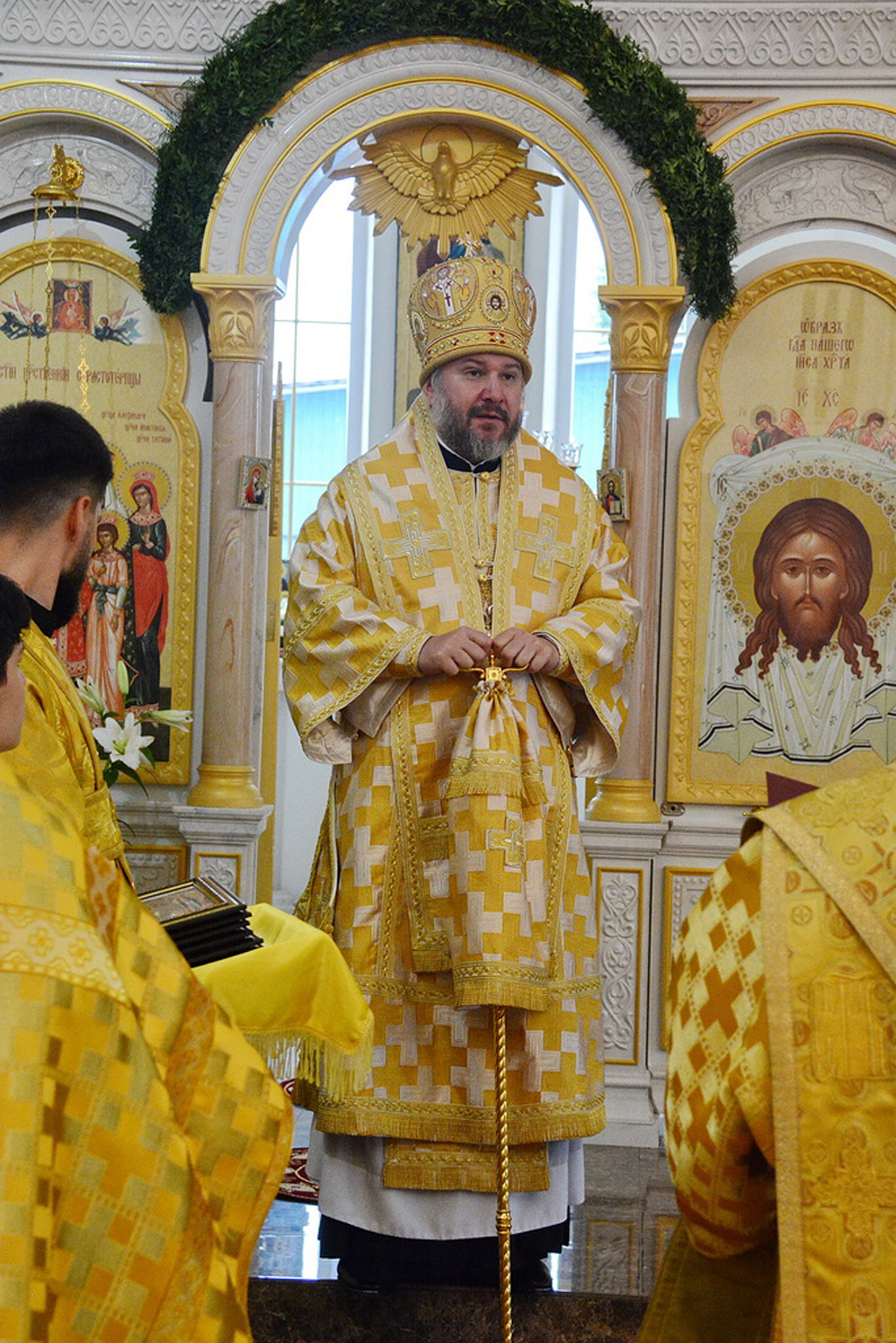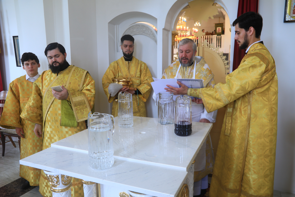 Архиерею сослужили духовник Шахтинской епархии протоиерей Александр Минин, настоятель Державного храма иерей Владимир Татаркин, настоятель храма в честь образа Пресвятой Богородицы Одигитрия пос. Таловый иерей Андрей Ковалев, настоятель храма Успения Пресвятой Богородицы ст. Калитвенской иерей Игорь Лосев, диакон Трофим Осяк.