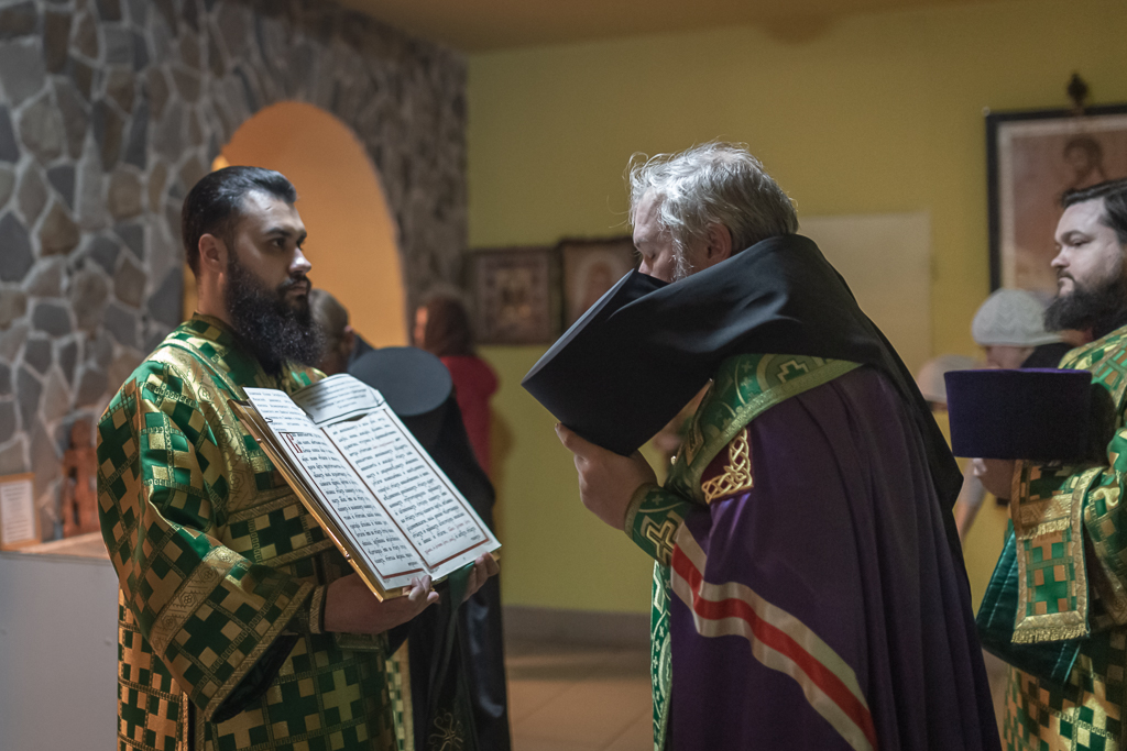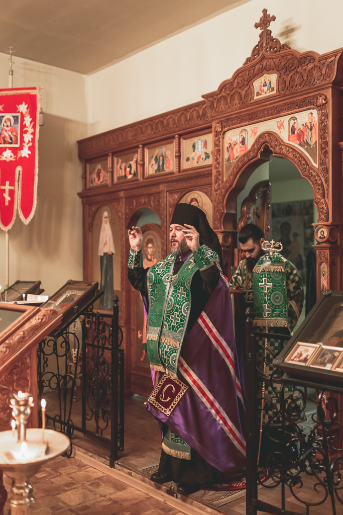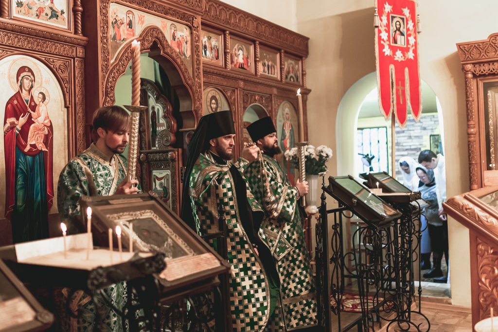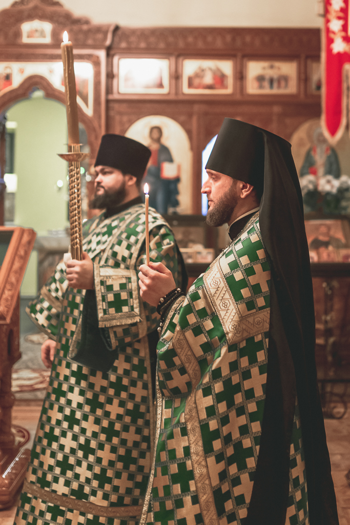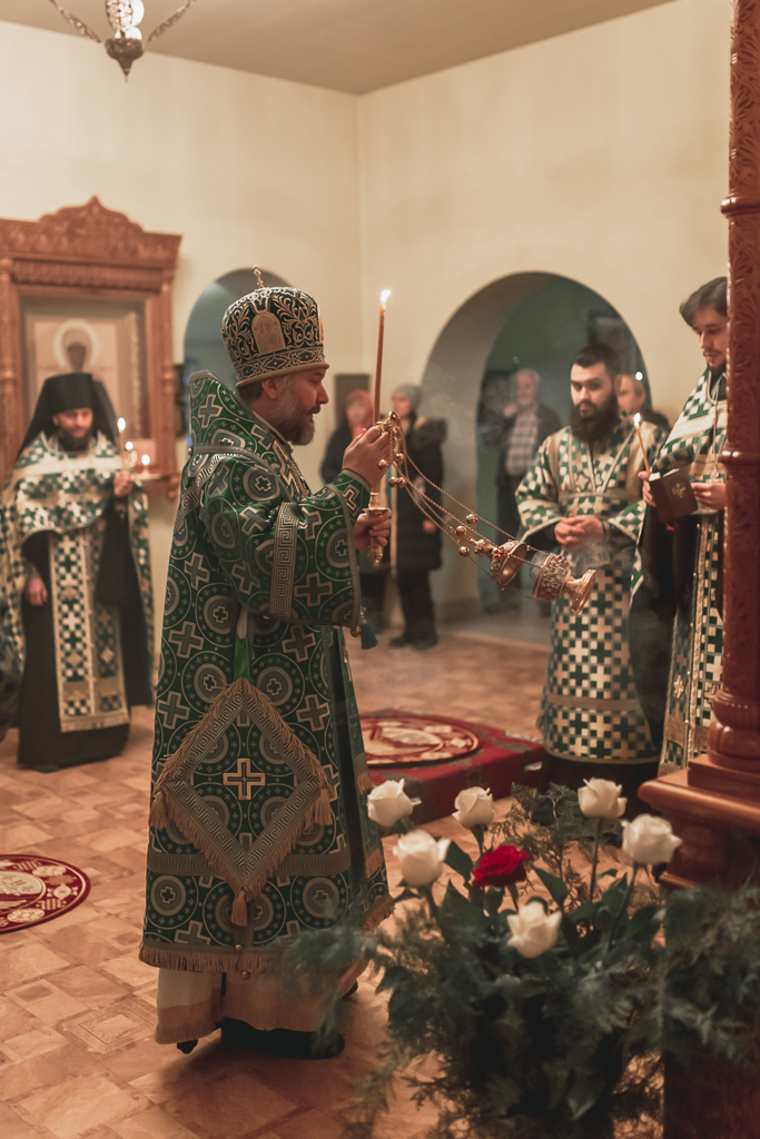 Его Преосвященству сослужили настоятель храма иеромонах Герман (Руденко), иерей Михаил Дубянский, диакон Трофим Осяк и клирик храма иеродиакон Флавиан (Васильев).