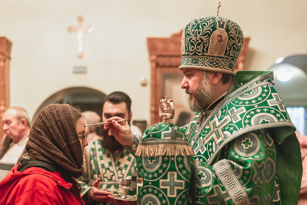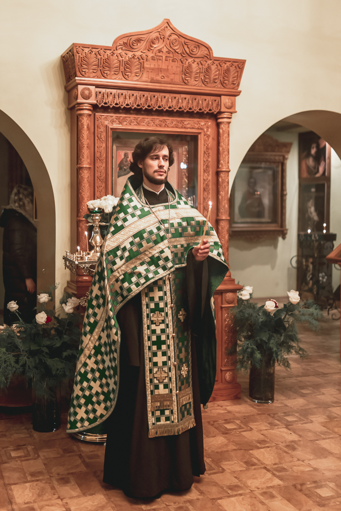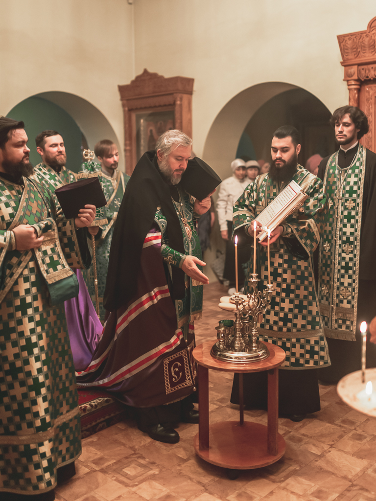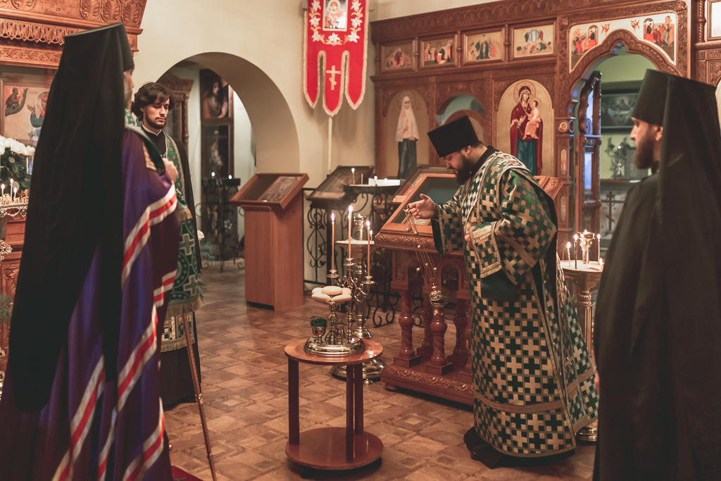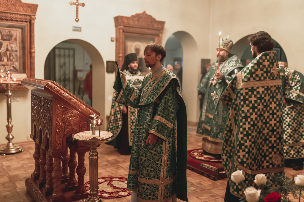 Его Преосвященству сослужили настоятель храма иеромонах Герман (Руденко), иерей Михаил Дубянский, диакон Трофим Осяк и клирик храма иеродиакон Флавиан (Васильев).