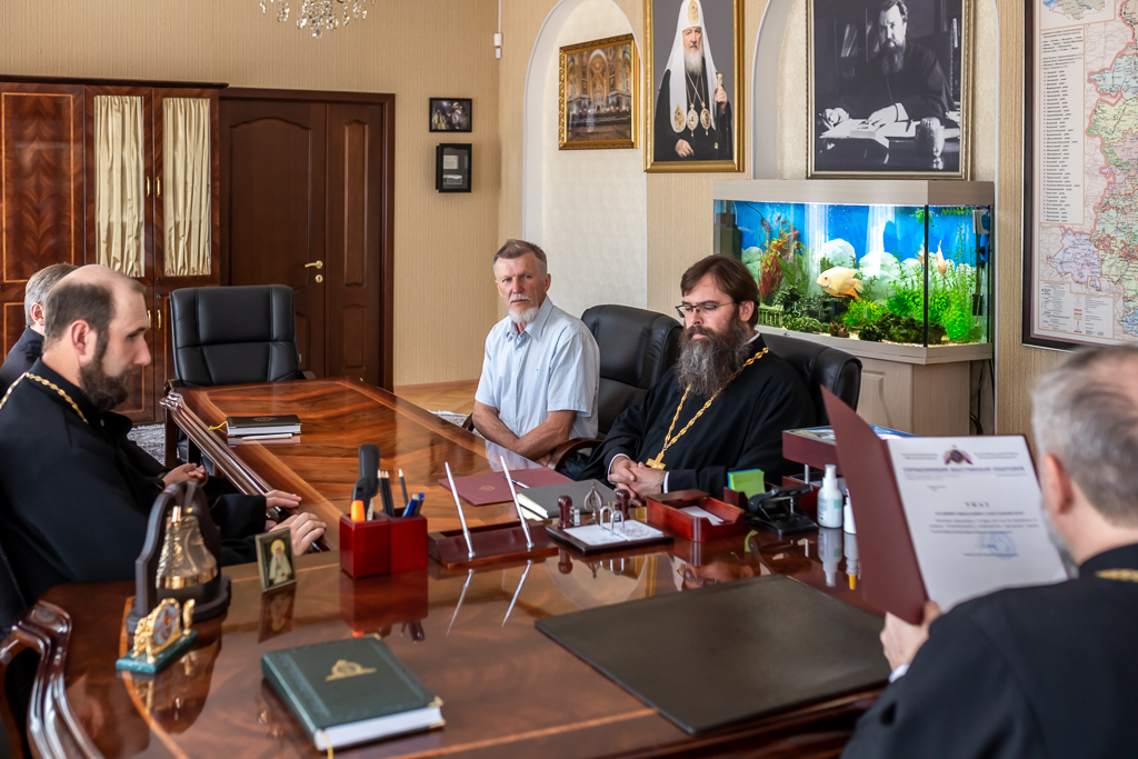 Перед обсуждением рабочих вопросов Преосвященнейший епископ Симон вручил Указ о назначении на должность архитектора Шахтинской епархии В.Н. Александровскому.