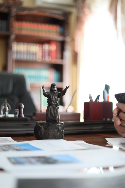 Обсуждался вопрос благоукрашения прилегающей к храму территории. В частности, размещение на церковном подворье скульптуры одного из самых почитаемых в России святых преподобного Серафима Саровского. Александр Анатольевич представил архиерею точный прототип монумента в уменьшенном размере и рассказал, что скульптура станет достоянием не только храма, но и всех жителей станицы Багаевской.