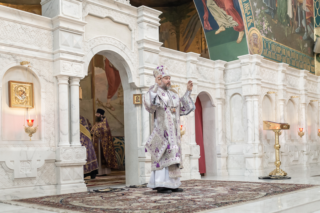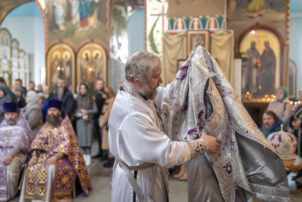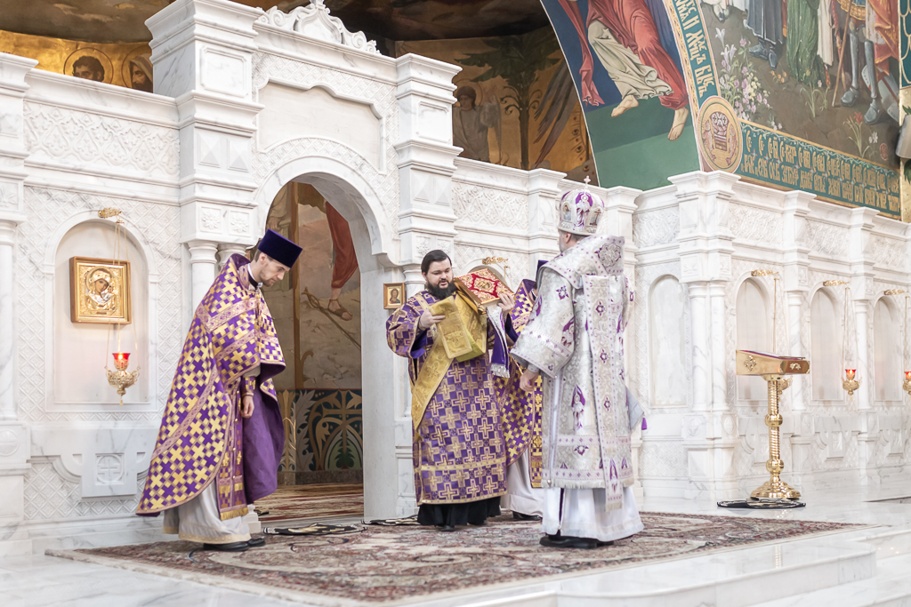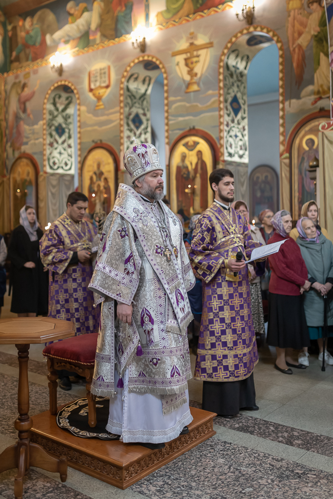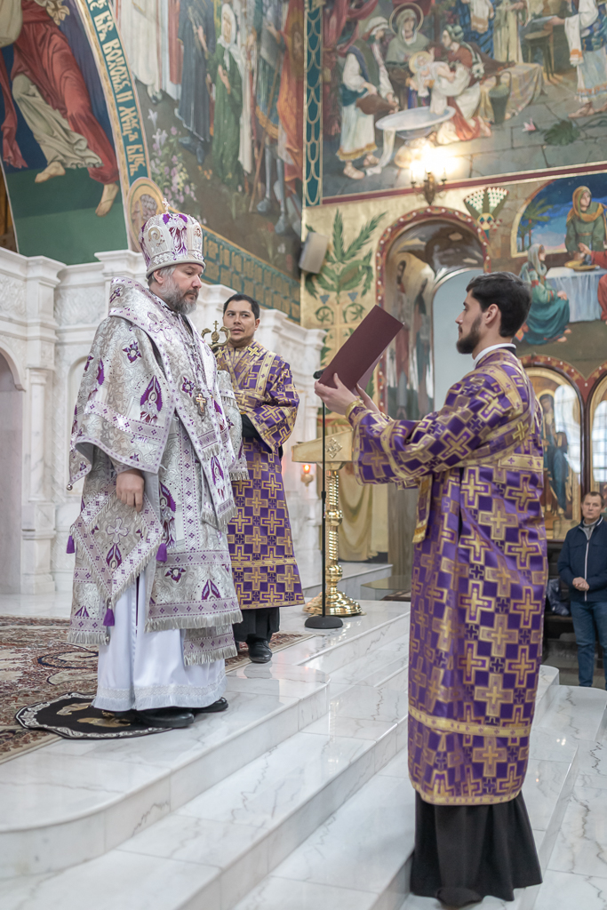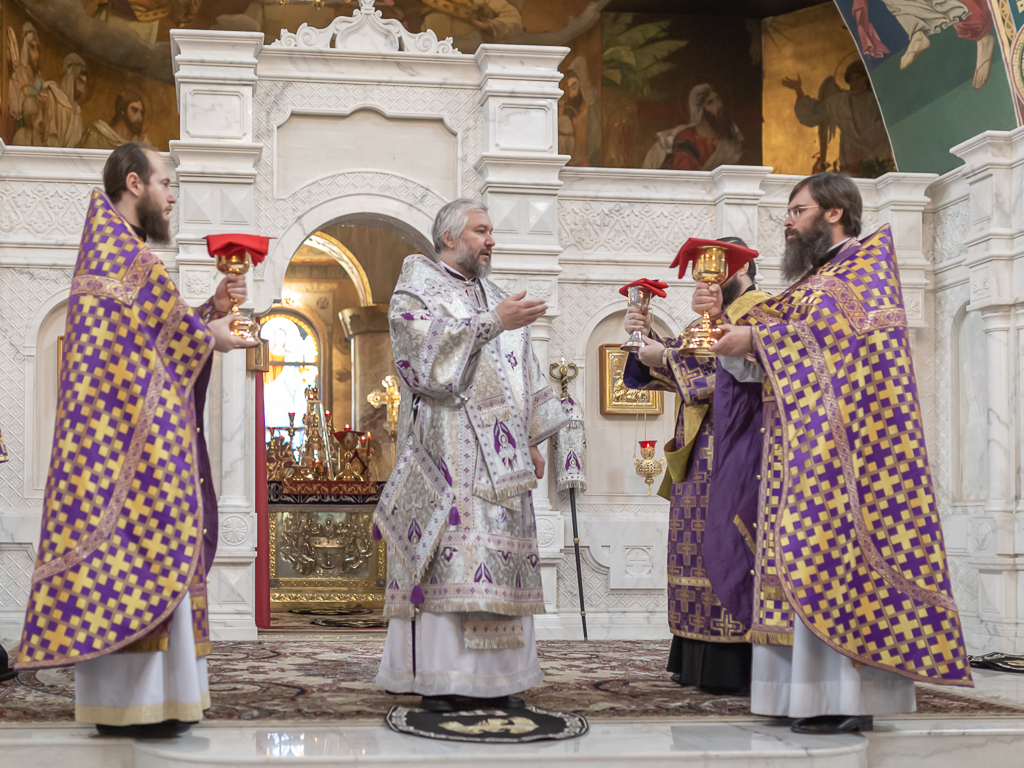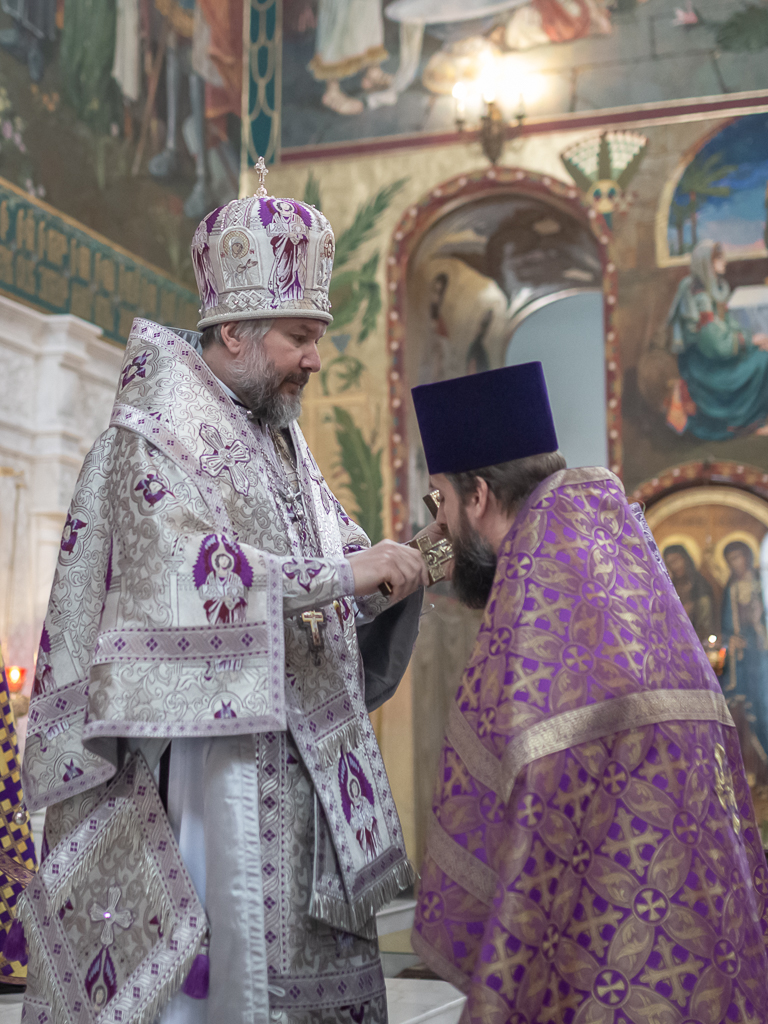 Его Преосвященству сослужили настоятель собора иерей Александр Теличкин, иерей Даниил Зырянов, диакон Трофим Осяк и диакон Никита Осипов.