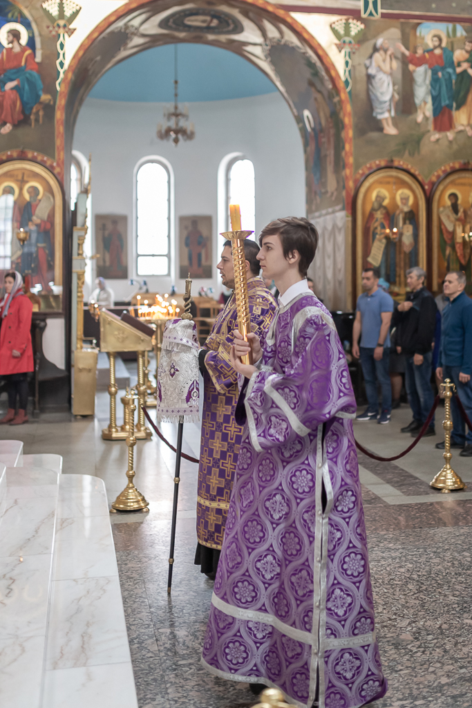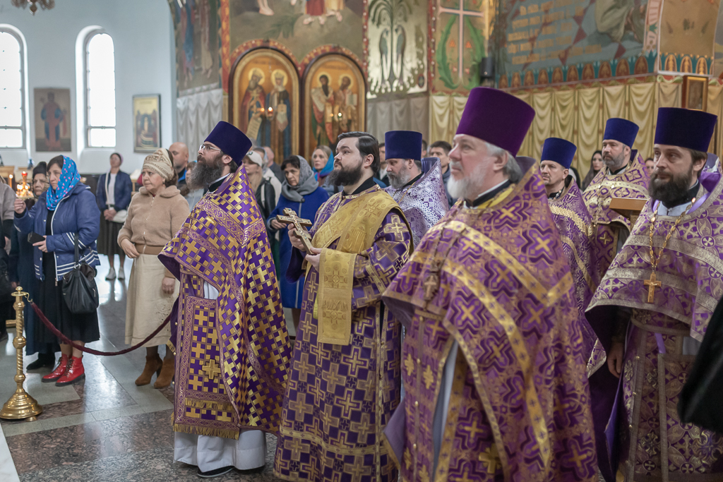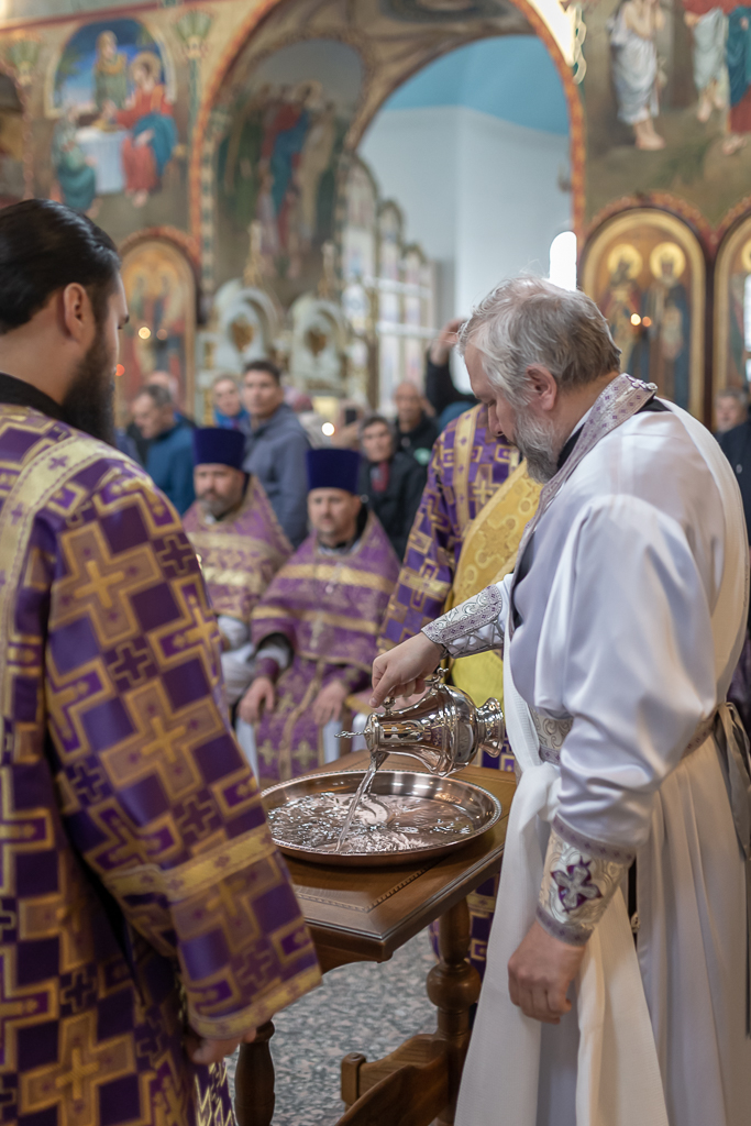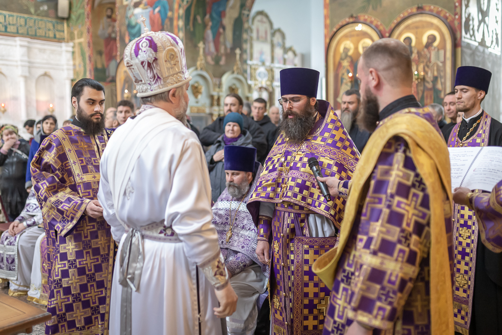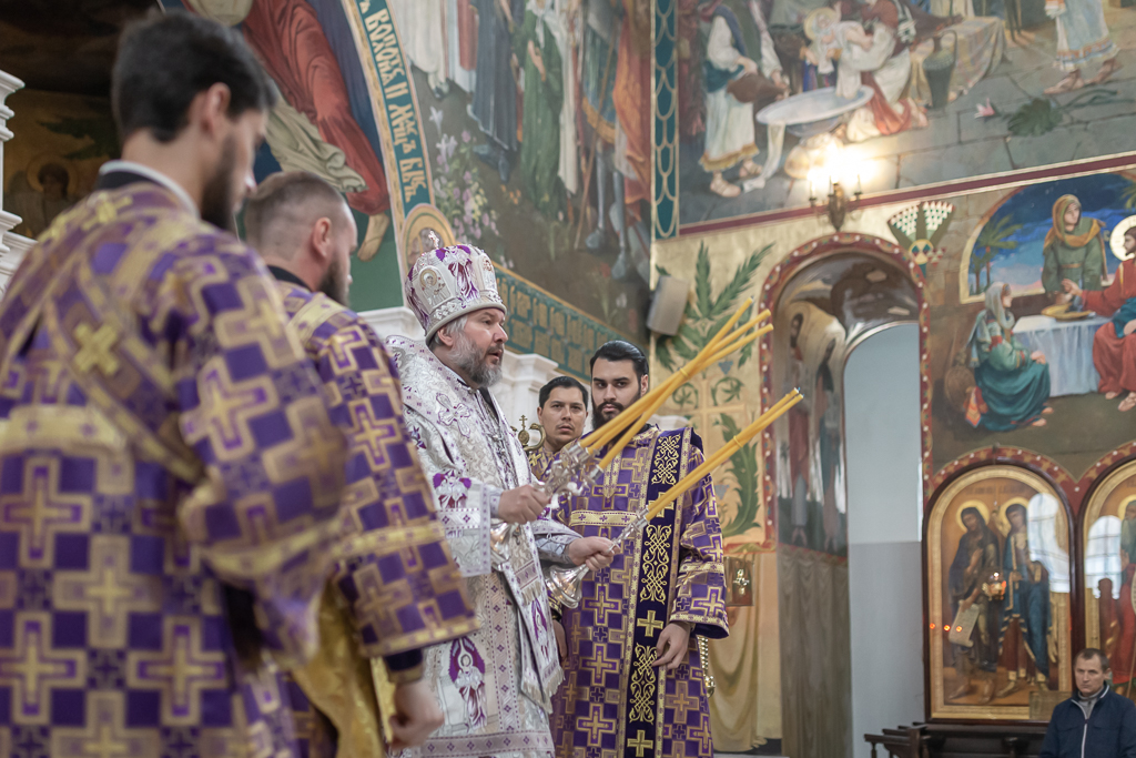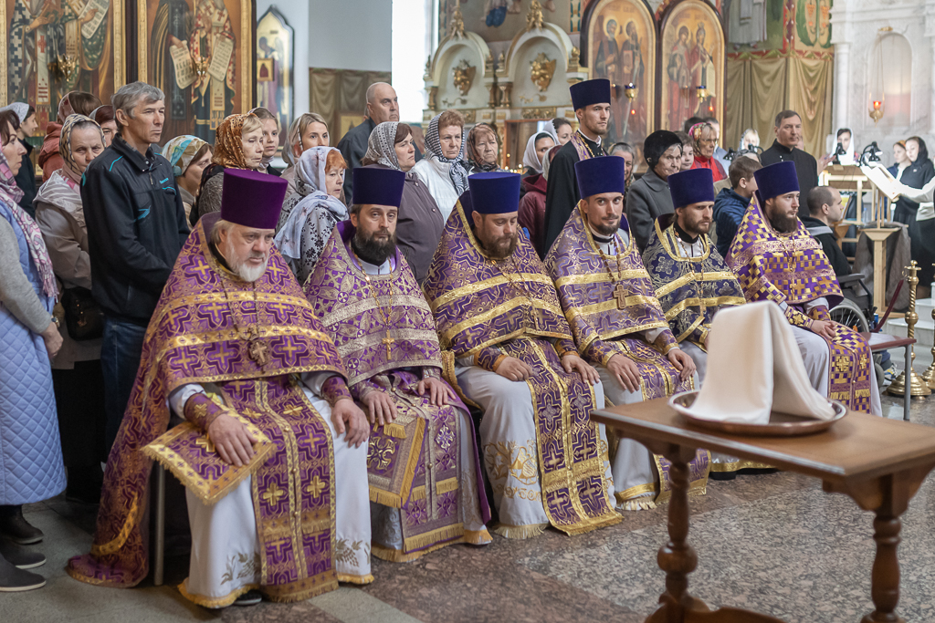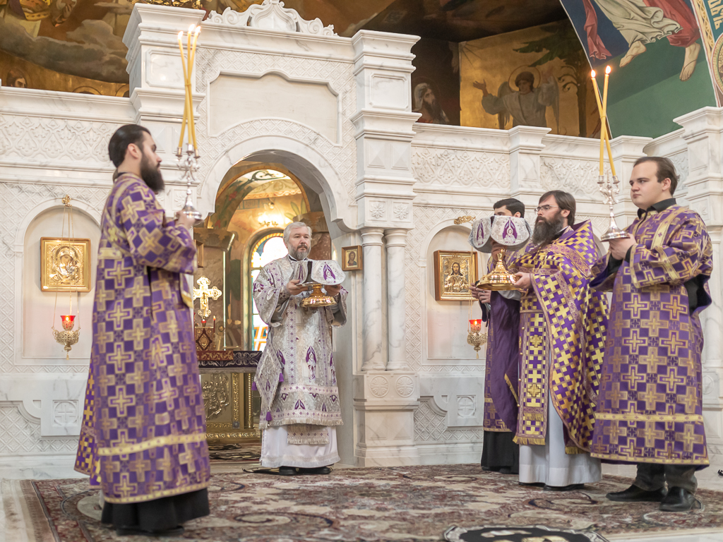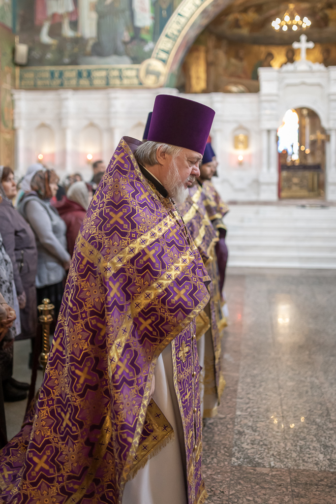Его Преосвященству сослужили настоятель собора иерей Александр Теличкин, иерей Даниил Зырянов, диакон Трофим Осяк и диакон Никита Осипов.