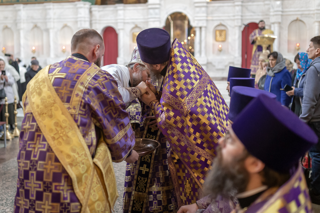 По окончании Божественной литургии епископ Симон совершил Чин умовения ног двенадцати священникам Шахтинской епархии – по примеру Спасителя, умывшего ноги Своим ученикам. Это особый чин, который совершается при архиерейском служении в Великий четверг.