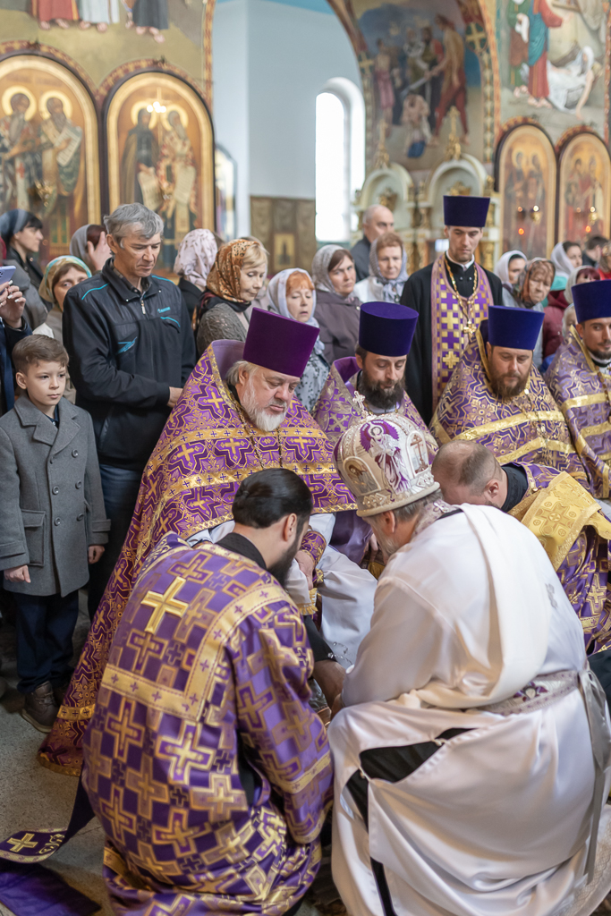 При чтении диаконом Евангелия от Иоанна, повествующего об умовении ног Спасителя Своим ученикам, архипастырь снял с себя верхнюю часть облачения, препоясался лентием (длинным белым полотенцем) и по очереди умыл ноги одиннадцати священникам. Двенадцатый священнослужитель, по чину символизирующий апостола Петра, сначала отказывается от умовения, но потом, после евангельских слов «Аще не умыю тебе, не имаши части со Мною», просит омыть не только его ноги, но и руки и главу, затем произносится ответ Спасителя: «Измовенный не требует, токмо нозе умыти…».
