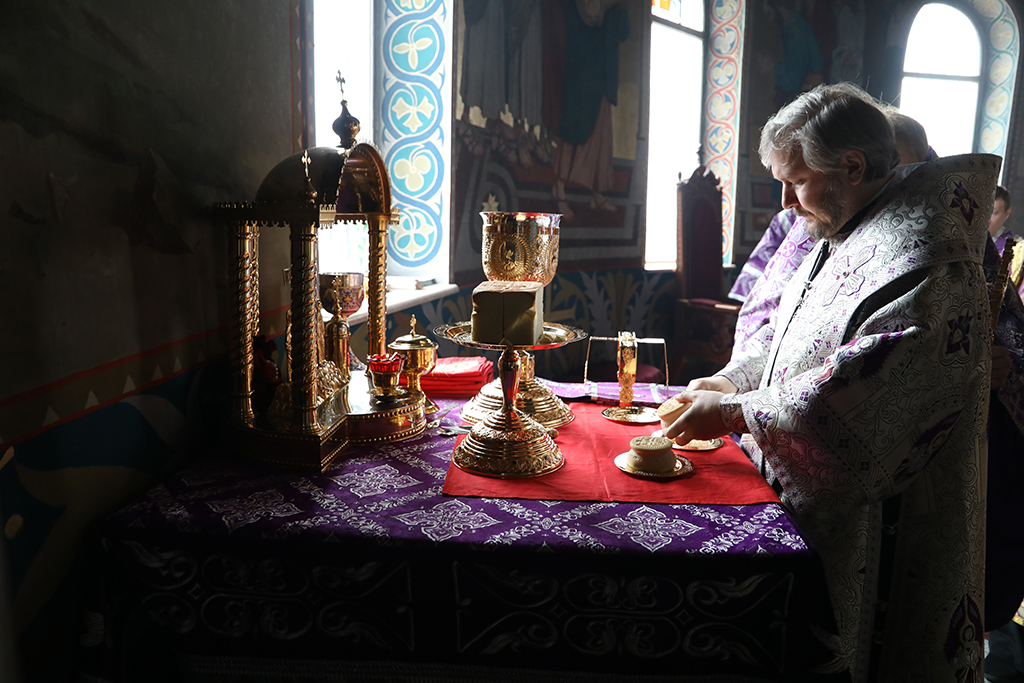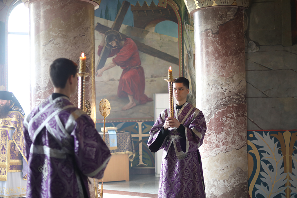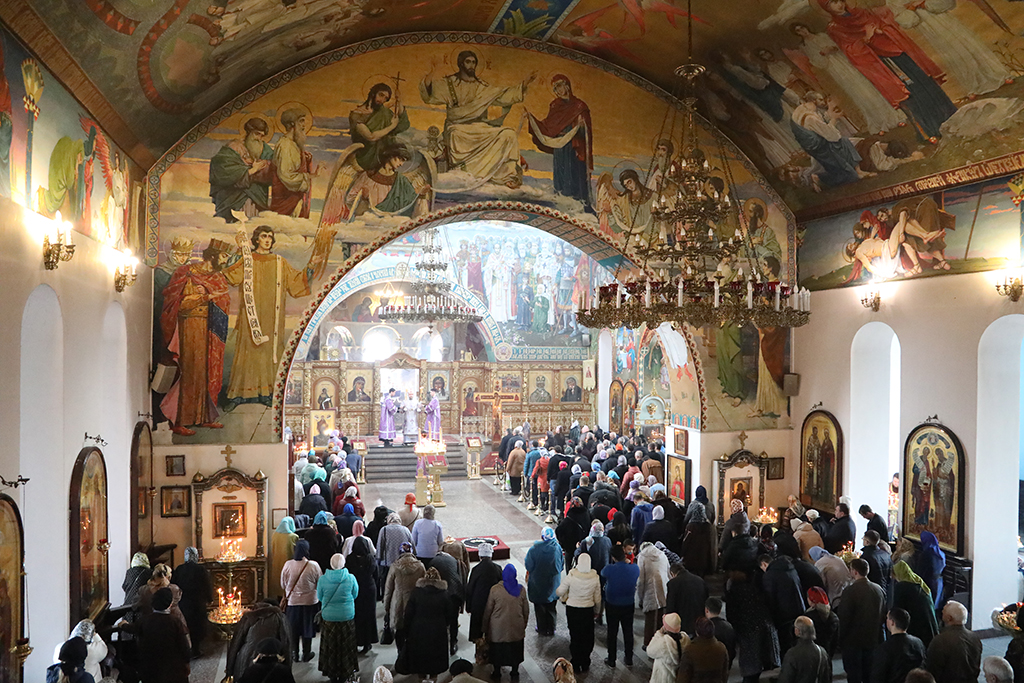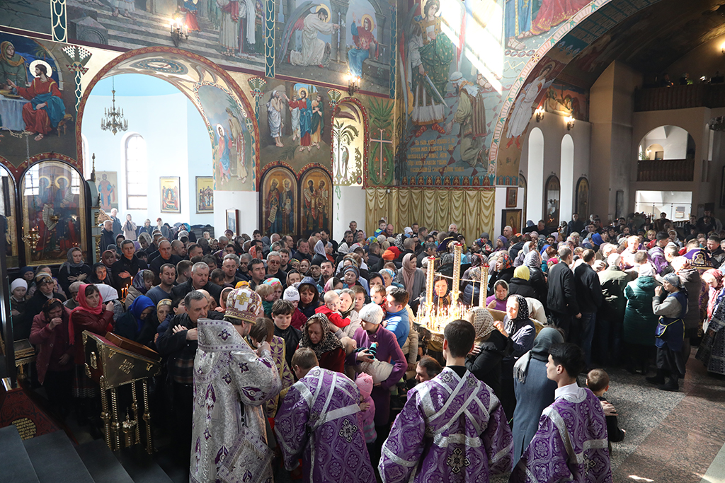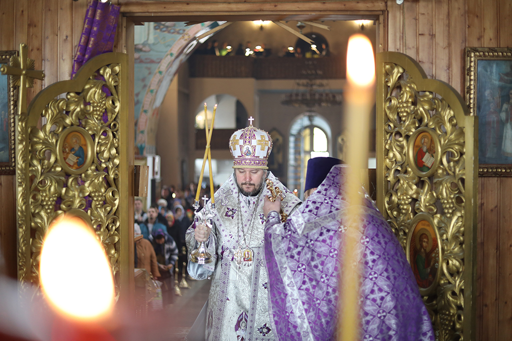 Согласно уставу, богослужение началось с чтения 3, 6, 9 часов и чина изобразительных, а далее была совершена великая вечерня, переходящая в чинопоследование Литургии. После сугубой ектении епископ Симон вознес молитву о мире на Украине.