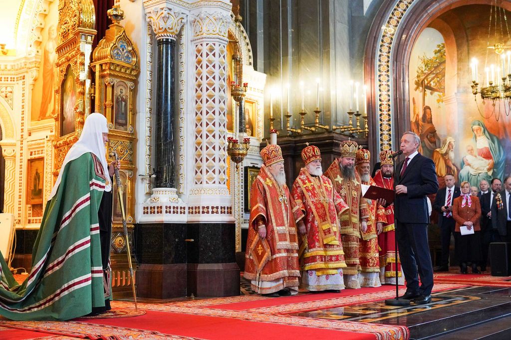 От лица Президента Российской Федерации В.В. Путина Святейшего Патриарха Кирилла поздравил губернатор Санкт-Петербурга А.Д. Беглов, зачитавший поздравление главы государства.