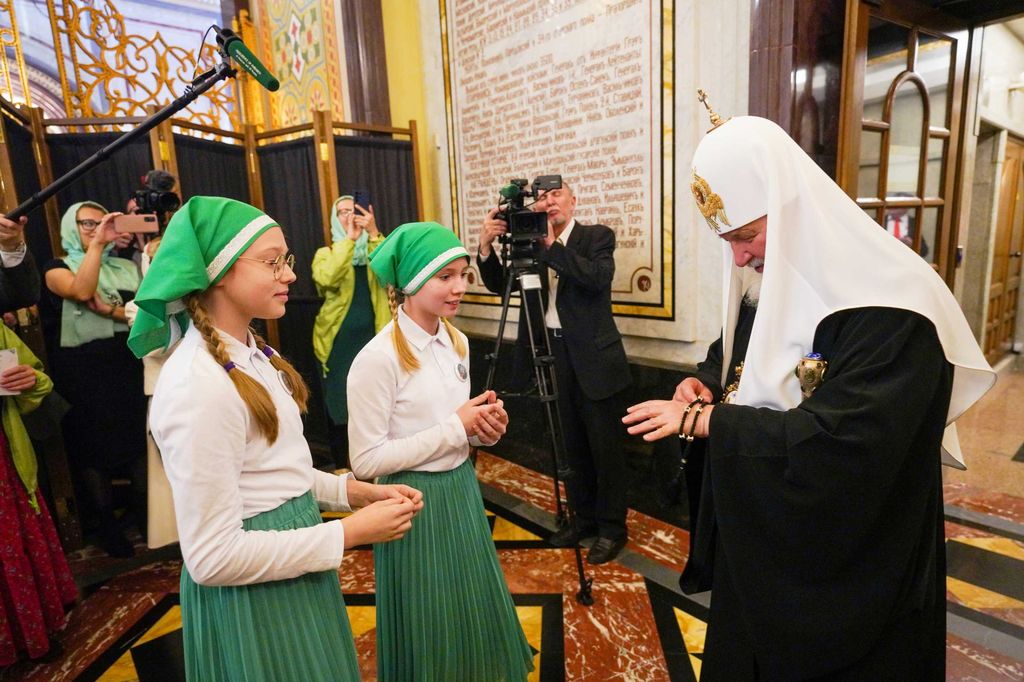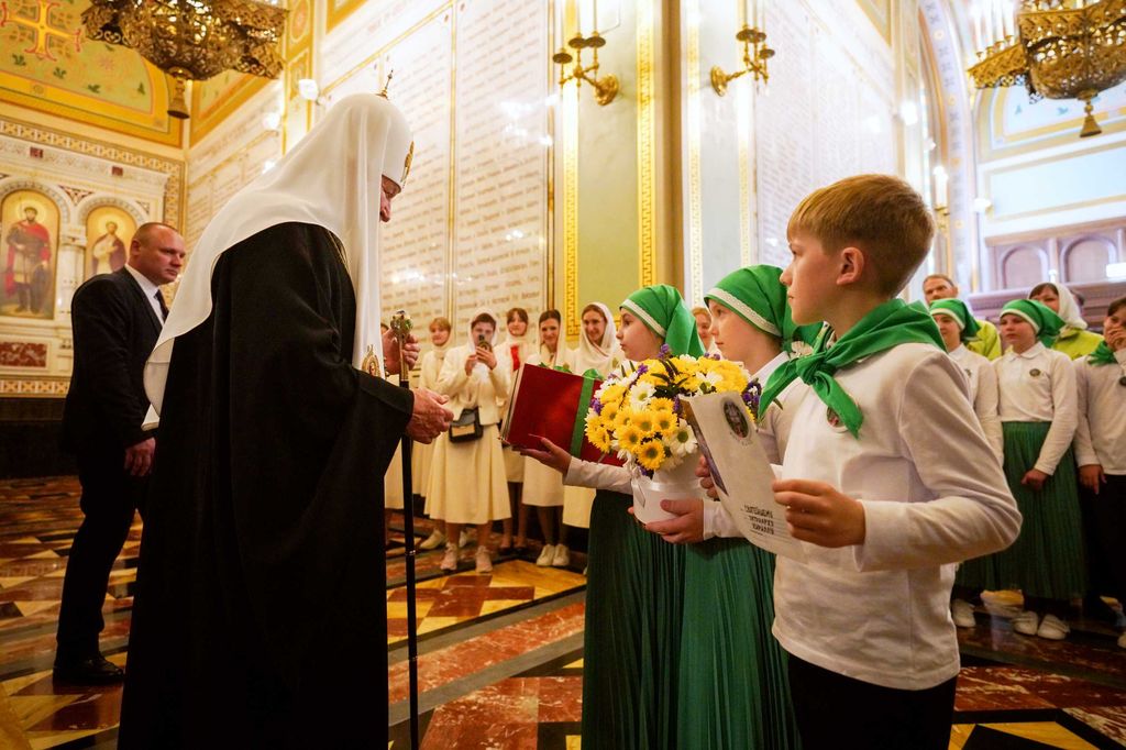 По завершении богослужения в галерее за алтарем Храма Христа Спасителя Святейшего Патриарха Кирилла с днем тезоименитства поздравили участники движения «Патриаршие добровольцы», а также учащиеся воскресной школы «Сретение» при храме праведного Иоанна Кронштадтского в Жулебине г. Москвы.