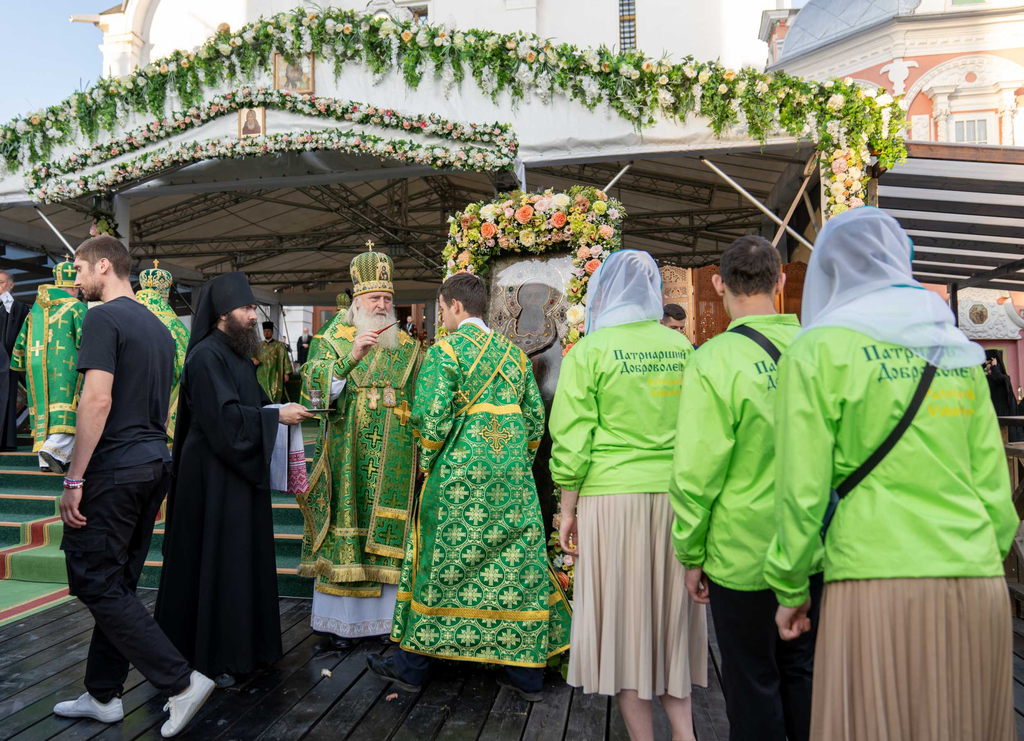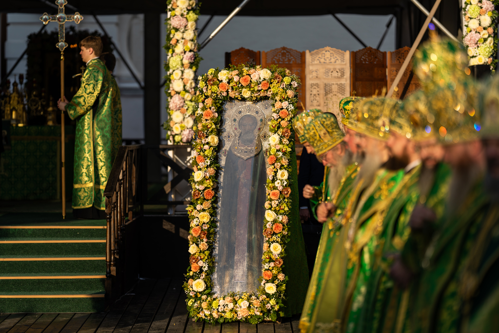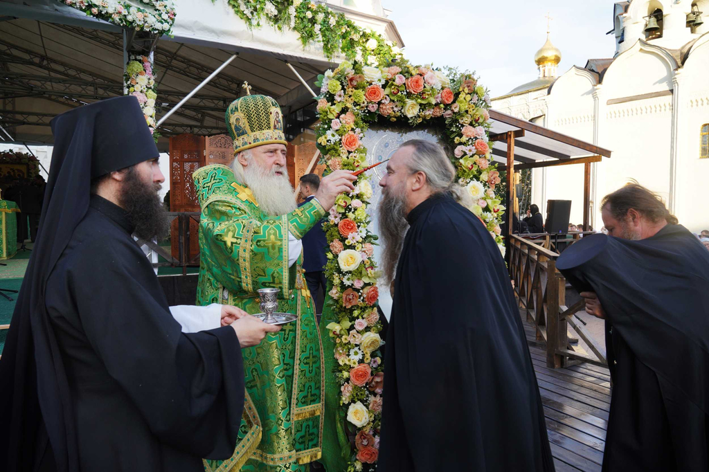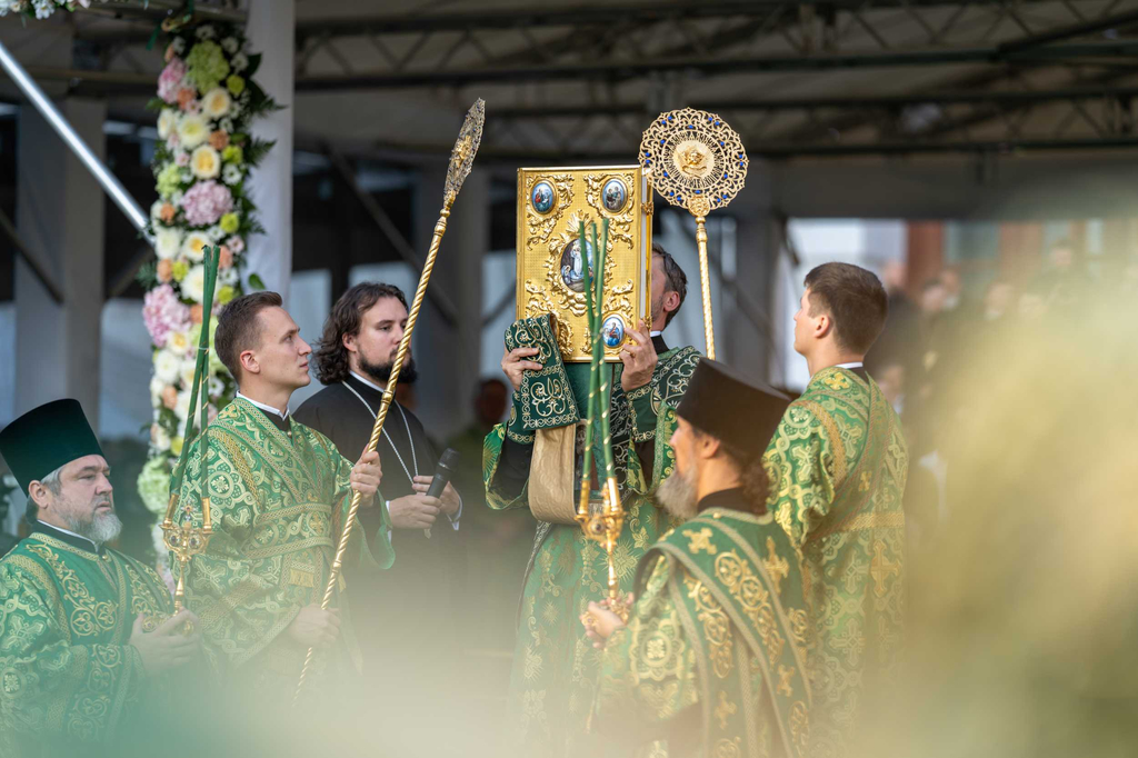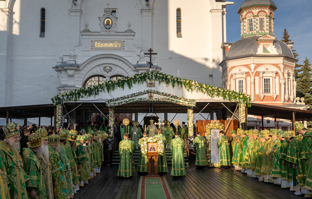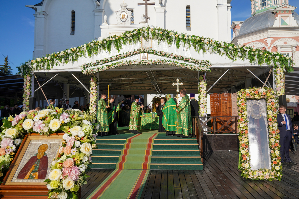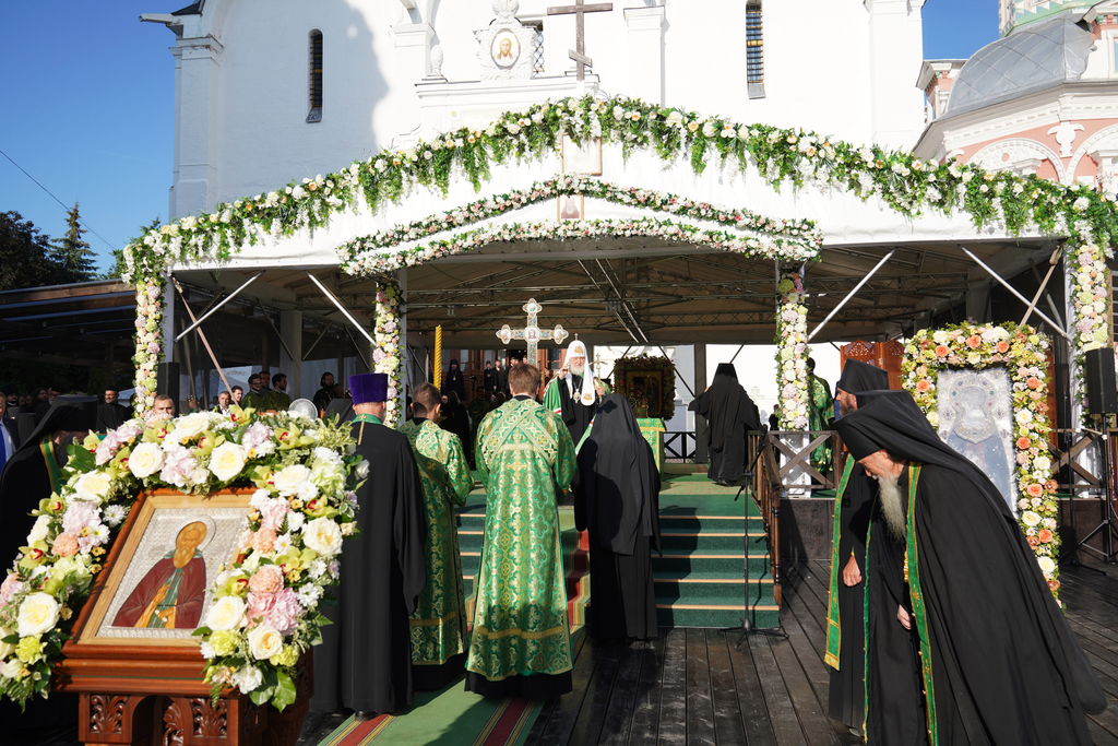 Торжественное богослужение совершалось перед чтимой иконой преподобного Сергия. Для совершения праздничных всенощного бдения и Божественной литургии на Соборной площади устроен помост, а перед Успенским собором Лавры установлен престол под сенью.