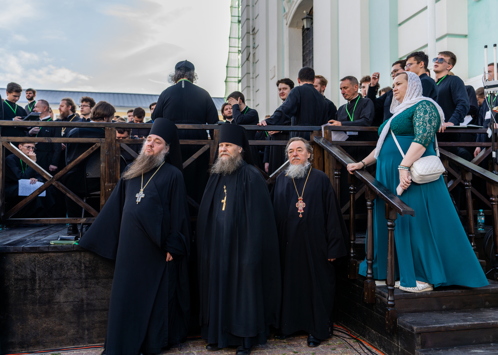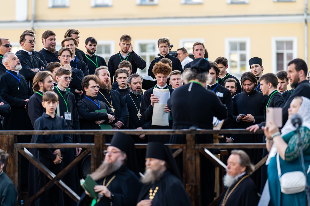 Богослужебные песнопения исполнил объединенный хор Троице-Сергиевой лавры и Московской духовной академии под управлением иеромонаха Нестора (Волкова).