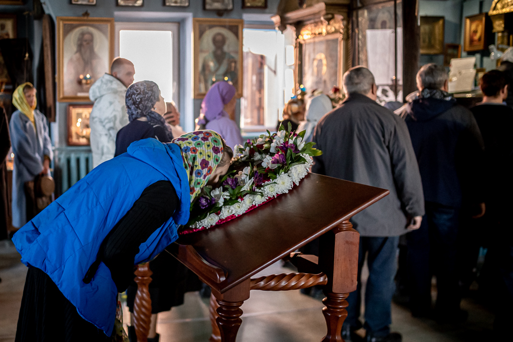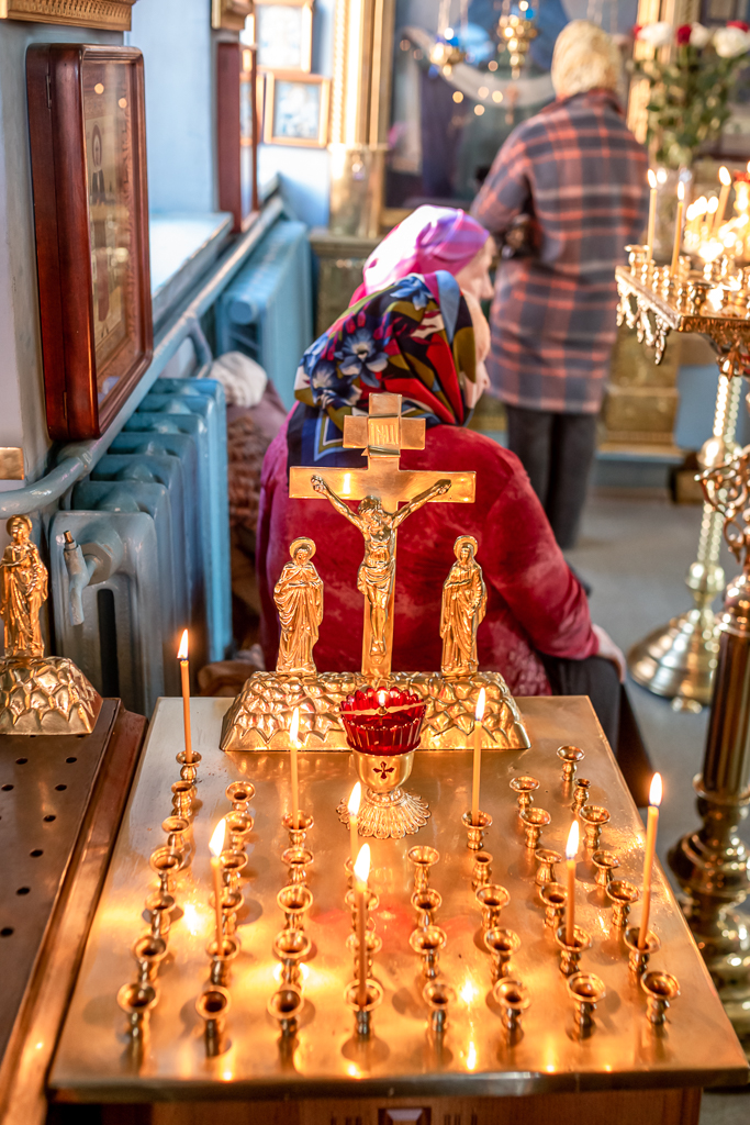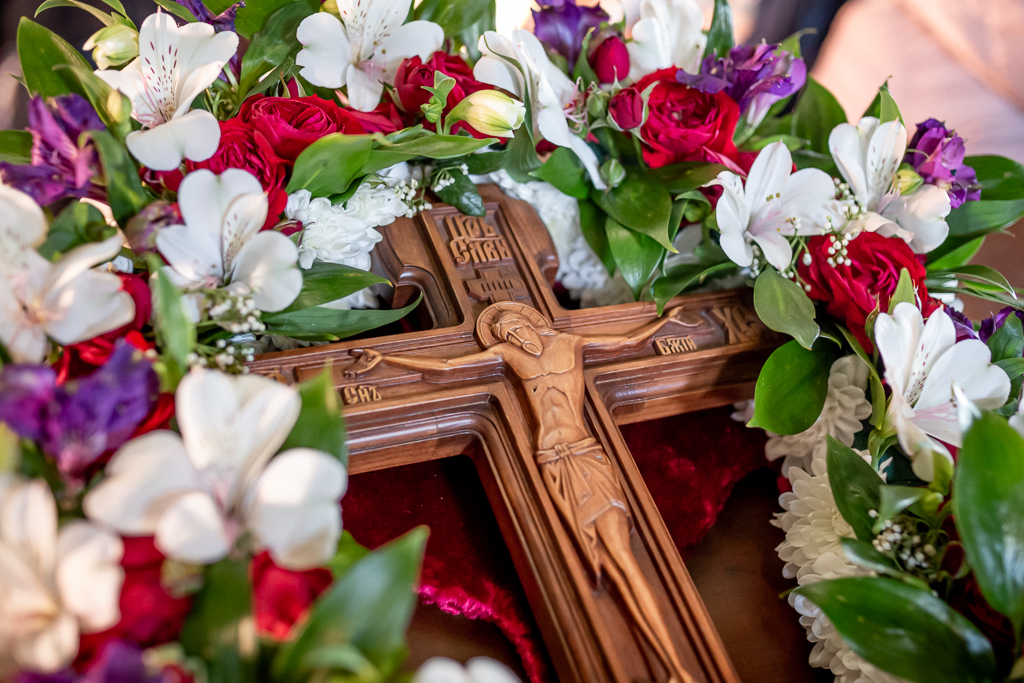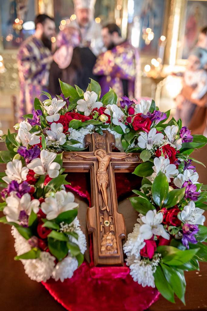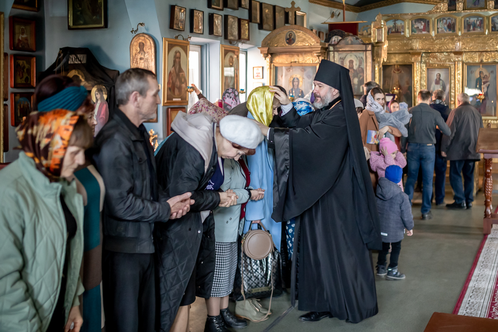 После Литургии духовенство и прихожане совершили поклонение кресту, изнесенному из алтаря на всенощном бдении.
