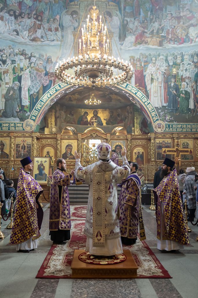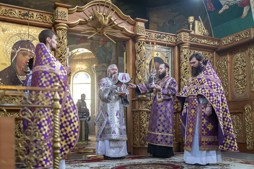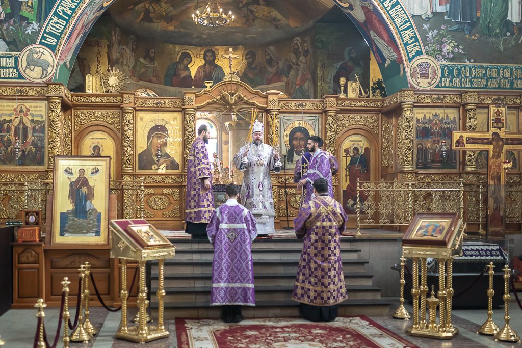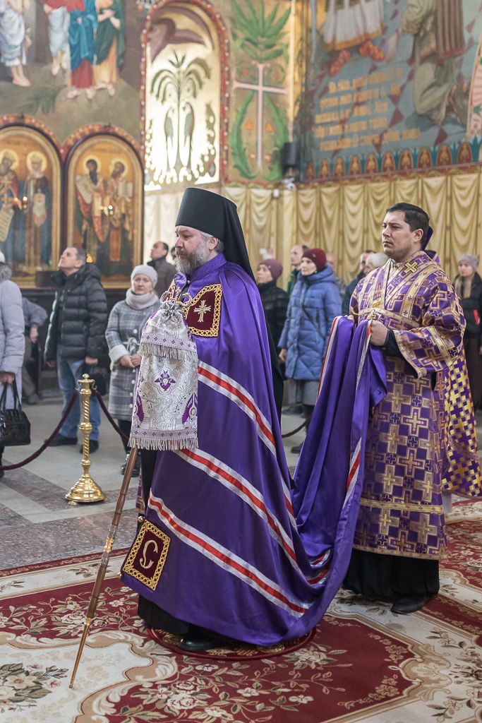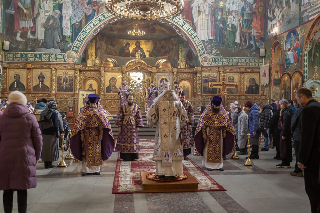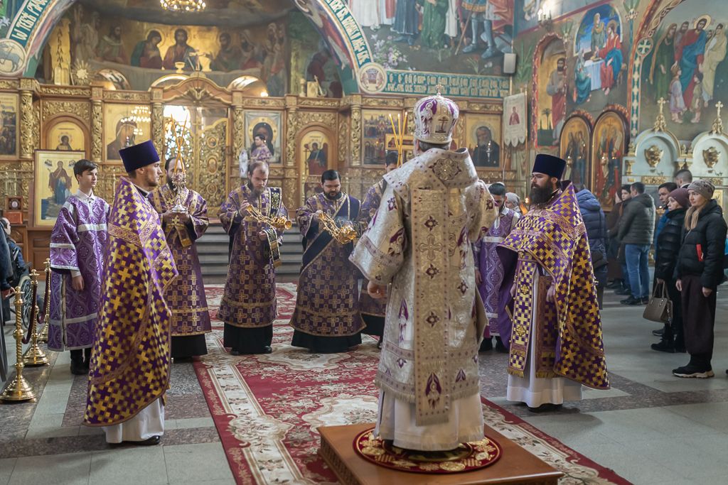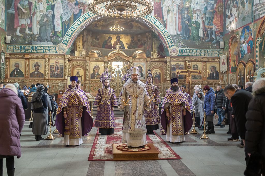 Его Преосвященству сослужили настоятель собора иерей Александр Теличкин, иерей Даниил Зырянов, диакон Трофим Осяк, диакон Никита Осипов и диакон Вячеслав Иващенко.