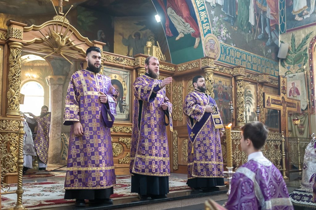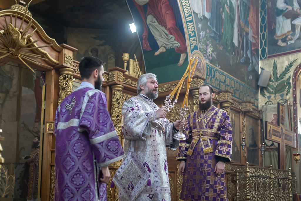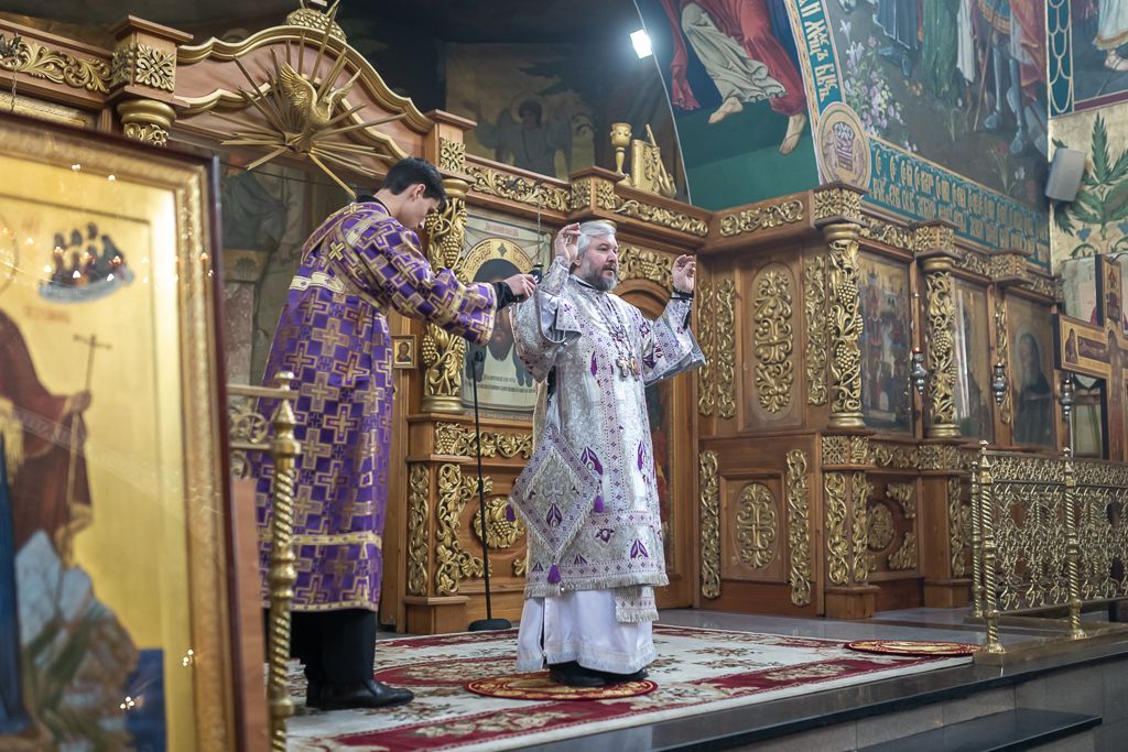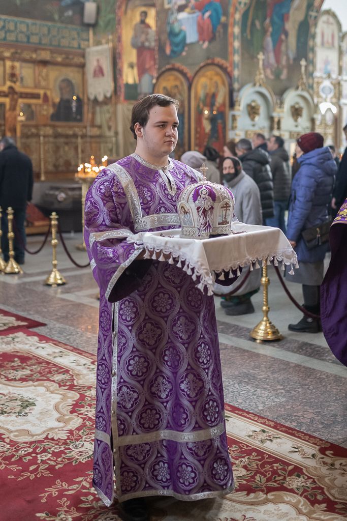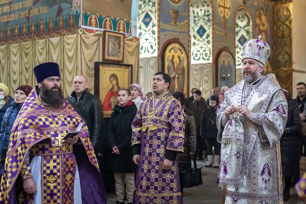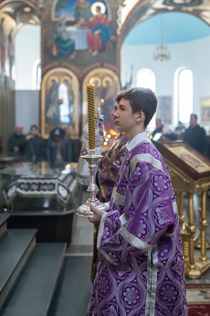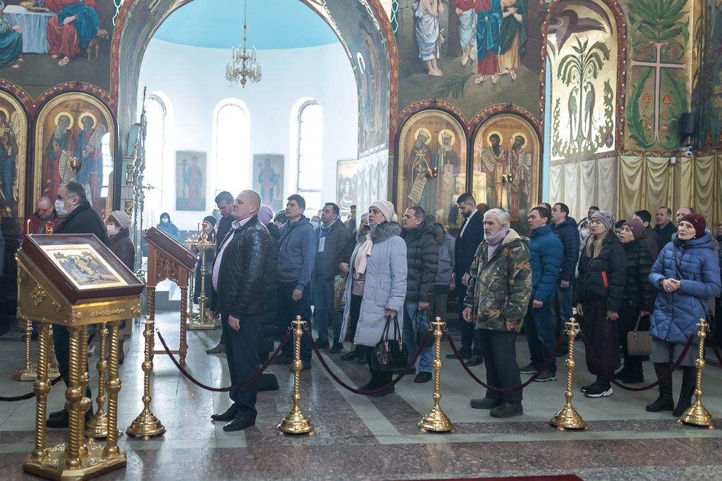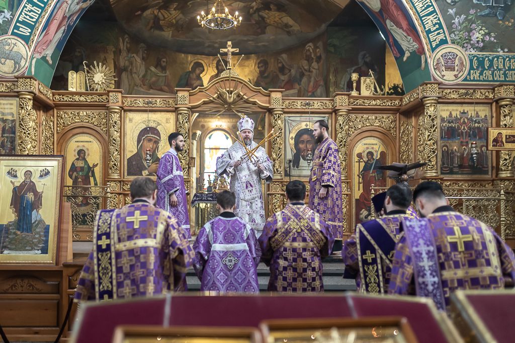 Его Преосвященству сослужили настоятель собора иерей Александр Теличкин, иерей Даниил Зырянов, диакон Трофим Осяк, диакон Никита Осипов и диакон Вячеслав Иващенко.