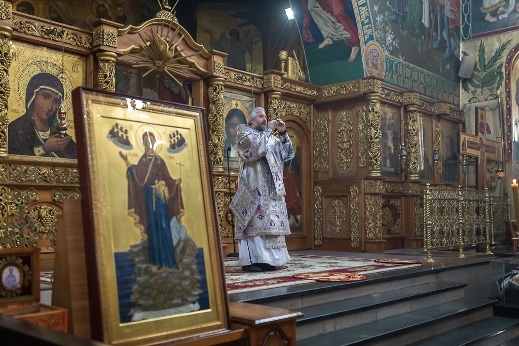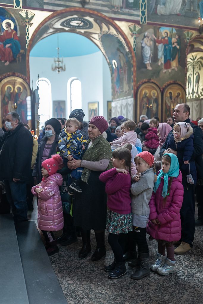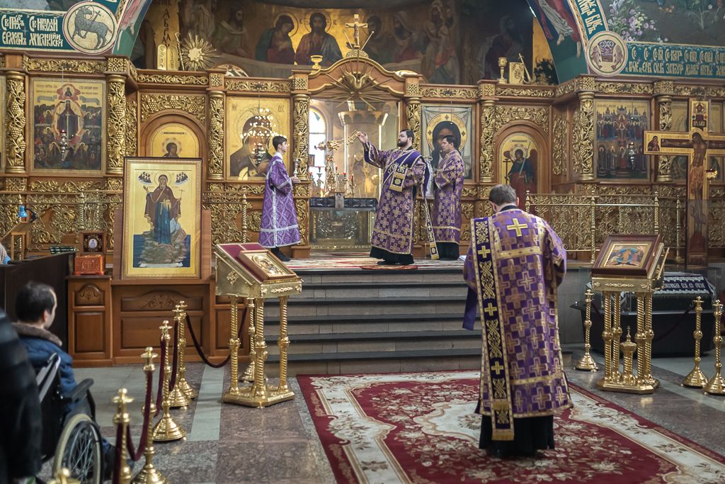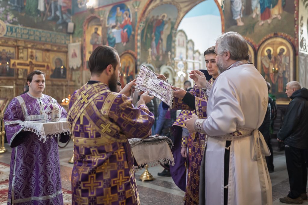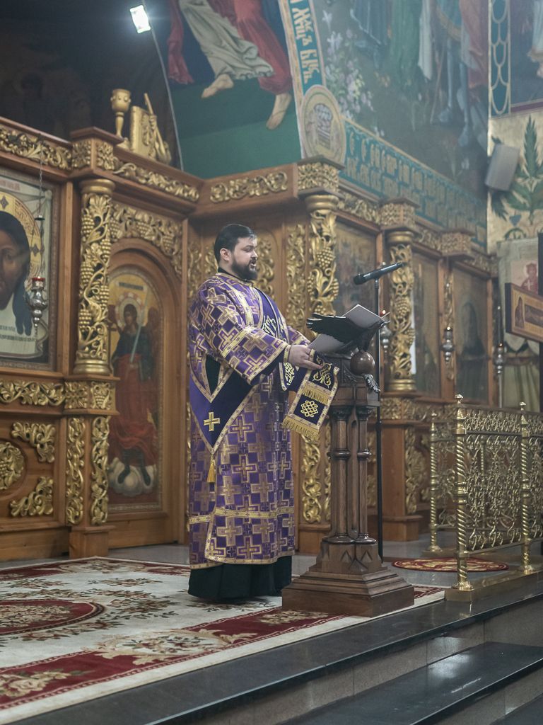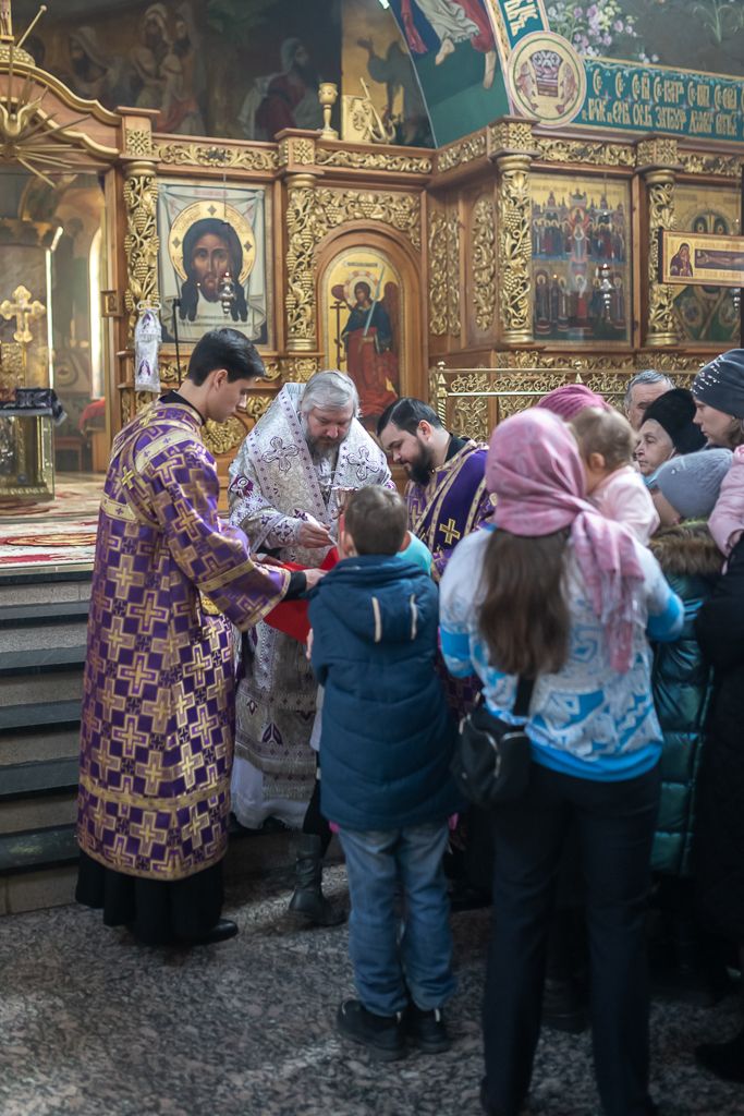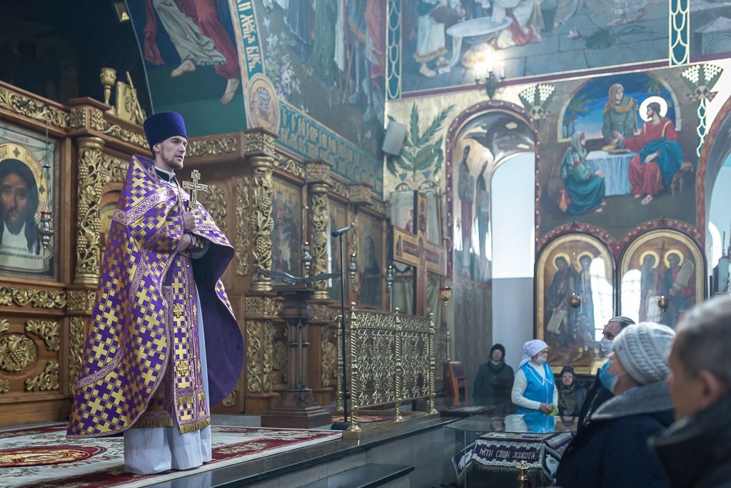 Его Преосвященству сослужили настоятель собора иерей Александр Теличкин, иерей Даниил Зырянов, диакон Трофим Осяк, диакон Никита Осипов и диакон Вячеслав Иващенко.