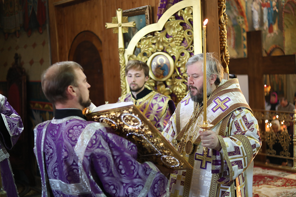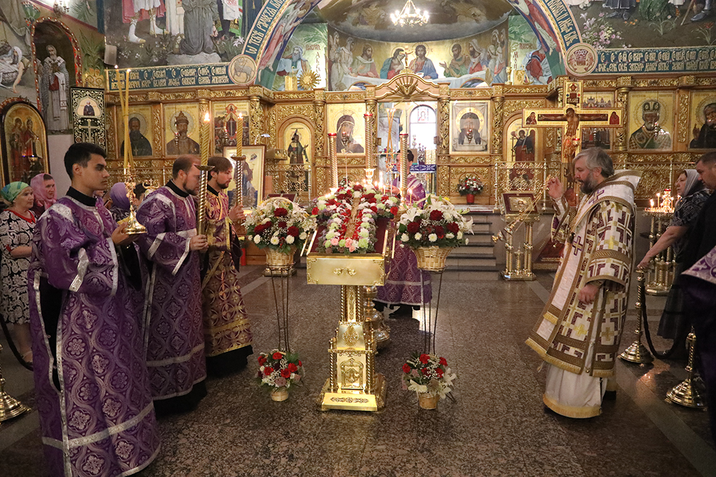 После великого славословия из алтаря был вынесен крест, украшенный цветами. Епископ Симон совершил торжественный чин Воздвижения Креста. Архипастырь посреди храма высоко поднимал и опускал Крест до земли – в память того, как Патриарх Макарий много веков назад поднимал обретенный Крест Господень над многотысячным народом, а люди поклонялись живоносному Древу. Священники орошали Распятие благовонной водой с лепестками цветов. Поднимая Крест, архиерей осенял им народ – и так пять раз, во все стороны света – на восток, запад, юг, север и снова на восток. После воздвижения крест был положен на аналое в центре храма для поклонения верующих.