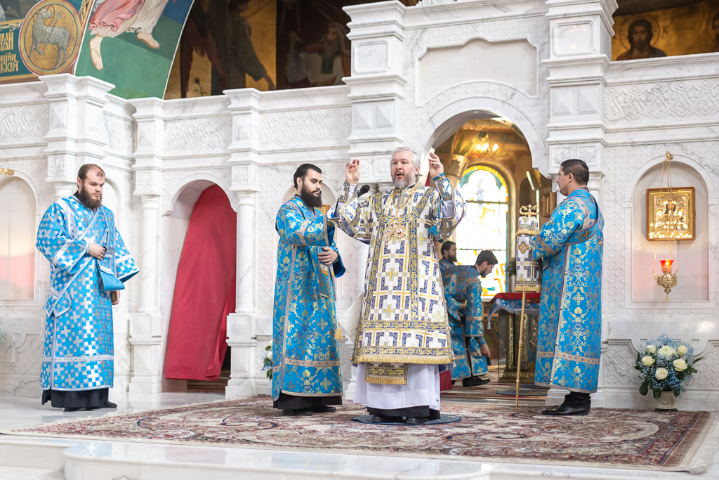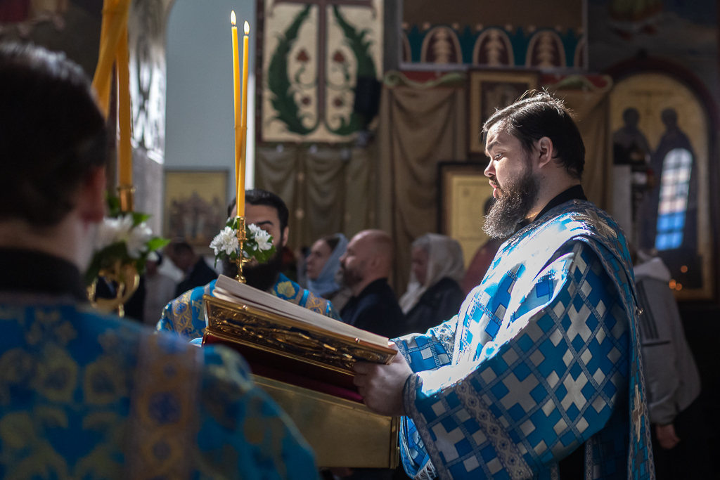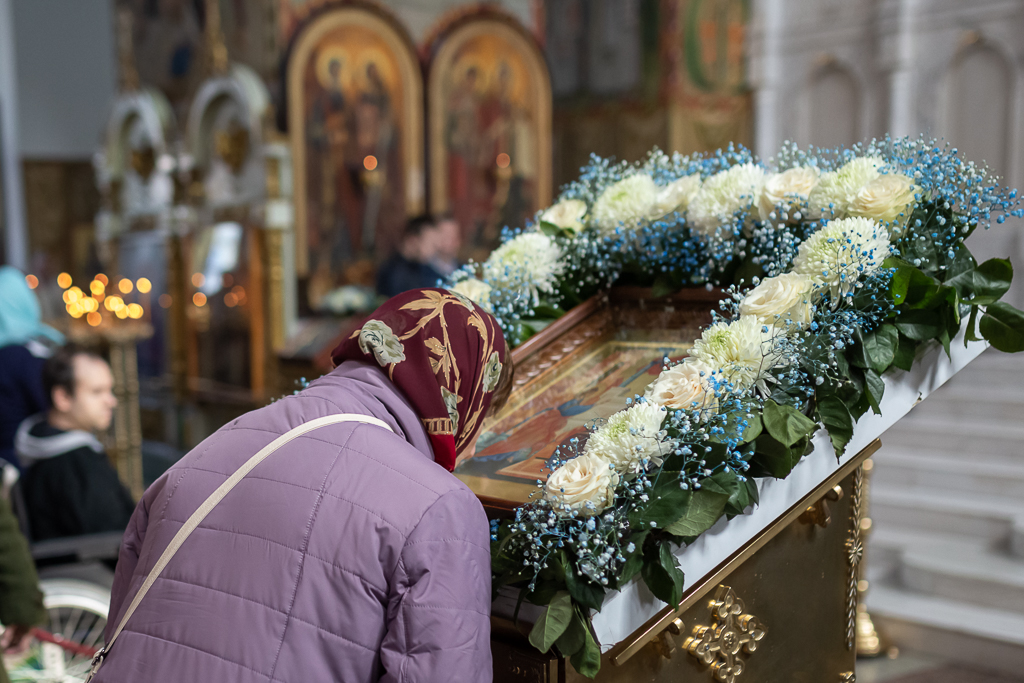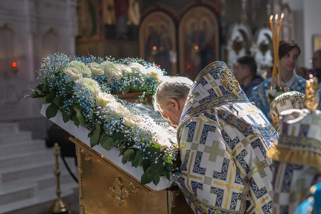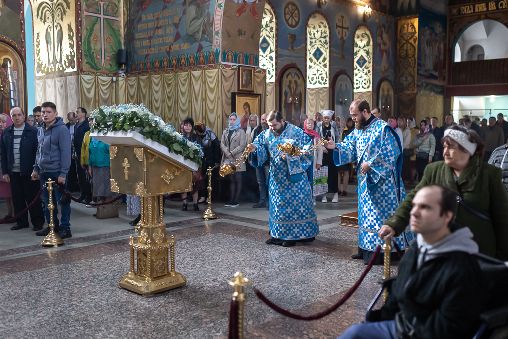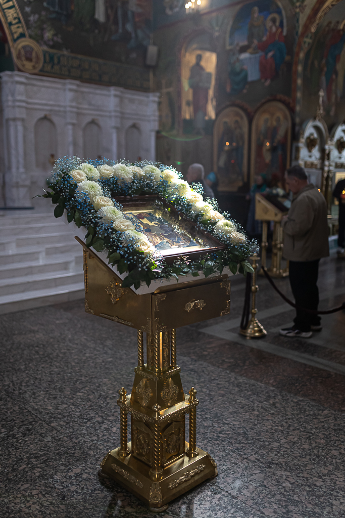 После литургии духовенство и все молящиеся совершил славление Пресвятой Богородице перед Ее праздничной иконой.