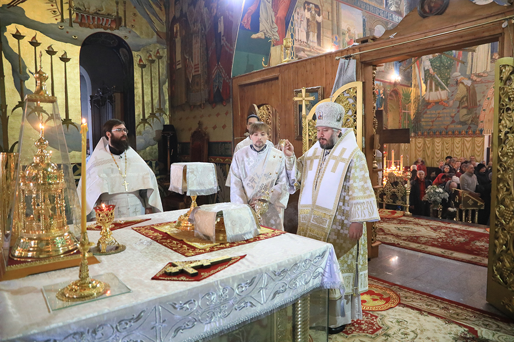 В этот день архипастырю сослужили настоятель Покровского кафедрального собора иерей Александр Теличкин, иерей Леонид Зацепилин, иерей Сергий Липень, иеродиакон Флавиан (Васильев), диакон Вадим Ефимов.