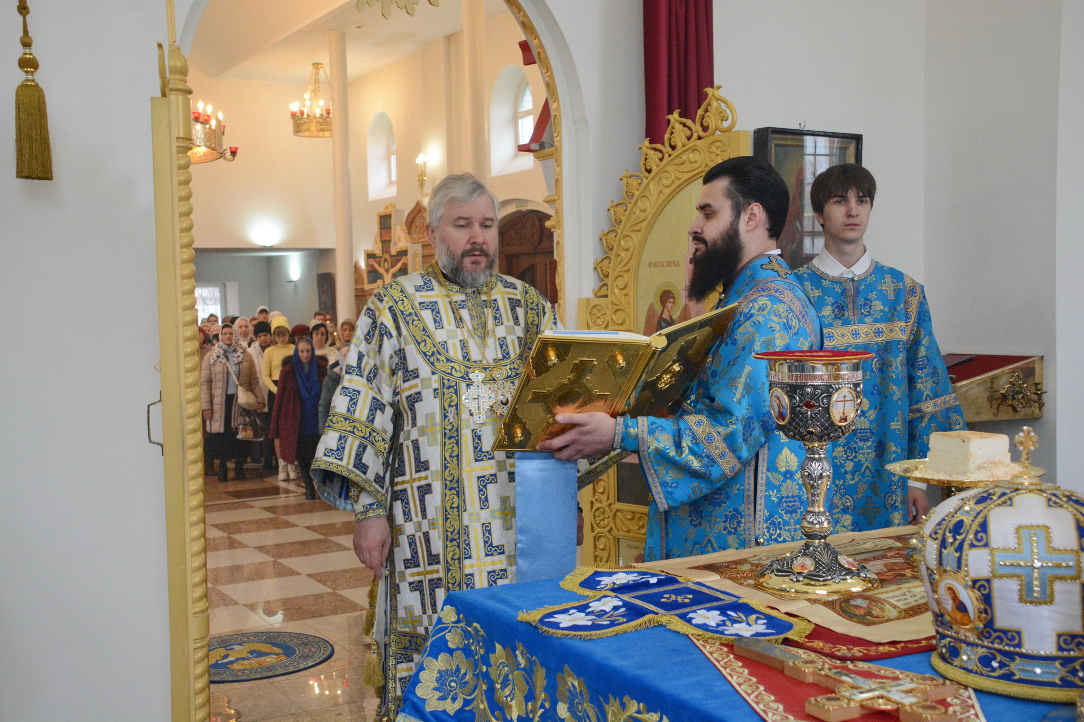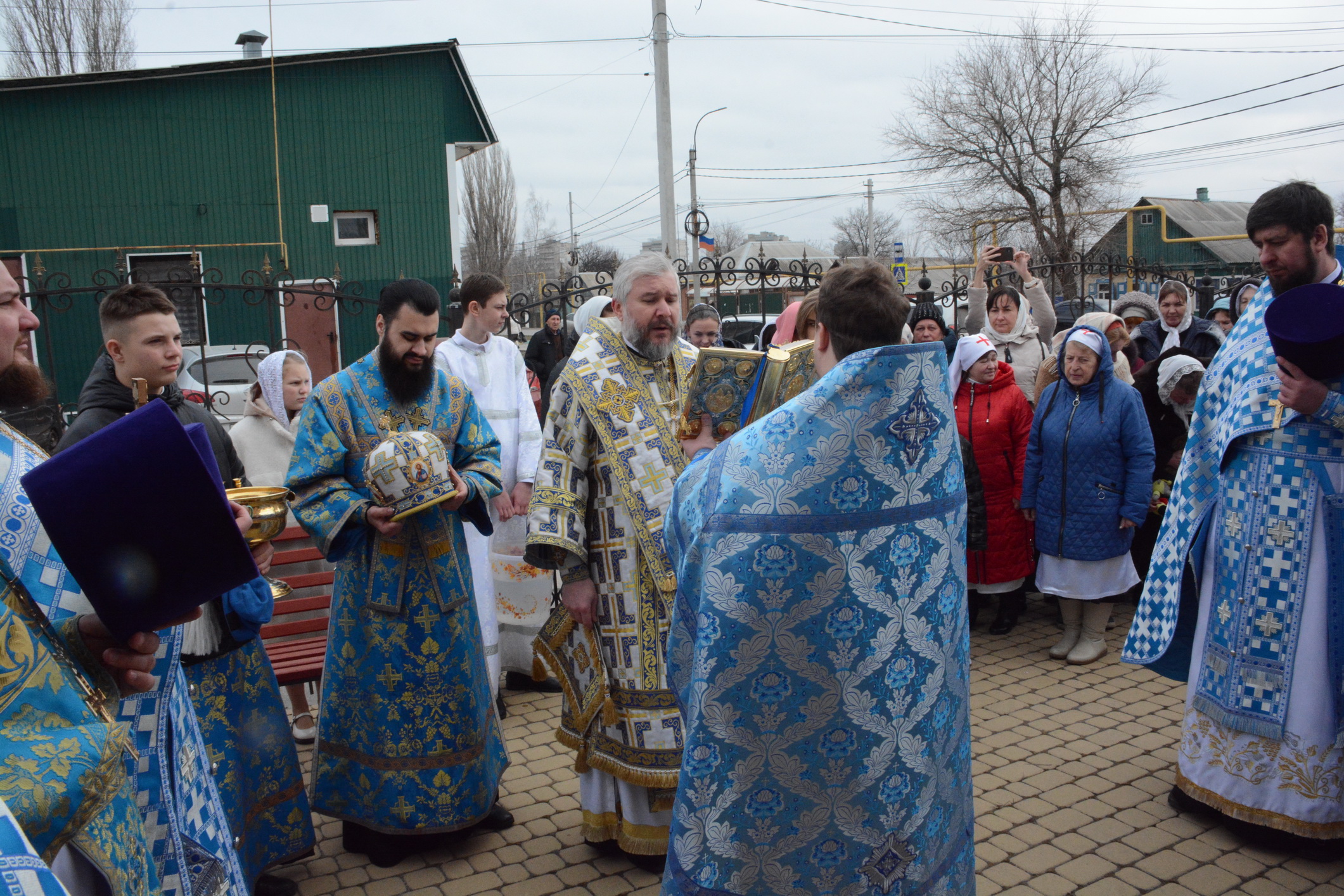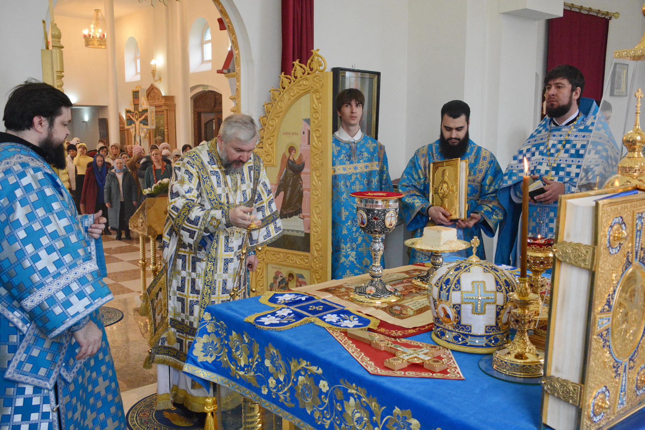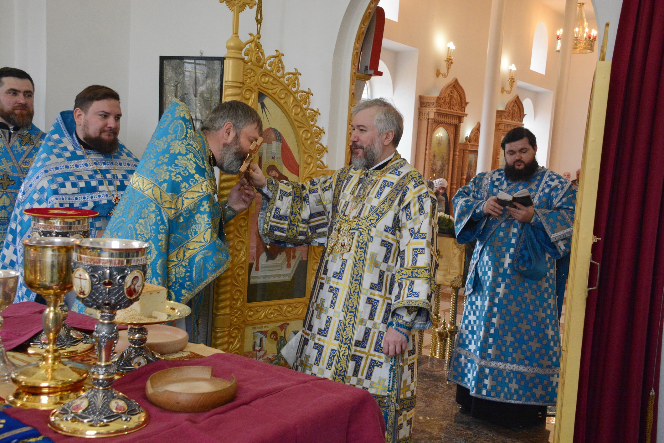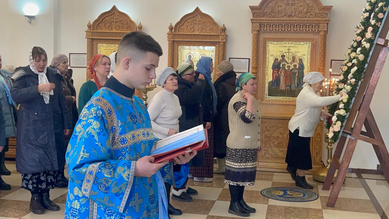 Его Преосвященству сослужили настоятель храма иерей Владимир Татаркин, настоятель храма святой Блаженной Матроны Московской г. Донецка протоиерей Александр Барановский, настоятель Донецкого Успенского архиерейского подворья ст. Гундоровской протоиерей Глеб Гладышев, настоятель храма святителя Николая Чудотворца пос. Аюта иерей Иоанн Трофимов, настоятель храма Одигитриевской иконы Божией Матери пос. Таловый иерей Андрей Ковалев, настоятель храма Успения Пресвятой Богородицы ст. Калитвенской иерей Игорь Лосев, иерей Михаил Дубянский и диакон Трофим Осяк.