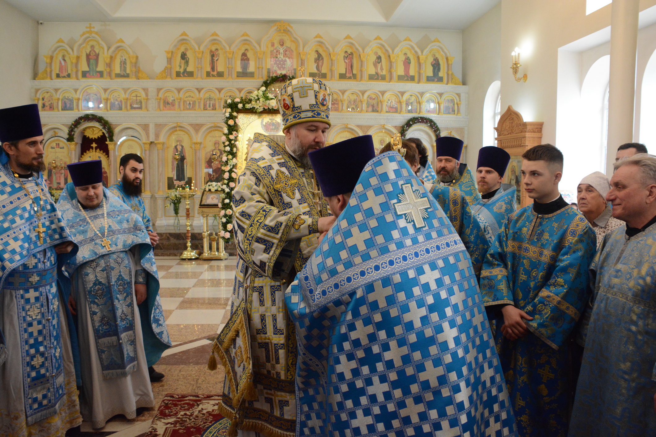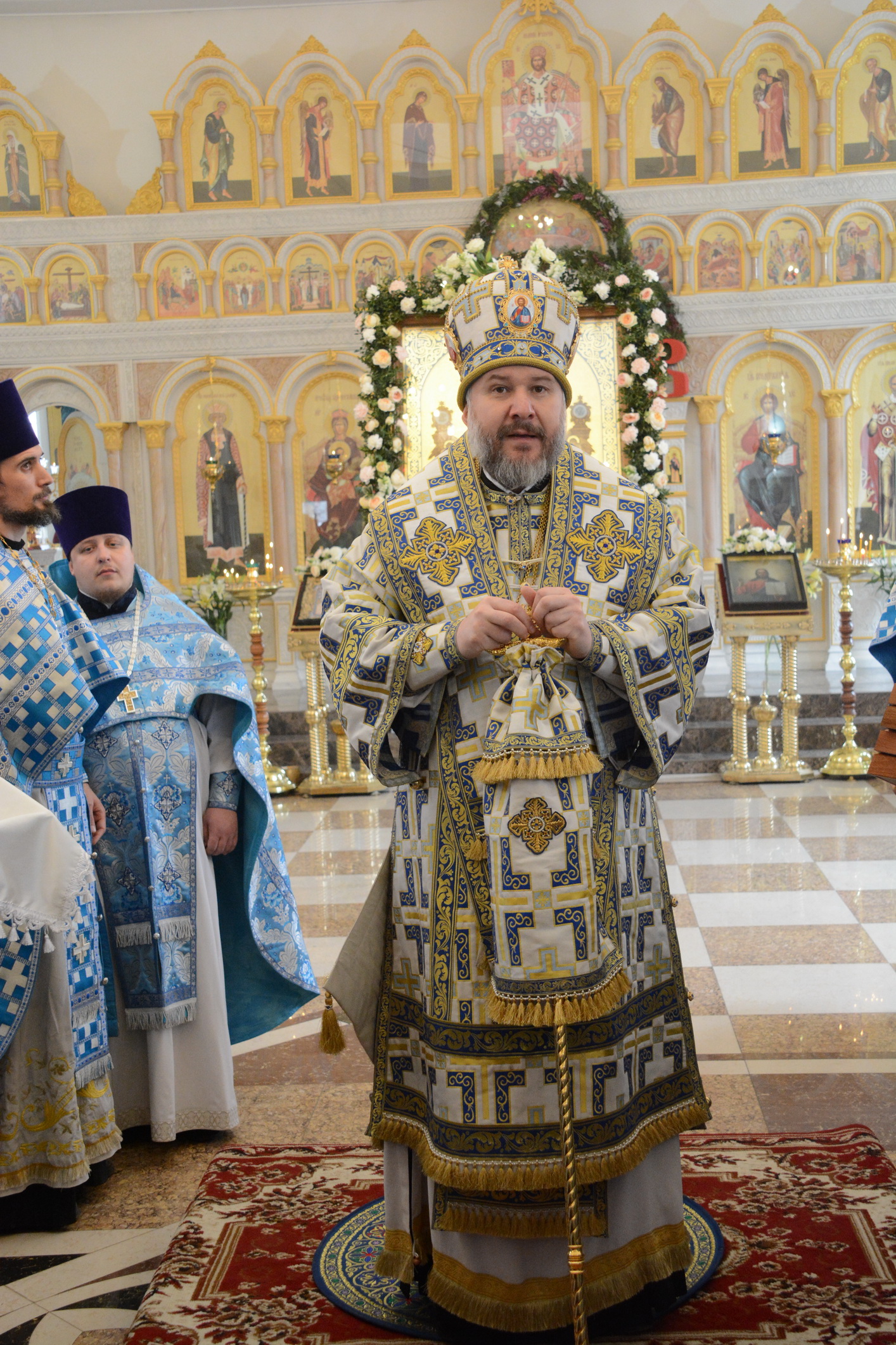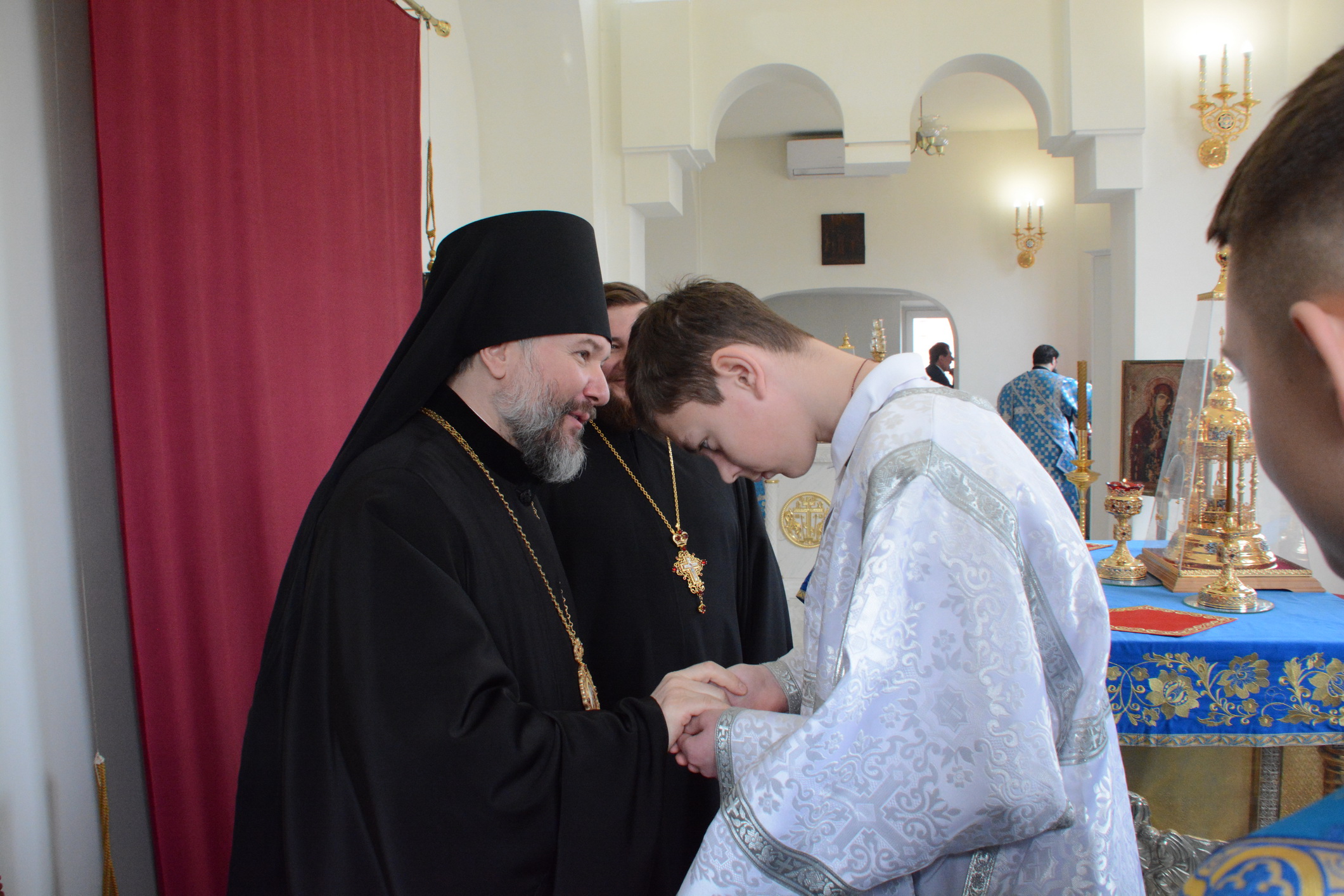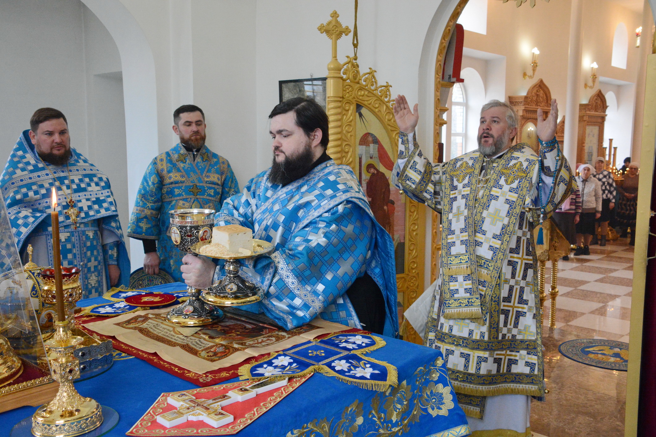 Его Преосвященству сослужили настоятель храма иерей Владимир Татаркин, настоятель храма святой Блаженной Матроны Московской г. Донецка протоиерей Александр Барановский, настоятель Донецкого Успенского архиерейского подворья ст. Гундоровской протоиерей Глеб Гладышев, настоятель храма святителя Николая Чудотворца пос. Аюта иерей Иоанн Трофимов, настоятель храма Одигитриевской иконы Божией Матери пос. Таловый иерей Андрей Ковалев, настоятель храма Успения Пресвятой Богородицы ст. Калитвенской иерей Игорь Лосев, иерей Михаил Дубянский и диакон Трофим Осяк.
