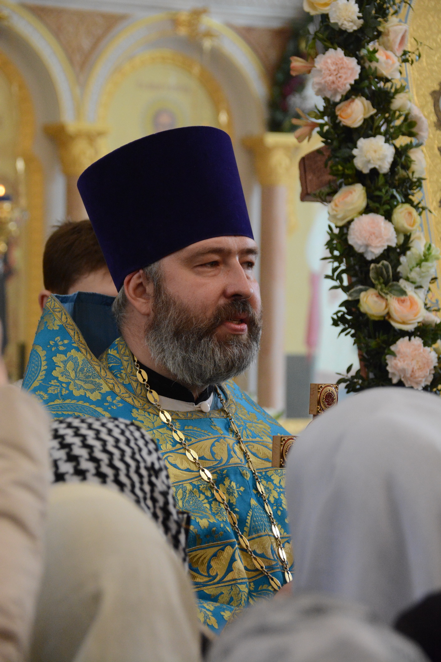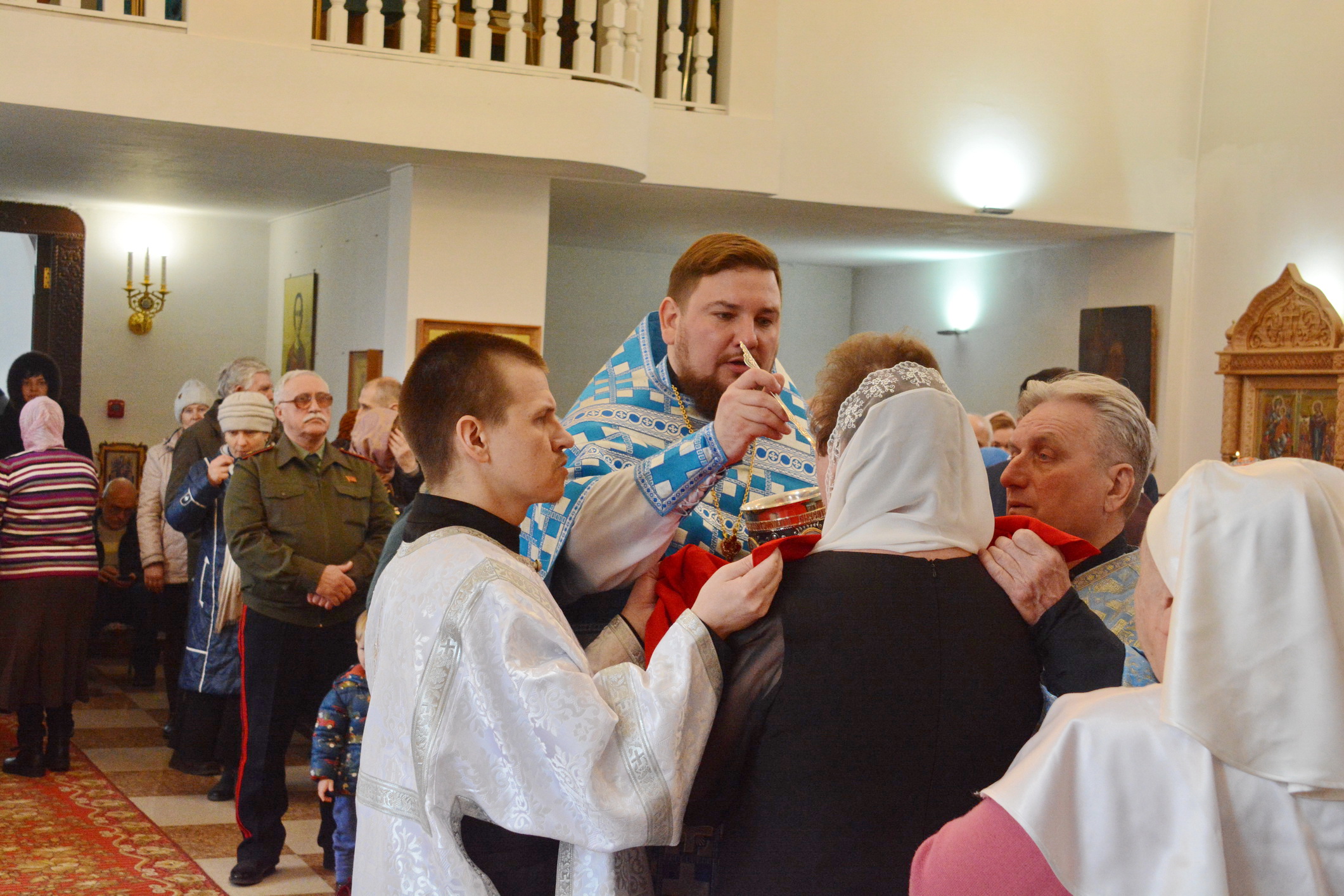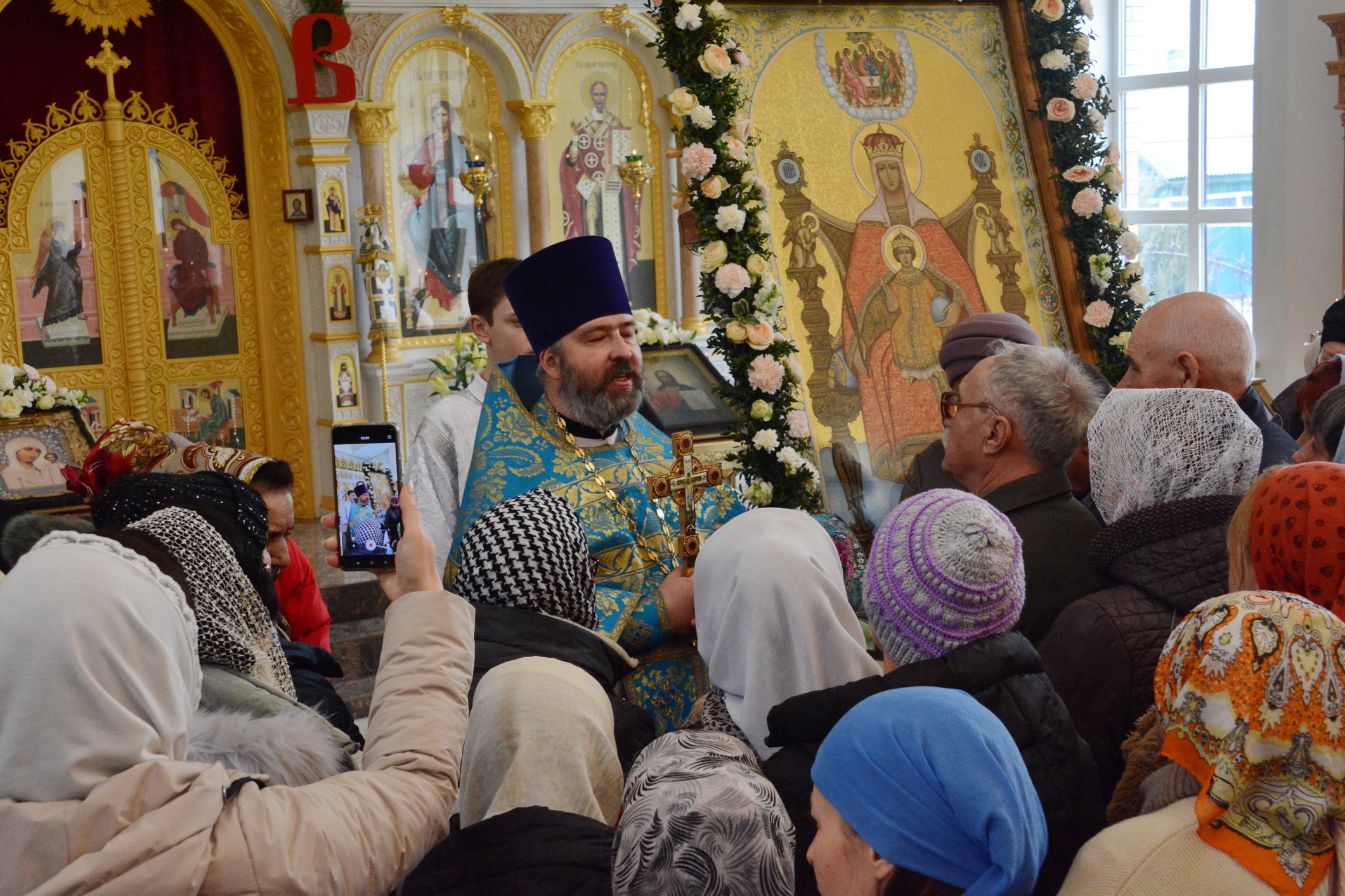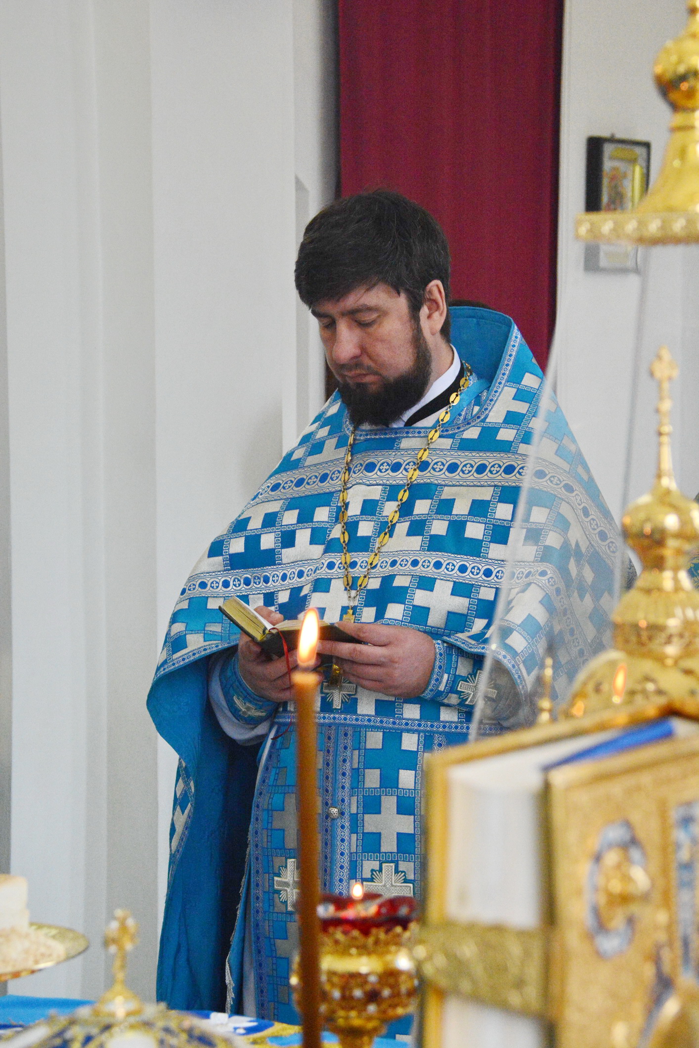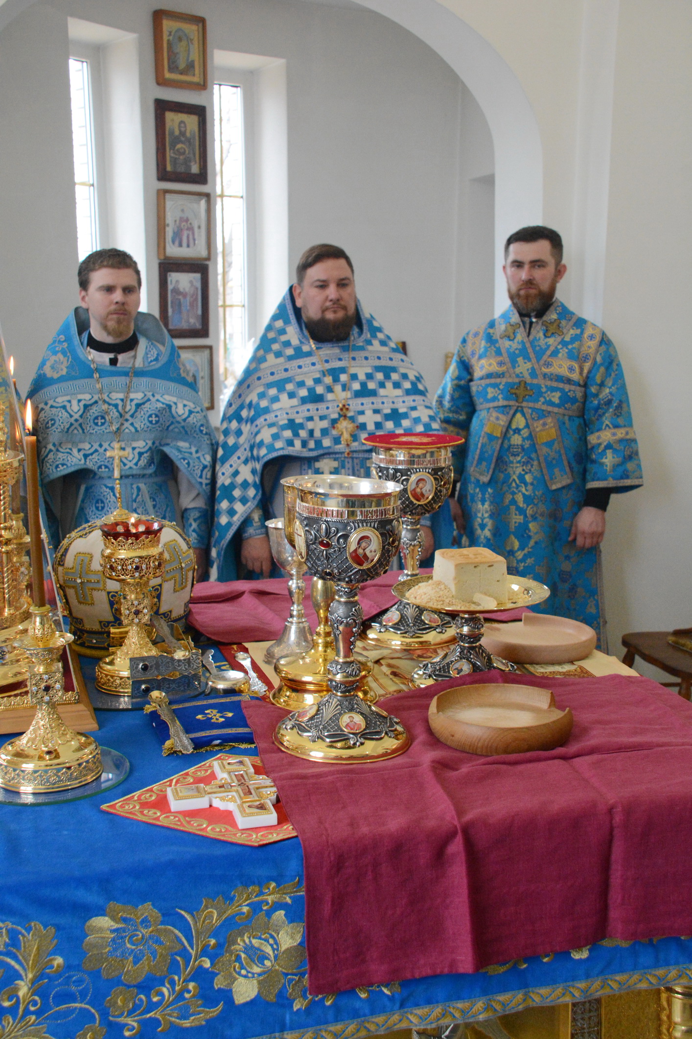 Его Преосвященству сослужили настоятель храма иерей Владимир Татаркин, настоятель храма святой Блаженной Матроны Московской г. Донецка протоиерей Александр Барановский, настоятель Донецкого Успенского архиерейского подворья ст. Гундоровской протоиерей Глеб Гладышев, настоятель храма святителя Николая Чудотворца пос. Аюта иерей Иоанн Трофимов, настоятель храма Одигитриевской иконы Божией Матери пос. Таловый иерей Андрей Ковалев, настоятель храма Успения Пресвятой Богородицы ст. Калитвенской иерей Игорь Лосев, иерей Михаил Дубянский и диакон Трофим Осяк.