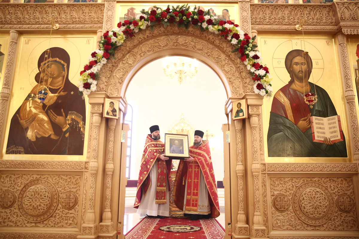 Под пение тропаря и кондака святому из алтаря соборного храма изнесена икона священномученика Константина Верецкого.