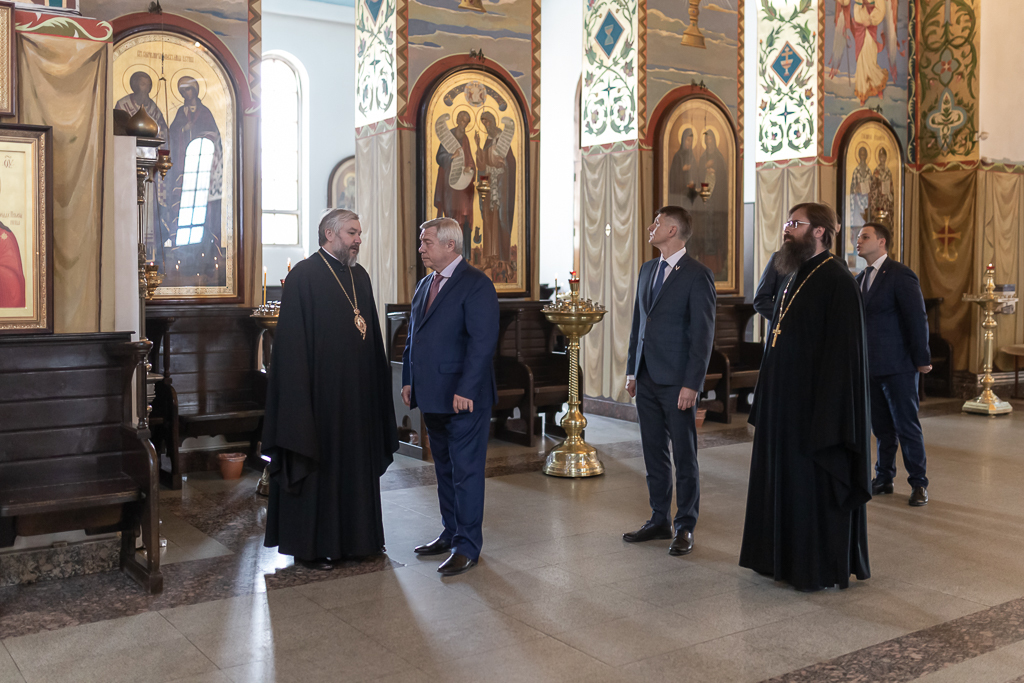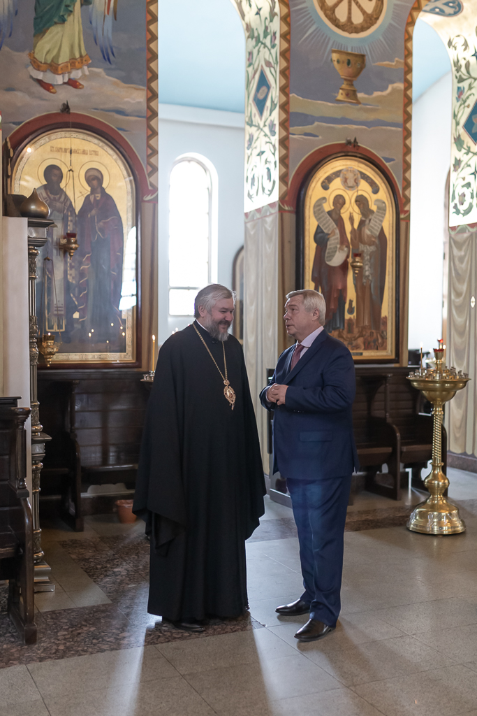 Далее общение продолжилось в Епархиальном управлении, где Василий Юрьевич, Андрей Владимирович и епископ Симон обсудили те вопросы, в рамках которых может осуществляться церковно-государственное взаимодействие: социальная сфера, помощь беженцам Донбасса, окормление постояльцев медучреждений и духовно-нравственное воспитание.