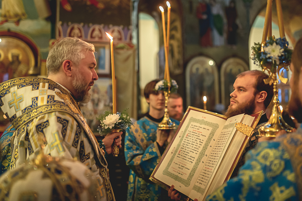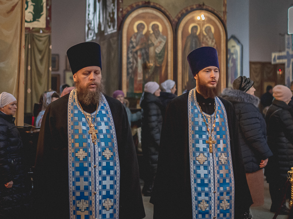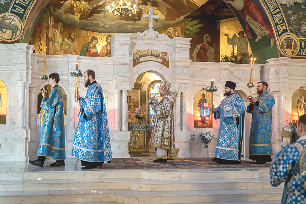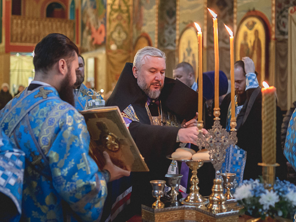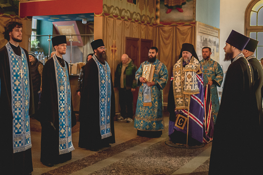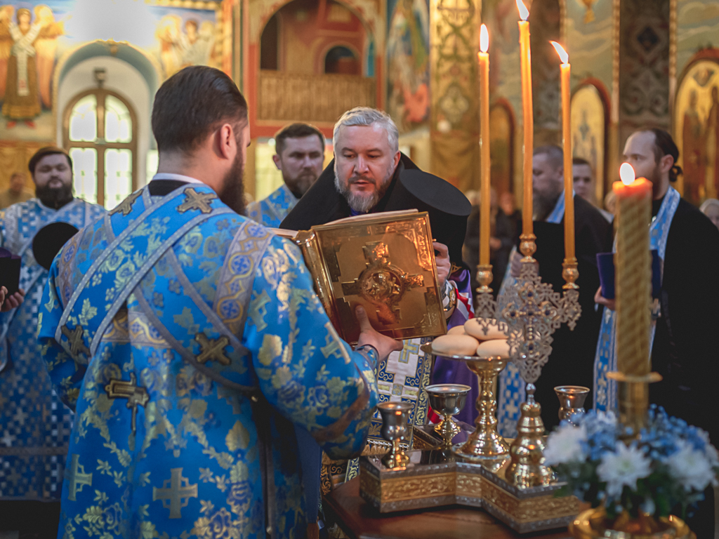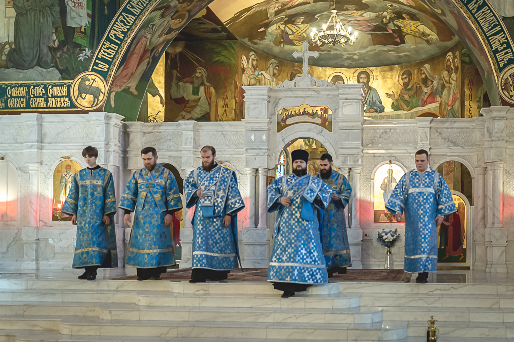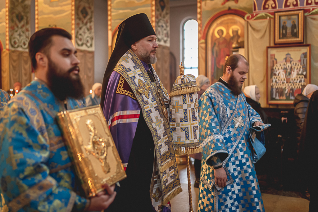 Его Преосвященству сослужили настоятель и духовенство собора: иерей Александр Теличкин, протоирей Роман Бирюков, иерей Даниил Зырянов, иерей Олег Брехов, иерей Михаил Дубянский, диакон Трофим Осяк, диакон Никита Осипов и диакон Вячеслав Иващенко.