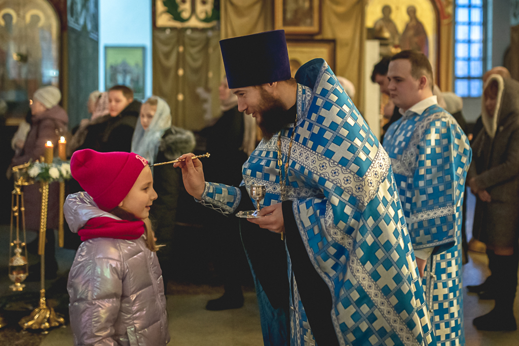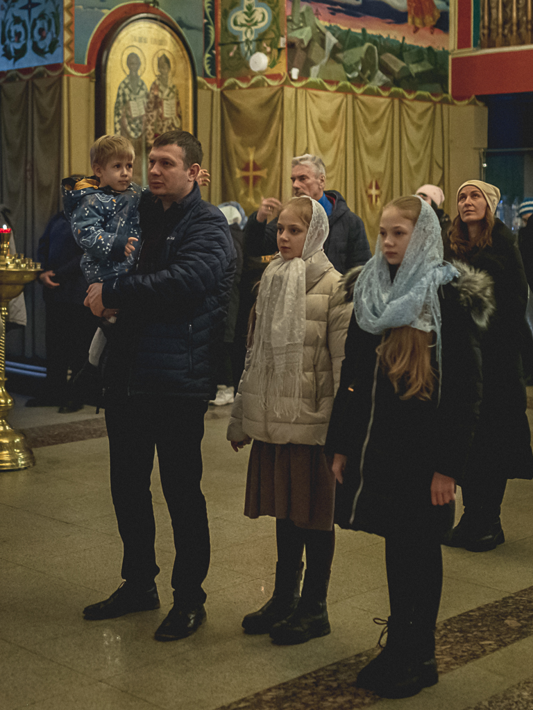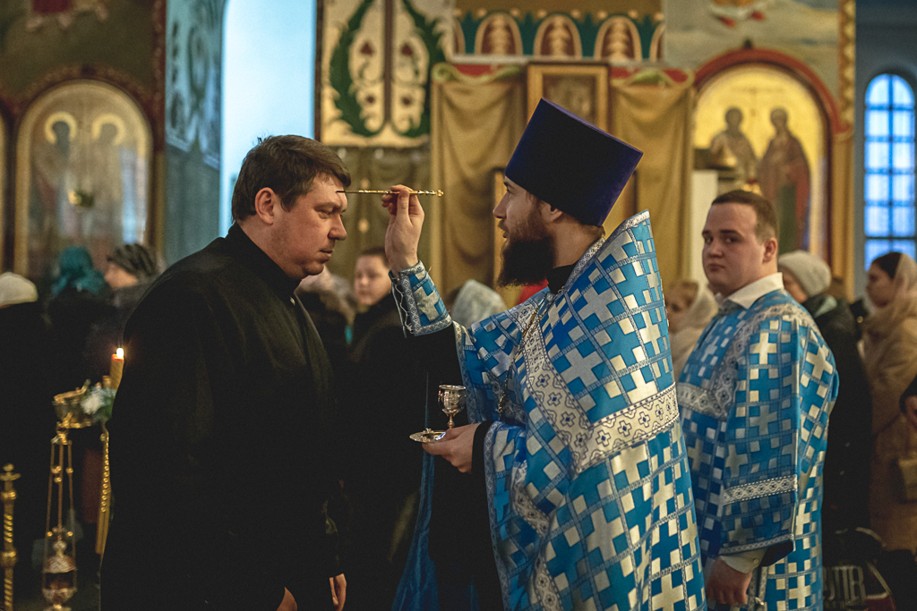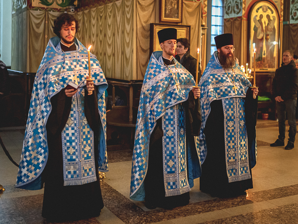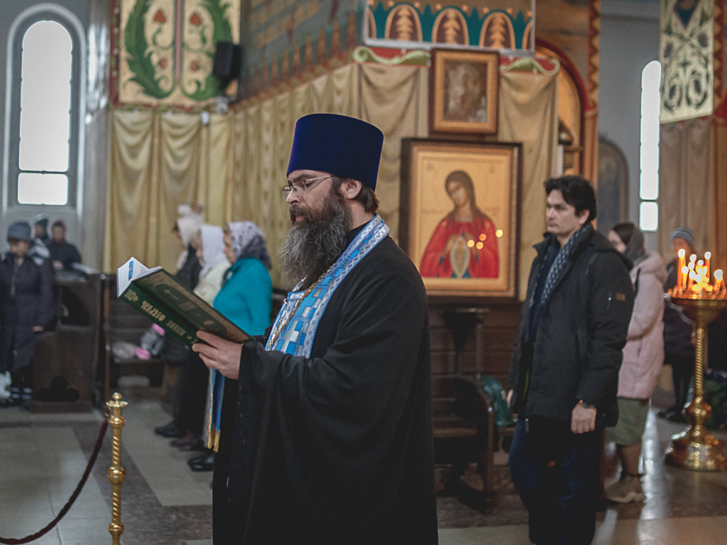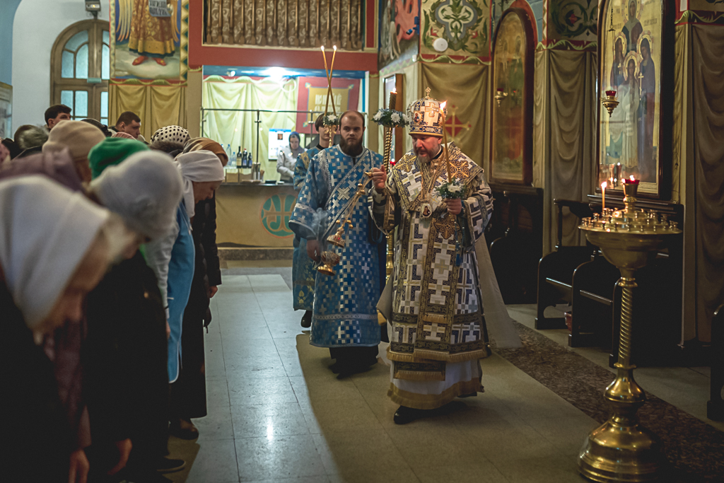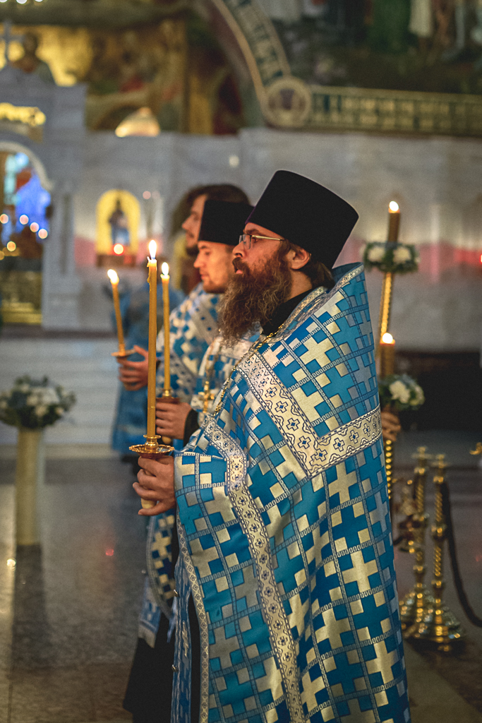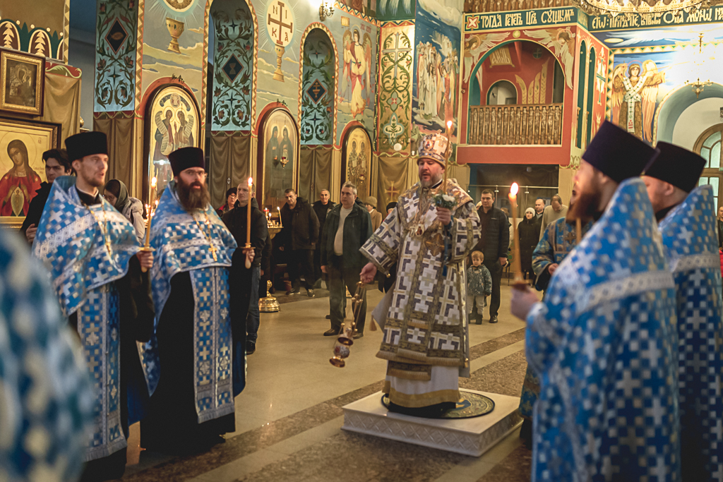 Его Преосвященству сослужили настоятель и духовенство собора: иерей Александр Теличкин, протоирей Роман Бирюков, иерей Даниил Зырянов, иерей Олег Брехов, иерей Михаил Дубянский, диакон Трофим Осяк, диакон Никита Осипов и диакон Вячеслав Иващенко.