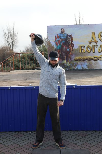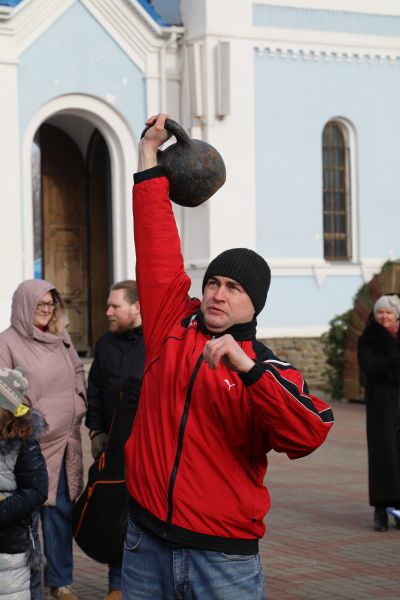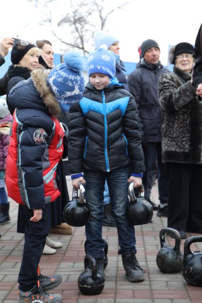 Затем участникам были предложены соревнования. Свою силу испытали девочки, они выполняли упражнение с весом 8 килограмм. Далее юноши, а затем и взрослые участники.