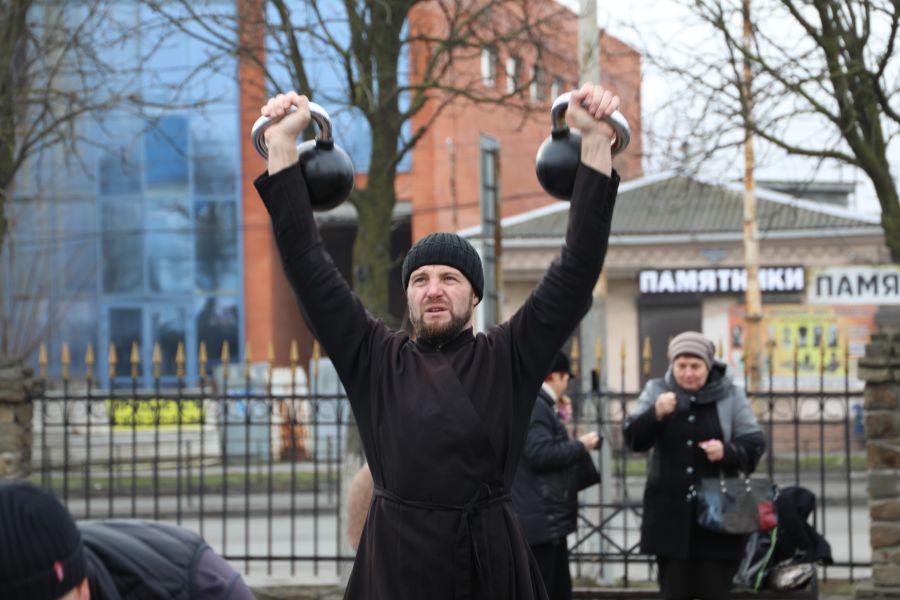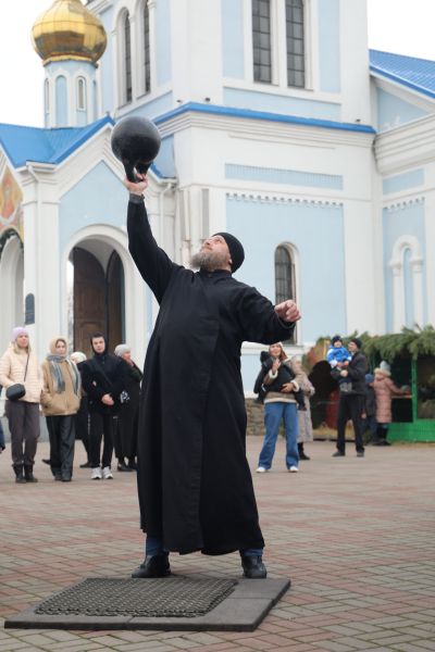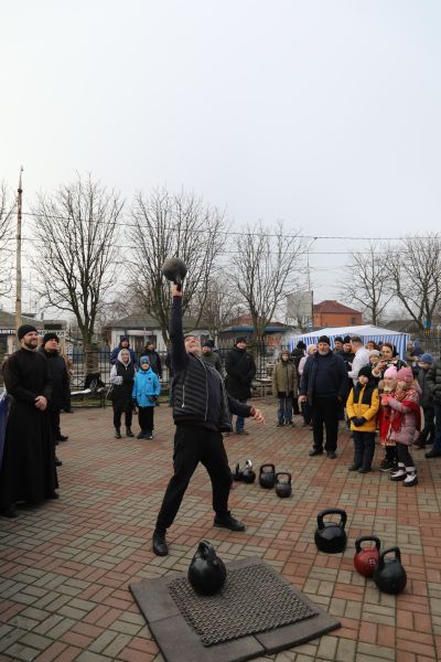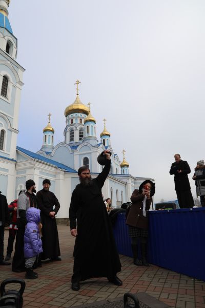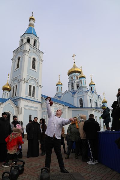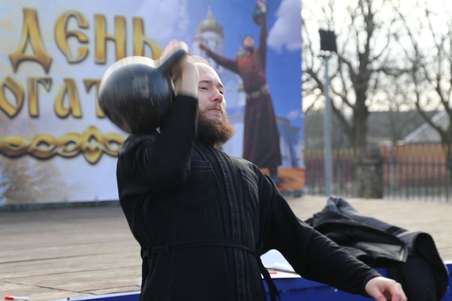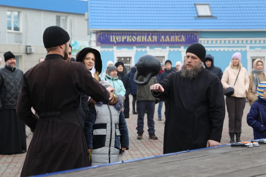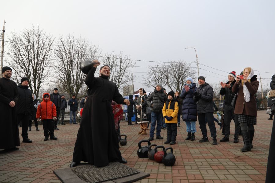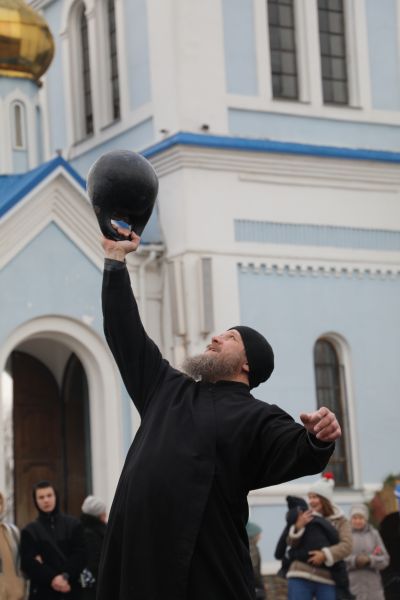 Программа началась с показательных выступлений. Свою силу показали алтарники и священники Шахтинской епархии, активно поддерживающие здоровый образ жизни. На сцене Соборной площади были продемонстрированы упражнения и техники поднятия тяжелых весов.