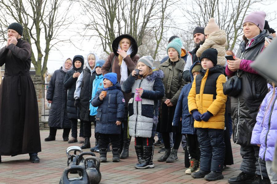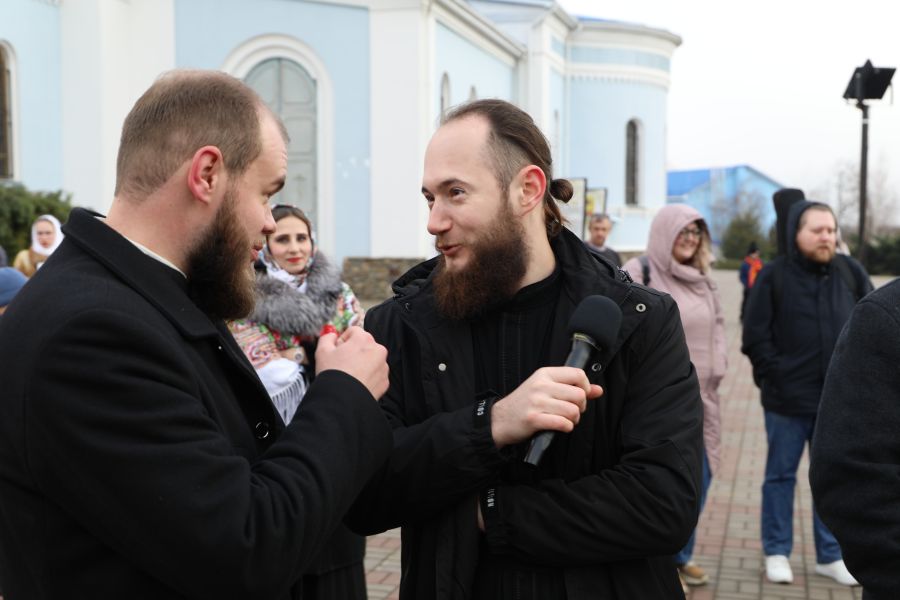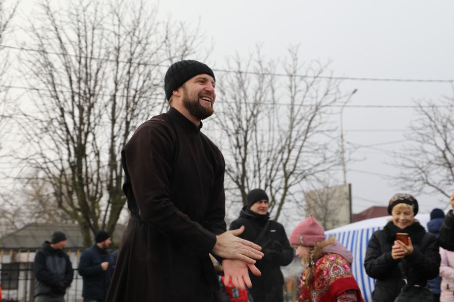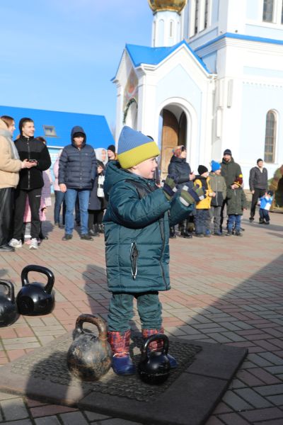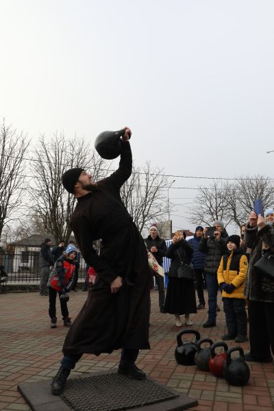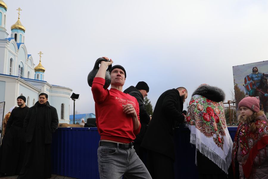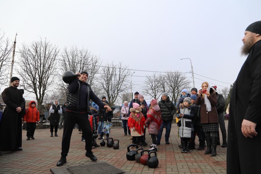 Программа началась с показательных выступлений. Свою силу показали алтарники и священники Шахтинской епархии, активно поддерживающие здоровый образ жизни. На сцене Соборной площади были продемонстрированы упражнения и техники поднятия тяжелых весов.