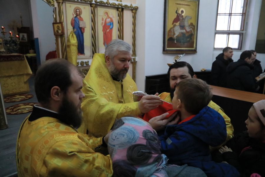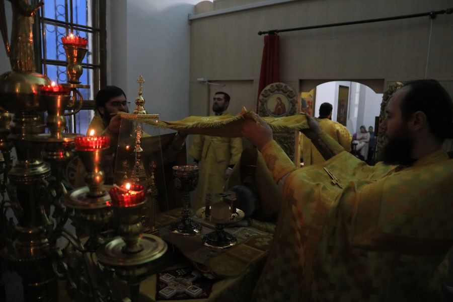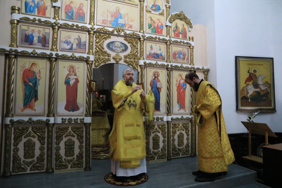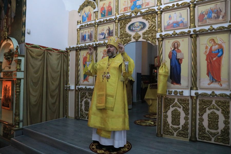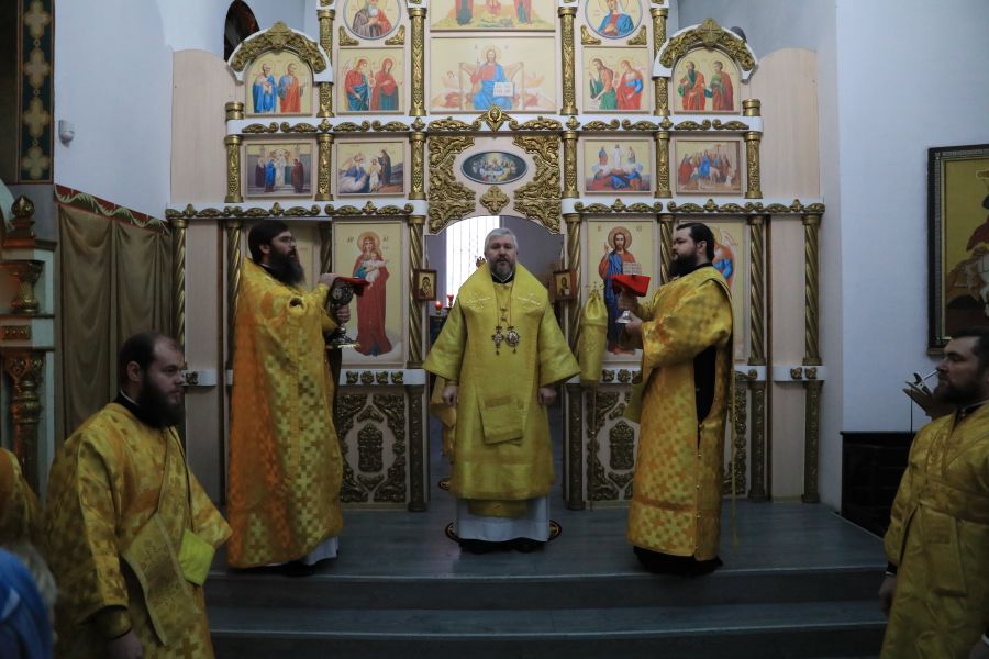 Его Преосвященству сослужили настоятель собора иерей Александр Теличкин, иерей Олег Брехов, диакон Трофим Осяк и диакон Никита Осипов.