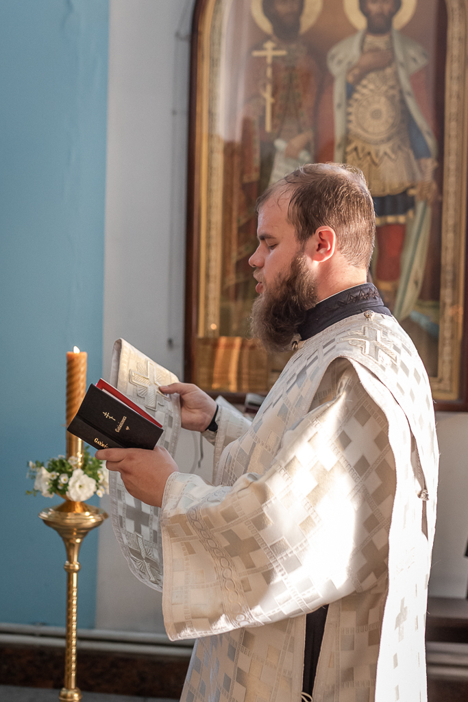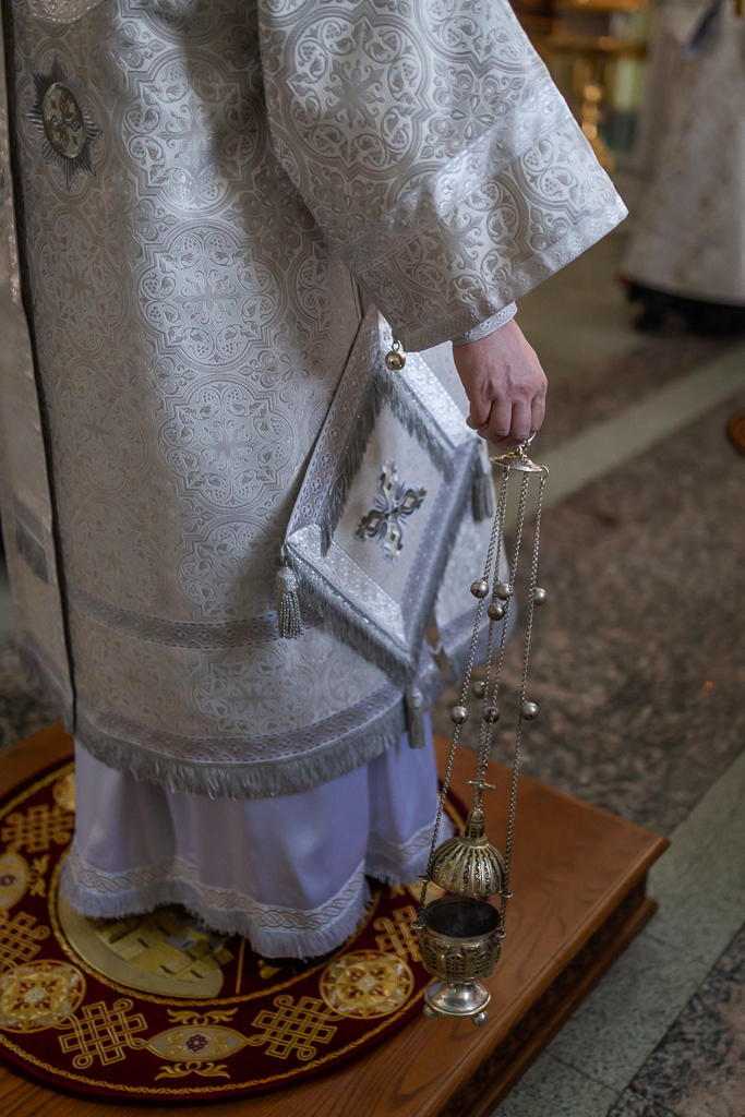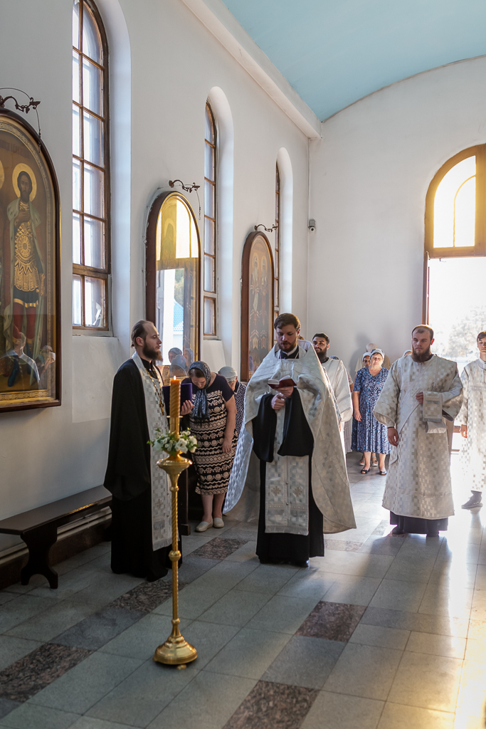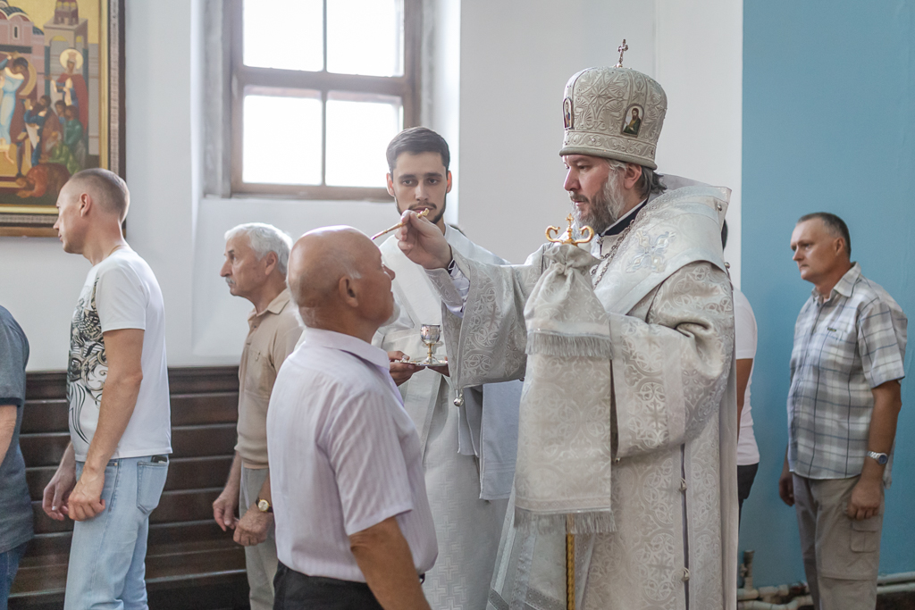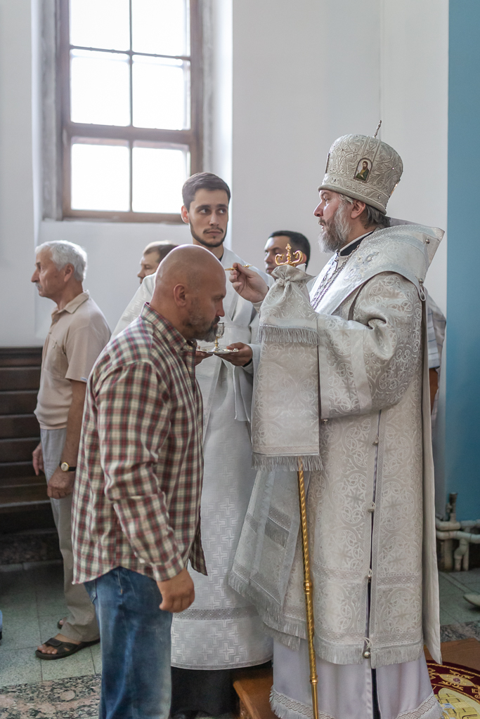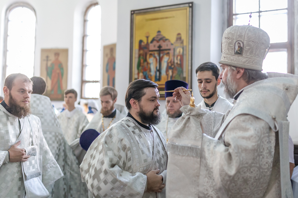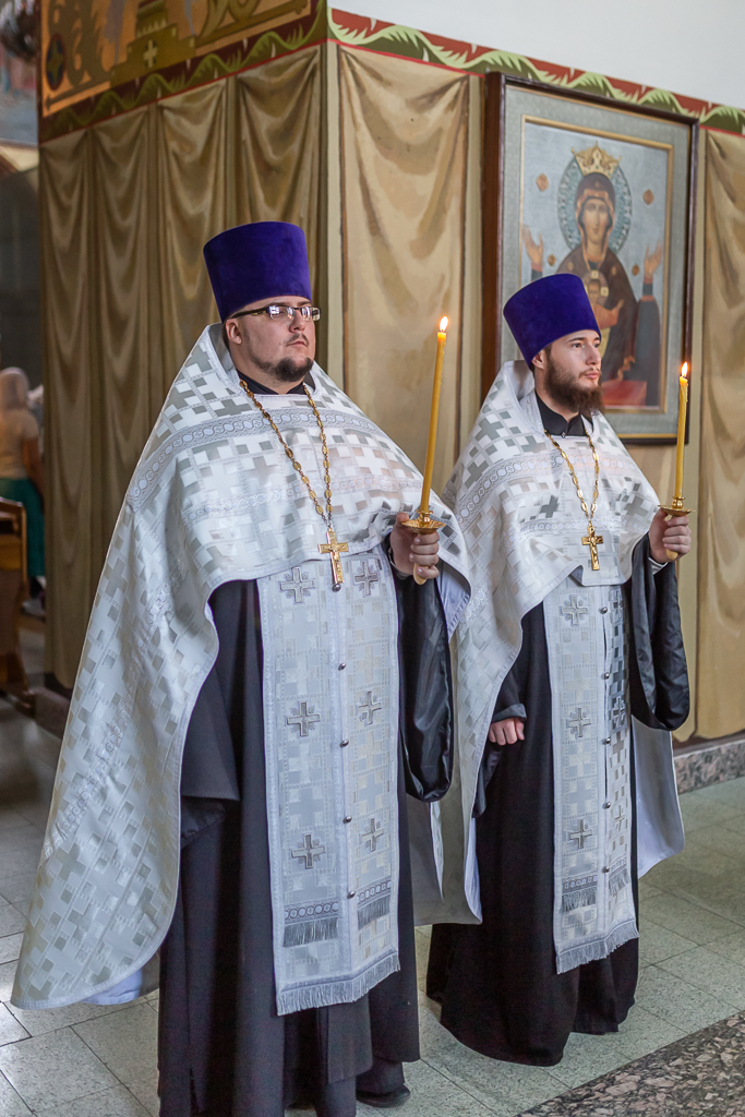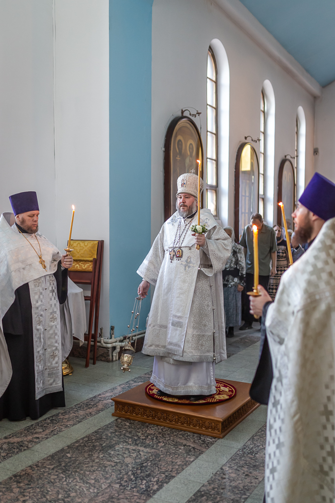 Его Преосвященству сослужили протоиерей Роман Бирюков, иерей Николай Налеткин, иерей Даниил Зырянов, иерей Олег Брехов, иерей Димитрий Галицкий, диакон Трофим Осяк, диакон Никита Осипов и диакон Михаил Дубянский.