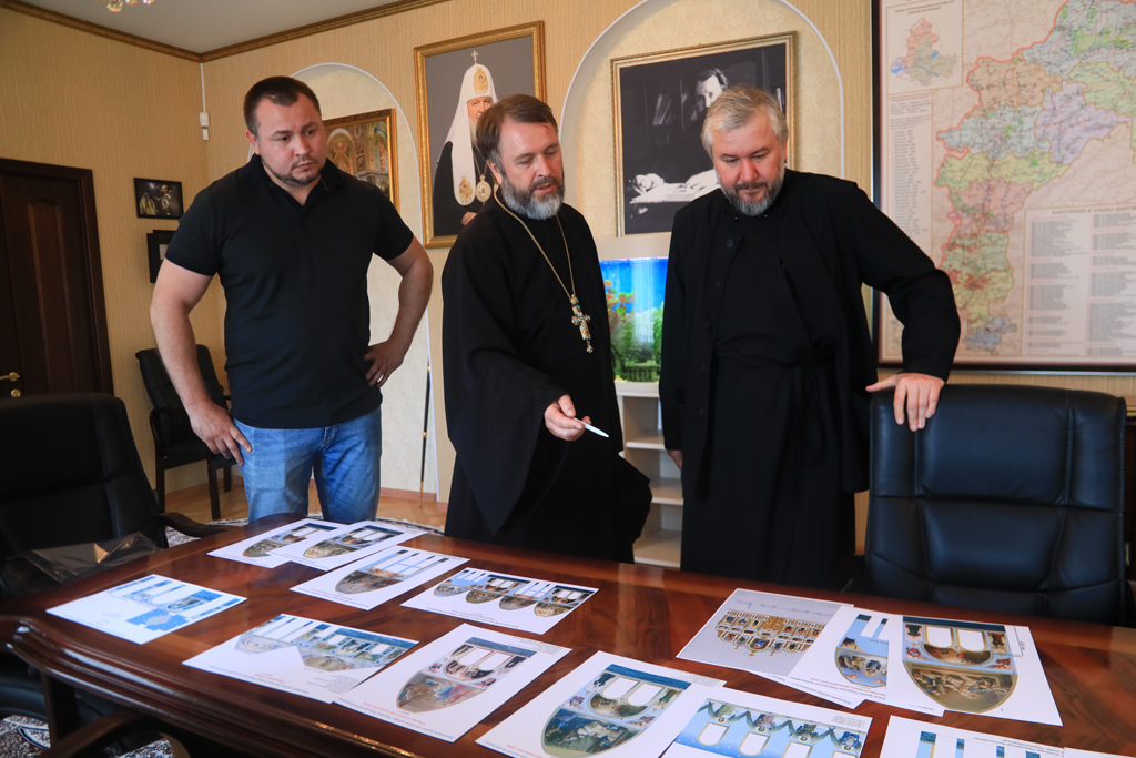 Преосвященнейший епископ Симон и благочинный приходов Багаевского округа обсудили проект росписи храма Покрова Богородицы хутора Карповка