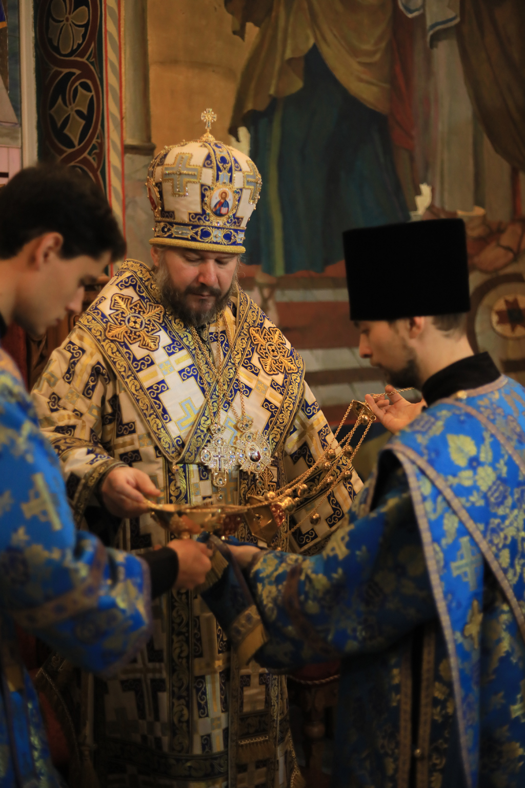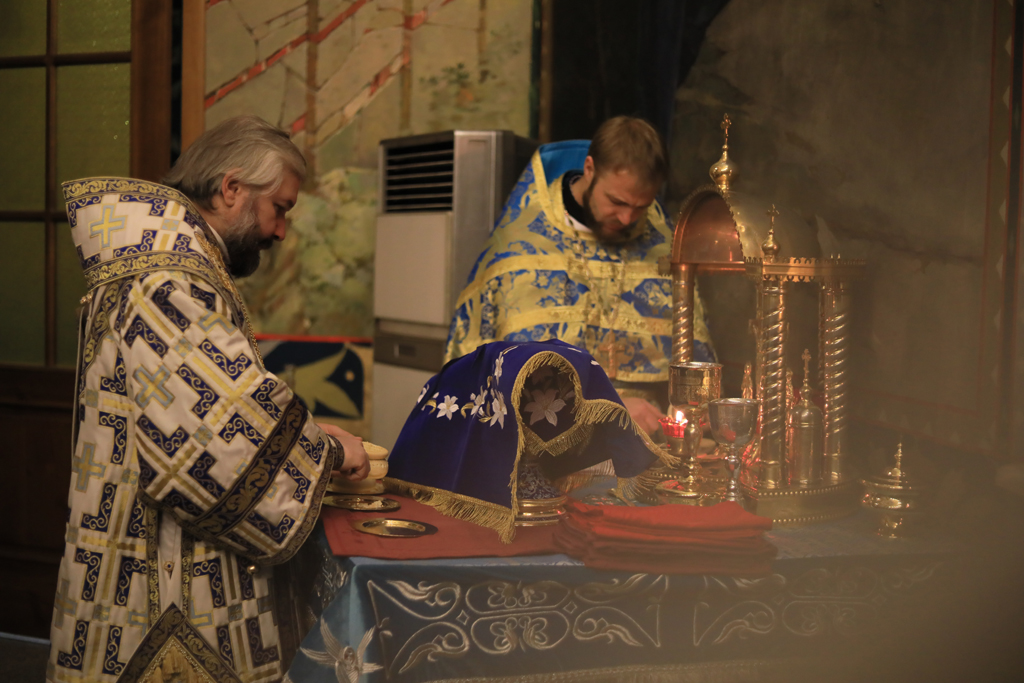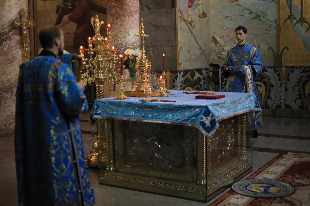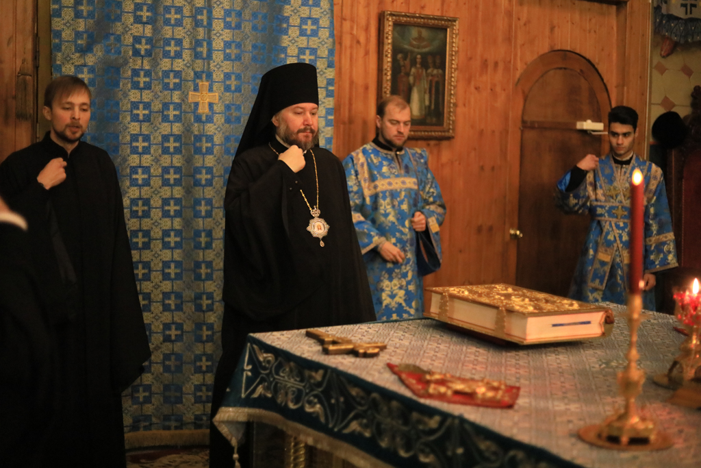 Его Преосвященству сослужили настоятель Покровского кафедрального собора иерей Александр Теличкин, духовенство собора иерей Леонид Зацепилин, иеродиакон Флавиан (Васильев), диакон Вадим Ефимов.