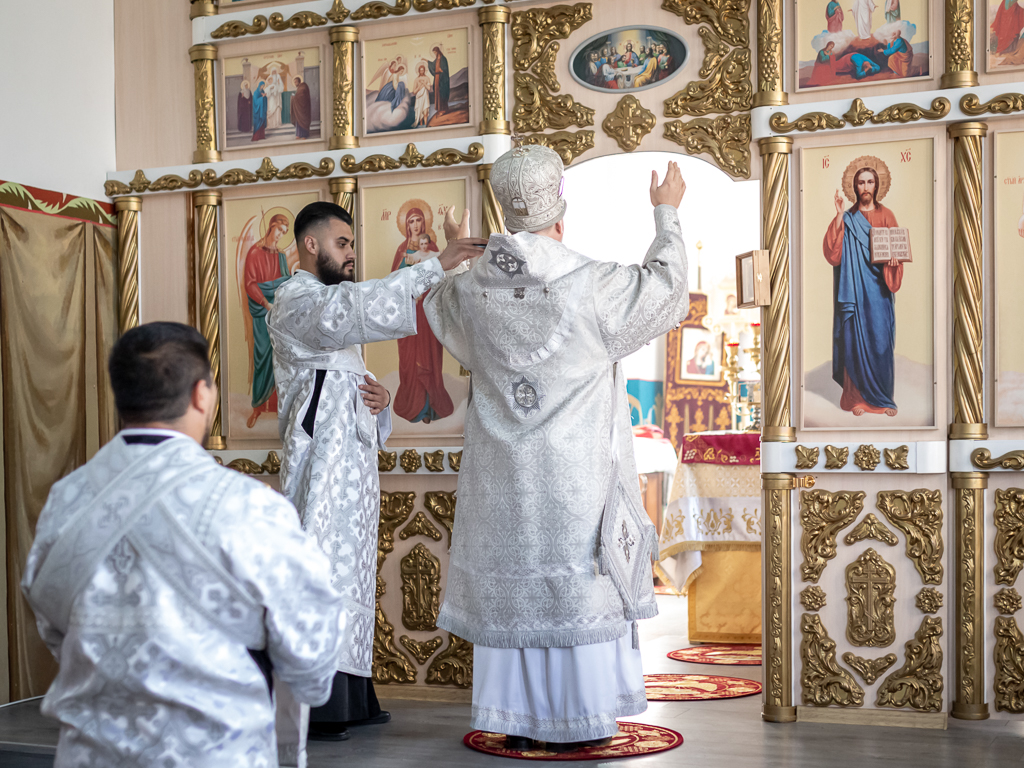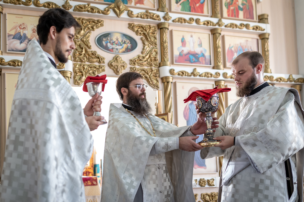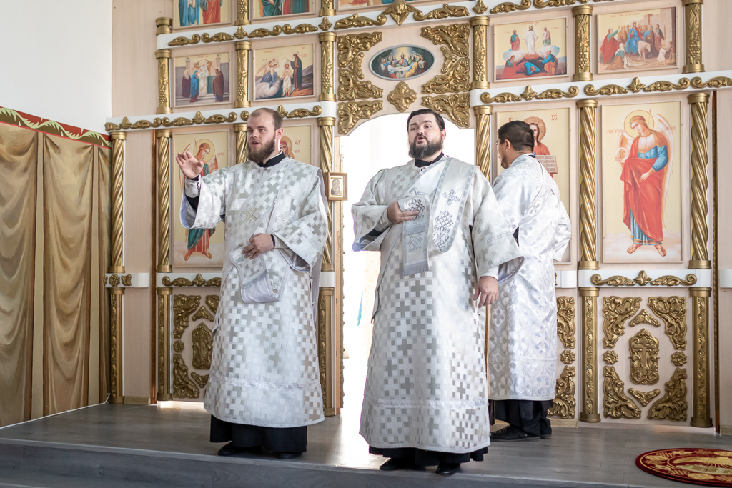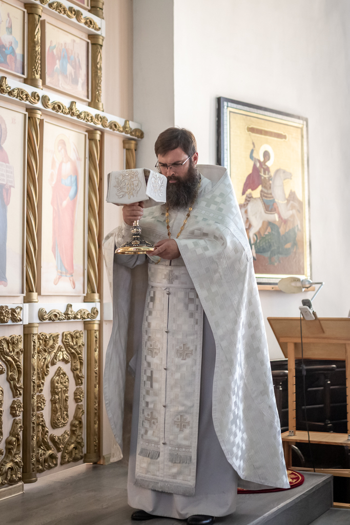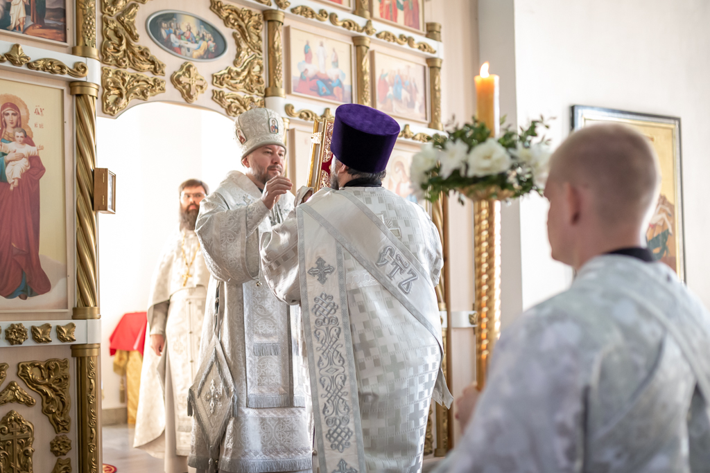Его Преосвященству сослужили настоятель собора иерей Александр Теличкин, иерей Михаил Дубянский, диакон Трофим Осяк, диакон Никита Осипов.